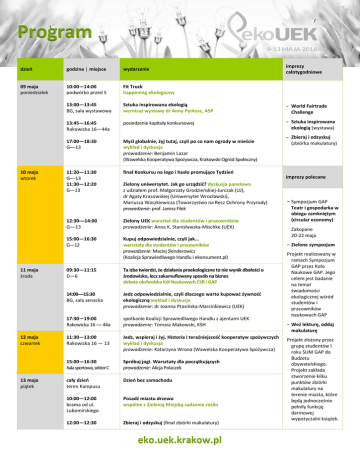 Program imprezy całotygodniowe dzień godzina │ miejsce wydarzenie 09 maja poniedziałek 10:00―14:00 podwórko przed S Fit Truck happening ekologiczny 13:00―13:45 BG, sala wystawowa Sztuka inspirowana ekologią wernisaż wystawy dr Anny Pyrkosz, ASP − World Fairtrade Challenge 13:45―16:45 Rakowicka 16―44a posiedzenie kapituły konkursowej − Sztuka inspirowana ekologią (wystawa) 17:00―18:30 G—13 Myśl globalnie, żyj tutaj, czyli po co nam ogrody w mieście wykład i dyskusja prowadzenie: Benjamin Lazar (Wawelska Kooperatywa Spożywcza, Krakowski Ogród Społeczny) 11:20―11:30 G—13 11:30―12:20 G―13 finał Konkursu na logo i hasło promujące Tydzień 10 maja wtorek 11 maja środa 12 maja czwartek 13 maja piątek Zielony uniwersytet. Jak go urządzić? dyskusja panelowa z udziałem prof. Małgorzaty Grodzieńskiej-Jurczak (UJ), dr Agaty Krasowskiej (Uniwersytet Wrocławski), Mariusza Waszkiewicza (Towarzystwo na Recz Ochrony Przyrody) prowadzenie: prof. Janina Filek 12:30—14:00 G—13 Zielony UEK warsztat dla studentów i pracowników prowadzenie: Anna K. Stanisławska-Mischke (UEK) 15:00―16:30 G―12 Kupuj odpowiedzialnie, czyli jak… warsztaty dla studentów i pracowników prowadzenie: Maciej Skinderowicz (Koalicja Sprawiedliwego Handlu i ekonsument.pl) 09:30―11:15 D―6 Ta izba twierdzi, że działania proekologiczne to nie wynik dbałości o środowisko, lecz zakamuflowany sposób na biznes debata oksfordzka Kół Naukowych CSR i GAP 14:00—15:30 BG, sala senacka Jedz odpowiedzialnie, czyli dlaczego warto kupować żywność ekologiczną wykład i dyskusja prowadzenie: dr Joanna Ptasińska-Marcinkiewicz (UEK) 17:30―19:00 Rakowicka 16 — 44a spotkanie Koalicji Sprawiedliwego Handlu z ajentami UEK prowadzenie: Tomasz Makowski, KSH 11:30―13:00 Rakowicka 16 ― 13 Jedz, wspieraj i żyj. Historia i teraźniejszość kooperatyw spożywczych wykład i dyskusja prowadzenie: Katarzyna Wrona (Wawelska Kooperatywa Spożywcza) 15:00―16:30 hala sportowa, sektor C Spróbuj jogi. Warsztaty dla początkujących prowadzenie: Alicja Polaczek cały dzień teren Kampusu Dzień bez samochodu 10:00―12:00 brama od ul. Lubomirskiego Posadź miastu drzewo wspólne z Zielenią Miejską sadzenie roślin 12:00―12:30 Zbieraj i odzyskuj (finał zbiórki makulatury) eko.uek.krakow.pl − Zbieraj i odzyskuj (zbiórka makulatury) imprezy polecane − Sympozjum GAP Teatr i gospodarka w obiegu zamkniętym (circular economy) Zakopane 20-22 maja − Zielone sympozjum Projekt realizowany w ramach Sympozjum GAP przez Koło Naukowe GAP. Jego celem jest badanie na temat świadomości ekologicznej wśród studentów i pracowników naukowych GAP − Weź lekturę, oddaj makulaturę Projekt złożony przez grupę studentów I roku SUM GAP do Budżetu obywatelskiego. Projekt zakłada stworzenie kilku punktów zbiórki makulatury na terenie miasta, które będą jednocześnie pełniły funkcję darmowej wypożyczalni książek.