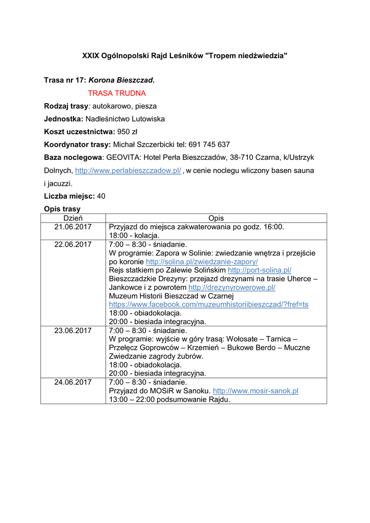 XXIX Ogólnopolski Rajd Leśników "Tropem niedźwiedzia" Trasa nr 17: Korona Bieszczad. TRASA TRUDNA Rodzaj trasy: autokarowo, piesza Jednostka: Nadleśnictwo Lutowiska Koszt uczestnictwa: 950 zł Koordynator trasy: Michał Szczerbicki tel: 691 745 637 Baza noclegowa: GEOVITA: Hotel Perła Bieszczadów, 38-710 Czarna, k/Ustrzyk Dolnych, http://www.perlabieszczadow.pl/ , w cenie noclegu wliczony basen sauna i jacuzzi. Liczba miejsc: 40 Opis trasy Dzień 21.06.2017 22.06.2017 23.06.2017 24.06.2017 Opis Przyjazd do miejsca zakwaterowania po godz. 16:00. 18:00 - kolacja. 7:00 – 8:30 - śniadanie. W programie: Zapora w Solinie: zwiedzanie wnętrza i przejście po koronie http://solina.pl/zwiedzanie-zapory/ Rejs statkiem po Zalewie Solińskim http://port-solina.pl/ Bieszczadzkie Drezyny: przejazd drezynami na trasie Uherce – Jankowce i z powrotem http://drezynyrowerowe.pl/ Muzeum Historii Bieszczad w Czarnej https://www.facebook.com/muzeumhistoriibieszczad/?fref=ts 18:00 - obiadokolacja. 20:00 - biesiada integracyjna. 7:00 – 8:30 - śniadanie. W programie: wyjście w góry trasą: Wołosate – Tarnica – Przełęcz Goprowców – Krzemień – Bukowe Berdo – Muczne Zwiedzanie zagrody żubrów. 18:00 - obiadokolacja. 20:00 - biesiada integracyjna. 7:00 – 8:30 - śniadanie. Przyjazd do MOSiR w Sanoku. http://www.mosir-sanok.pl 13:00 – 22:00 podsumowanie Rajdu. Lutowiska, 17: Korona Bieszczad. https://drive.google.com/open?id=1nPYcpeuJE436XxW2ongvGLp_a0E&usp=sharing