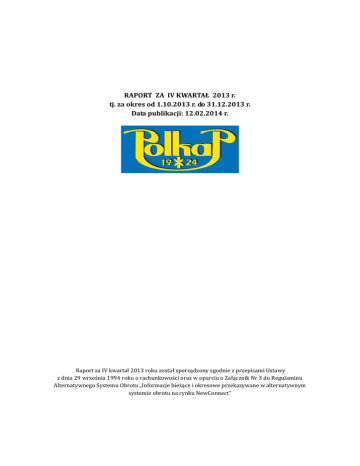 RAPORT ZA IV KWARTAŁ 2013 r. tj. za okres od 1.10.2013 r. do 31.12.2013 r. Data publikacji: 12.02.2014 r. Raport za IV kwartał 2013 roku został sporządzony zgodnie z przepisami Ustawy z dnia 29 września 1994 roku o rachunkowości oraz w oparciu o Załącznik Nr 3 do Regulaminu Alternatywnego Systemu Obrotu „Informacje bieżące i okresowe przekazywane w alternatywnym systemie obrotu na rynku NewConnect" Raport okresowy za IV kwartał 2013 r. Spis treści I. II. III. IV. V. PODSTAWOWE INFORMACJE O EMITENCIE, W TYM OPIS AKCJONARIATU OŚWIADCZENIE ZARZĄDU INFORMACJE O ZASADACH PRZYJĘTYCH PRZY SPORZĄDZANIU RAPORTU SKRÓCONE SPRAWOZDANIE FINANSOWE CHARAKTERYSTYKA DOKONAŃ I NIEPOWODZEŃ WRAZ Z OPISEM CZYNNIKÓW I ZDARZEŃ MAJĄCYCH WPŁYW NA OSIĄGNIĘTE WYNIKI VI. PROGNOZY FINANSOWE – STANOWISKO VII. OPIS ORGANIZACJI GRUPY KAPITAŁOWEJ I KONSOLIDACJA –ODNIESIENIE VIII. INFORMACJE NA TEMAT AKTYWNOŚCI W OBSZARZE ROZWIĄZAŃ INNOWACYJNYCH WPROWADZANYCH W PRZEDSIĘBIORSTWIE IX. INFORMACJA DOTYCZĄCA LICZBY OSÓB ZATRUDNIONYCH PRZEZ EMITENTA, W PRZELICZENIU NA PEŁNE ETATY X. OPIS STANU REALIZACJI DZIAŁAŃ I INWESTYCJI EMITENTA ORAZ HARMONOGRAMU ICH REALIZACJI –ODNIESIENIE. Raport okresowy za IV kwartał 2013 r. 1. Podstawowe informacje o Emitencie, zawierające m.in. informację o strukturze akcjonariatu Emitenta, ze wskazaniem akcjonariuszy posiadających, na dzień przekazania raportu, co najmniej 5% głosów na walnym zgromadzeniu. Adres: ul. Powstańców Śląskich 1, 43-430 Skoczów. NIP: 548-26-33-372 REGON: 2417195000 KRS: 0000372055 Sąd rejestrowy: Sąd Rejonowy w Bielsku-Białej, VIII Wydział Gospodarczy KRS Kapitał podstawowy: 2.275.000,00 zł. Skoczowska Fabryka Kapeluszy Polkap Spółka Akcyjna zajmuje się produkcją i dystrybucją kapeluszy i półproduktów z wełny oraz włosa króliczego. Emitent swoją działalność koncentruje na rozwijaniu procesu produkcyjnego, jak również na pozyskaniu nowych klientów oraz rynków zbytu. Cały proces, począwszy od fazy projektowej, poprzez przygotowanie technologiczne, produkcję, aż do przygotowania towaru do wysyłki odbywa się w zakładzie w Skoczowie. Dzięki temu każdy produkt spełnia konkretne wymagania klienta, gwarantując satysfakcję z towaru najwyższej jakości. 1.1. Zarząd: W skład Zarządu Skoczowskiej Fabryki Kapeluszy Polkap S.A. w IV kwartale 2013 roku wchodzili: Paweł Kaliciak Tomasz Bednarski 1.2. – Prezes Zarządu, – Członek Zarządu. Rada Nadzorcza: W skład Rady Nadzorczej Skoczowskiej Fabryki Kapeluszy Polkap S.A. w IV kwartale 2013 roku wchodzili: Sławomir Jarosz Michał Simek Adam Kościsz Bogdan Pukowiec Marcin Gąsiorek 1.3. – Przewodniczący Rady Nadzorczej – Członek Rady Nadzorczej, - Członek Rady Nadzorczej, - Członek Rady Nadzorczej, - Członek Rady Nadzorczej. Akcjonariat Na dzień przekazania niniejszego raportu kapitał zakładowy emitenta wynosi 2.275.000 zł i dzieli się na 4.550.000 akcji zwykłych na okaziciela o wartości nominalnej 0,50 zł, w tym: a. b. c. 1.000.000 akcji serii A, 350.000 akcji serii B, 3.200.000 akcji serii C. Raport okresowy za IV kwartał 2013 r. Według najlepszej wiedzy Emitenta, z uwzględnieniem m.in. zawiadomień akcjonariuszy i stanu akcjonariatu na ostatnim Walnym Zgromadzeniu Akcjonariuszy Spółki, stan akcjonariatu powyżej 5% na dzień przekazania raportu jest następujący: AKCJONARIUSZ ILOŚĆ AKCJI UDZIAŁ W KAPITALE ZAKŁADOWYM ILOŚĆ GŁOSÓW UDZIAŁ W GŁOSACH Maria Herzyk 250.000 5,49 % 250.000 5,49 % Udział % w kapitale i głosach (po wyłączeniu akcji własnych) 5,50% Ewa Kaliciak 251.610 5,53% 251.610 5,53% 5,53 % Maria Herzyk Nataliya Bednarska Wacław Mówiński Polkap Sp. z o.o. 250.000 250.000 5,49% 5,49% 250.000 250.000 5,49% 5,49% 5,50% 5,50 % 250.000 5,49% 250.000 5,49% 5,50% 3.200.000 70,33 % 3.200.000 70,33 % 70,41% Tabela 1: Struktura akcjonariatu na dzień przekazania raportu. Źródło: Spółka Na podstawie uchwały nr 9 Nadzwyczajnego Walnego Zgromadzenia Akcjonariuszy Emitenta z dn. 22 stycznia 2013 r. w sprawie upoważnienia Zarządu Spółki do nabycia akcji własnych Emitenta, w trzecim kwartale dokonano zakupu akcji własnych. Szczegółowe informacje o transakcjach znajdują się w stosownych raportach bieżących. Na dzień przekazania niniejszego raportu, Emitent posiada 5666 akcji własnych, stanowiących 0,12 % w kapitale zakładowym i ogólnej liczbie głosów na Walnym Zgromadzeniu Akcjonariuszy Spółki. 2. Oświadczenie Zarządu. Zarząd Spółki Skoczowska Fabryka Kapeluszy Polkap S.A. przedstawia raport za IV kwartał, na który składają się m.in.: • poszczególne dane finansowe • komentarz Zarządu na temat czynników i zdarzeń, które miały wpływ na osiągnięte wyniki finansowe, • informacja Zarządu na temat aktywności w obszarze rozwoju prowadzonej działalności w okresie objętym raportem. Ponadto Zarząd Spółki Skoczowska Fabryka Kapeluszy Polkap S.A. z siedzibą w Skoczowie oświadcza, że wedle swojej najlepszej wiedzy informacje prezentowane w niniejszym raporcie okresowym zostały sporządzone zgodnie z obowiązującymi zasadami rachunkowości i odzwierciedlają w sposób rzetelny, prawdziwy i jasny sytuację majątkową, finansową i ekonomiczną Spółki oraz jej wyniki finansowe. Jednocześnie Zarząd oświadcza, że sprawozdanie z działalności Skoczowskiej Fabryki Kapeluszy Polkap S.A. zawiera prawdziwy obraz rozwoju, osiągnięć oraz sytuacji w Spółce. Paweł Kaliciak – Prezes Zarządu Tomasz Bednarski – Członek Zarządu Raport okresowy za IV kwartał 2013 r. 3. Zasady sporządzania sprawozdania finansowego. W Spółce Skoczowska Fabryka Kapeluszy Polkap S.A. księgi rachunkowe prowadzone są zgodnie z przepisami Ustawy o rachunkowości z dnia 29 września 1994r. z późniejszymi zmianami (Dz.U. Nr 76 z 2002r., poz. 694) w sposób zapewniający wyodrębnienie wszystkich informacji istotnych dla oceny sytuacji majątkowej i finansowej, wynik