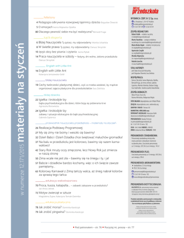 felietony WYDAWCA: CEBP 24.12 Sp. z o.o. 4 Pedagogia odkrywania rozwojowej tajemnicy dziecka Bogusław Śliwerski 5 O emocjach Iwona Majewska-Opiełka 80 Dlaczego pewność siebie ma być realistyczna? Bernard Fruga w numerze 12.171/2015 materiały na styczeń kącik eksperta 6 Bliżej Nauczyciela Ty pytasz, my odpowiadamy Monika Urbańska 8 W świetle prawa Ty pytasz, my odpowiadamy Dariusz Skrzyński 10 Język obcy bez pisania i czytania Iwona Rybak 14 Praca nauczyciela w soboty – festyny, dni wolne, zielone przedszkola Dariusz Skrzyński English with Little Ant 16 English ul. Kwiatowa 3, 30-437 Kraków [email protected] 12 631 04 10 12 262 50 34 ZESPÓŁ REDAKCYJNY: Robert Halik – redaktor naczelny ([email protected]) Marta Stasińska – zastępca redaktora naczelnego ([email protected]) Maria Broda-Bajak – redaktor merytoryczny ([email protected]) Agnieszka Czeglik ([email protected]) Monika Majewska ([email protected]) Natalia Łasocha ([email protected]) STALI AUTORZY: with Little Ant prof. Edyta Gruszczyk-Kolczyńska, prof. Bogusław Śliwerski, Ewa Zielińska Katarzyna Janiszewska-Gold WSPÓŁPRACA: bliżej nauczyciela 19 Cechy twórczości plastycznej dzieci, czyli co trzeba wiedzieć, by mądrze organizować zajęcia plastyczne dla przedszkolaków Ewa Zielińska Dariusz Skrzyński, Iwona Majewska-Opiełka, Bernard Fruga, Jan Amos Jelinek, Gabriela Gąsienica, Monika Urbańska, Barbara Szeląg, Ewa Stadmüller, Karolina Gawlik, Beata Bielska ZESPÓŁ DORADCZY: bliżej dziecka 22 Igiełka i krokodyle łzy bajka psychoedukacyjna dla dzieci, które boją się pobierania krwi Agnieszka Borowiecka 24 Igiełka i krokodyle łzy zabawy i sytuacje edukacyjne do bajki psychoedukacyjnej Gabriela Gąsienica przewodnik nauczyciela przedszkola – materiały na styczeń 26 Realizacja Podstawy Programowej 27 My się zimy nie boimy i wesoło się bawimy! 32 Dzień Babci i Dzień Dziadka chce świętować maluchów gromadka! 37 Na balu w przedszkolu jest kolorowo, bawimy się razem karnawałowo! 42 Stary Rok mruży oczy zmęczone, lecz Nowy Rok już zmierza w naszą stronę 50 Zima wcale nie jest zła – bawimy się na śniegu i ty, i ja! 57 Babcie i dziadków bardzo kochamy, więc o ich święcie zawsze pamiętamy… 63 Kolorowy Karnawał z Zimą tańczy walca, aż śnieg nabrał kolorów za sprawą tego tańca Maria Peszat, Ewa Lelo, Bożena Michalska, Małgorzata Wajda FOTO OKŁADKI: depositphotos.com ©Mari1Photo ZDJĘCIA: depositphotos.com, wikimedia.org GRAFIKA I SKŁAD: Tomasz Gil MARKETING i REKLAMA oraz PATRONATY MEDIALNE: Katarzyna Halik ([email protected]) PRENUMERATA: Natalia Pietrzyk ([email protected]) tel. 12 631 04 10 wew. 102 ISSN: 1642-8668 INDEKS: 248428 DRUK: drukarnia Bimart NAKŁAD: 7000 PRENUMERATA STANDARDOWA: Prenumeratę standardową miesięcznika można zamówić w dowolnym momencie na dowolny okres. Cena brutto prenumeraty za 12 miesięcy: 287,50 zł, za 6 miesięcy: 145 zł PRENUMERATA PLUS: Cena brutto prenumeraty za 12 miesięcy: 587,50 zł, za 6 miesięcy: 290 zł PRENUMERATA ABONAMENTOWA: standardowa: 25 zł za miesiąc PLUS: 50 zł za miesiąc [email protected] 12 631 04 10 wew. 102 www.blizejprzedszkola.pl/prenumerata edukacja wieloobszarowa 70 Proca, kusza, katapulta… – zabawki zakazane w przedszkolu? Jan Amos Jelinek 72 Motyw zwierząt w sztuce Magdalena Żujew, Katarzyna Tomiak-Zaremba edukacja plastyczna 78 Jak zrobić morsa? Dominika Karolczyk 79 Jak zrobić pingwina? Dominika Karolczyk PRENUMERATA INSTYTUCJONALNA: KOLPORTER S.A.: prenumeratę można zamawiać w oddziałach firmy na terenie całego kraju. Informacje pod numerem infolinii 0801 205 555 lub poprzez stronę internetową dp.kolporter.com.pl Przedruk materiałów zamieszczonych w miesięczniku w jakiekolwiek formie oraz ich publikacja w internecie bez wcześniejszej zgody Wydawcy są zabronione. ● Pod patronatem – str. 76 ● Poczytaj mi, proszę – str. 77 Redakcja zastrzega sobie prawo do zmian i skrótów w nadesłanych materiałach oraz do nadawania tytułów. Redakcja nie ponosi odpowiedzialności za treść ogłoszeń i reklam. Wydawca ma prawo odmówić publikacji reklamy bez podania przyczyny.