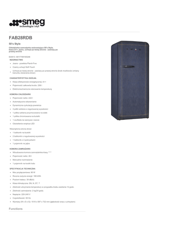 FAB28RDB 50’s Style Chłodziarko-zamrażarka wolnostojąca 50's Style, klasa A++, jeans, uchwyt po lewej stronie - zawiasy po prawej stronie EAN13: 8017709165246 WZORNICTWO Jeans - powłoka Planti-Five Czarny uchwyt Soft-Touch Uchwyt po lewej stronie - zawiasy po prawej stronie (brak możliwości zmiany kierunku otwierania drzwi) CHARAKTERYSTYKA OGÓLNA Klasa efektywności energetycznej: A++ Pojemność całkowita brutto: 256 l Elektromechaniczne sterowanie temperaturą KOMORA CHŁODZIARKI Pojemność netto: 222 l Automatyczne odszranianie Dynamiczna cyrkulacja powietrza 3 półki szklane o regulowanej wysokości 1 półka szklana przymocowana na stałe 1 półka chromowana na butelki 1 szuflada na warzywa i owoce Oświetlenie wnętrza LED Wewnętrzna strona drzwi: 1 balkonik na butelki 2 balkoniki o regulowanej wysokości 1 balkonik z 2 pokrywkami 1 pojemnik na jajka KOMORA ZAMRAŻARKI Wbudowana komora zamrażalnika klasy **** Pojemność netto: 26 l Manualne rozmrażanie 1 pojemnik na kostki lodu SPECYFIKACJA TECHNICZNA Moc przyłączeniowa: 90 W Roczne zużycie energii: 180 kWh Poziom hałasu: 39 dB(A) Klasa klimatyczna: SN, N, ST, T Zdolność utrzymania temperatury w przypadku braku zasilania 12 godz. Zdolność zamrażania: 2 kg/24 godz. Napięcie: 220-240 V Częstotliwość: 50 Hz Wymiary (W x S x G): 1510 x 597 x 732 mm (głębokość wraz z uchwytem) Functions Wersje FAB28RDMC - multikolor, zawiasy po prawej stronie FAB28RDBB - tablica, zawiasy po prawej stronie FAB28RRV1 - kolor czerwony aksamit, zawiasy po prawej stronie FAB28RDG - kolor złoty, zawiasy po prawej stronie FAB28RCG1 - kolor czekoladowy, zawiasy po prawej stronie FAB28LCG1 - kolor czekoladowy, zawiasy po lewej stronie FAB28RIT1 - flaga włoska, zawiasy po prawej stronie FAB28LIT1 - flaga włoska, zawiasy po lewej stronie FAB28RUJ1 - flaga brytyjska, zawiasy po prawej stronie FAB28LUJ1 - flaga brytyjska, zawiasy po lewej stronie FAB28RCS1 - kolorowe pasy, zawiasy po prawej stronie FAB28LCS1 - kolorowe paski, zawiasy po lewej stronie FAB28RBV3 - kolor czarny aksamit, zawiasy po prawej stronie FAB28LBV3 - kolor czarny aksamit, zawiasy po lewej stronie Smeg Polska Sp. z o.o. ul. Cybernetyki 9 02-677 Warszawa Tel. +48 22 276 14 00 FAB28RDB 50’s Style chłodziarko-zamrażarki wolnostojące 50’s style jeans 60 cm klasa energochłonności A++ A++: Zmywarki, chłodziarki, pralki w klasie A ++ zużywają do 20% mniej energii w stosunku do urządzeń należących do klasy A. Urządzenia tej klasy gwarantują zmniejszone zużycie energii, maksymalną efektywność energetyczną i poszanowanie dla środowiska naturalnego. AUTOMATYCZNE ODSZRANIANIE: Wszystkie chłodziarki zostały wyposażone w system automatycznego odszraniania komory. DYNAMICZNA CYRKULACJA POWIETRZA: Specjalny system dynamicznej cyrkulacji powietrza pozwala na równomierną dystrybucję zimnego powietrza wewnątrz chłodziarki. OŚWIETLENIE WNĘTRZA LED: Wybrane modele zostały wyposażone w wewnętrzne oświetlenie LED, które gwarantuje oszczędność energii elektrycznej oraz świeże i dokładne oświetlenie wnętrza. Smeg Polska Sp. z o.o. ul. Cybernetyki 9 02-677 Warszawa Tel. +48 22 276 14 00 FAB28RDB 50’s Style chłodziarko-zamrażarki wolnostojące 50’s style jeans 60 cm klasa energochłonności A++ Smeg Polska Sp. z o.o. ul. Cybernetyki 9 02-677 Warszawa Tel. +48 22 276 14 00