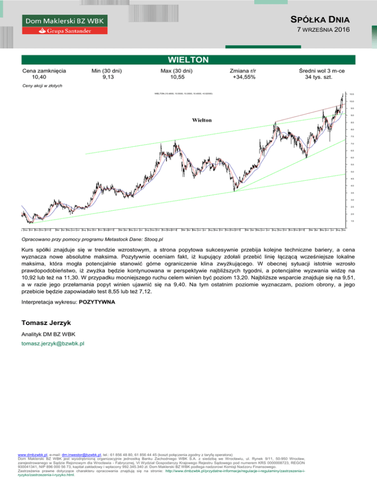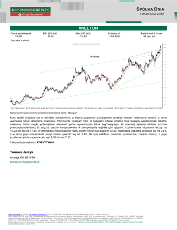 SPÓŁKA DNIA 7 WRZEŚNIA 2016 WIELTON Cena zamknięcia 10,40 Min (30 dni) 9,13 Max (30 dni) 10,55 Średni wol 3 m-ce 34 tys. szt. Zmiana r/r +34,55% Ceny akcji w złotych WIELTON (10.4800, 10.5500, 10.3000, 10.4000, +0.02000) 10.5 10.0 9.5 9.0 Wielton 8.5 8.0 7.5 7.0 6.5 6.0 5.5 5.0 4.5 4.0 3.5 3.0 2.5 2.0 1.5 Aug Sep Oct Nov Dec 2012 Mar Apr May Jun Jul Aug Sep Oct Nov Dec 2013 Mar Apr May Jun Jul Aug Sep Oct Nov Dec 2014 Mar Apr May Jun Jul Aug Sep Oct Nov Dec 2015 Mar Apr May Jun Jul Aug Sep Oct Nov Dec 2016 Mar Apr May Jun Jul Aug Sep Opracowano przy pomocy programu Metastock Dane: Stooq.pl Kurs spółki znajduje się w trendzie wzrostowym, a strona popytowa sukcesywnie przebija kolejne techniczne bariery, a cena wyznacza nowe absolutne maksima. Pozytywnie oceniam fakt, iż kupujący zdołali przebić linię łączącą wcześniejsze lokalne maksima, która mogła potencjalnie stanowić górne ograniczenie klina zwyżkującego. W obecnej sytuacji istotnie wzrosło prawdopodobieństwo, iż zwyżka będzie kontynuowana w perspektywie najbliższych tygodni, a potencjalne wyzwania widzę na 10,92 lub też na 11,30. W przypadku mocniejszego ruchu celem winien być poziom 13,20. Najbliższe wsparcie znajduje się na 9,51, a w razie jego przełamania popyt winien ujawnić się na 9,40. Na tym ostatnim poziomie wyznaczam, poziom obrony, a jego przebicie będzie zapowiadało test 8,55 lub też 7,12. Interpretacja wykresu: POZYTYWNA Tomasz Jerzyk Analityk DM BZ WBK [email protected] www.dmbzwbk.pl, e-mail: [email protected], tel.: 61 856 48 80, 61 856 44 45 (koszt połączenia zgodny z taryfą operatora) Dom Maklerski BZ WBK jest wyodrębnioną organizacyjnie jednostką Banku Zachodniego WBK S.A. z siedzibą we Wrocławiu, ul. Rynek 9/11, 50-950 Wrocław, zarejestrowanego w Sądzie Rejonowym dla Wrocławia - Fabrycznej, VI Wydział Gospodarczy Krajowego Rejestru Sądowego pod numerem KRS 0000008723, REGON 930041341, NIP 896 000 56 73, kapitał zakładowy i wpłacony 992.345.340 zł. Dom Maklerski BZ WBK podlega nadzorowi Komisji Nadzoru Finansowego. Zastrzeżenia prawne dotyczące charakteru opracowania znajdują się na stronie: http://www.dmbzwbk.pl/przydatne-informacje/regulacje-i-regulaminy/zastrzezenia-iryzyko/zastrzezenia-i-ryzyko.html.