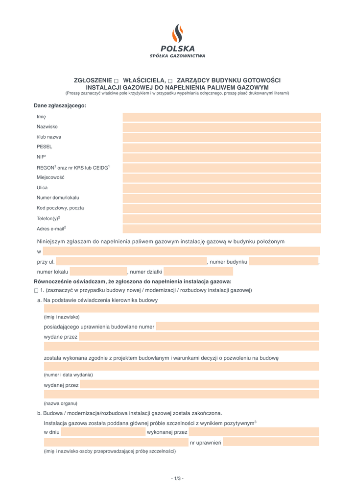 ZGŁOSZENIE ⃞ WŁAŚCICIELA, ⃞ ZARZĄDCY BUDYNKU GOTOWOŚCI INSTALACJI GAZOWEJ DO NAPEŁNIENIA PALIWEM GAZOWYM (Proszę zaznaczyć właściwe pole krzyżykiem i w przypadku wypełniania odręcznego, proszę pisać drukowanymi literami) Dane zgłaszającego: Imię Nazwisko i/lub nazwa PESEL NIP1 REGON1 oraz nr KRS lub CEIDG1 Miejscowość Ulica Numer domu/lokalu Kod pocztowy, poczta Telefon(y)2 Adres e-mail2 Niniejszym zgłaszam do napełnienia paliwem gazowym instalację gazową w budynku położonym w , numer budynku przy ul. numer lokalu , numer działki Równocześnie oświadczam, że zgłoszona do napełnienia instalacja gazowa: ⃞ 1. (zaznaczyć w przypadku budowy nowej / modernizacji / rozbudowy instalacji gazowej) a. Na podstawie oświadczenia kierownika budowy (imię i nazwisko) posiadającego uprawnienia budowlane numer wydane przez została wykonana zgodnie z projektem budowlanym i warunkami decyzji o pozwoleniu na budowę (numer i data wydania) wydanej przez (nazwa organu) b. Budowa / modernizacja/rozbudowa instalacji gazowej została zakończona. Instalacja gazowa została poddana głównej próbie szczelności z wynikiem pozytywnym3 w dniu wykonanej przez nr uprawnień (imię i nazwisko osoby przeprowadzającej próbę szczelności) - 1/3 - , c. U waga: W przypadku budowy przyłącza gazowego proszę podać numer umowy o przyłączenie do sieci gazowej oraz jej datę zawarcia Jednocześnie oświadczam, że: ⃞ 1. jestem w posiadaniu pozytywnego protokołu/opinii z odbioru końcowego kominów z przewodami wentylacyjnymi, spalinowymi4 numer oraz i/lub opinii kominiarskiej z dnia 4 sporządzonych przez potwierdzających wykonanie przewodów wentylacyjno-spalinowych zgodnie z projektem budowlanym, ich drożność oraz prawidłowość podłączenia i użytkowania urządzeń gazowych. ⃞ 2. (zaznaczyć w przypadku, gdy na istniejącej instalacji gazowej prowadzone były prace lub i gdy okres wyłączenia instalacji gazowej z użytkowania był dłuższy niż 6 miesięcy) a. instalacja gazowa została poddana głównej próbie szczelności z wynikiem pozytywnym3 w dniu wykonanej przez nr uprawnień (imię i nazwisko osoby przeprowadzającej próbę szczelności) b. jestem w posiadaniu pozytywnego protokołu / opinii z odbioru końcowego kominów z przewodami kominowymi, wentylacyjnymi, spalinowymi4 numer oraz i/lub opinii kominiarskiej z dnia 4 sporządzonych przez potwierdzających wykonanie przewodów wentylacyjno-spalinowych zgodnie z projektem budowlanym, ich drożność oraz prawidłowość podłączenia i użytkowania urządzeń gazowych. ⃞ 3. (zaznaczyć w przypadku, gdy okres wyłączenia instalacji gazowej z użytkowania był krótszy niż 6 miesięcy i nie prowadzono prac na instalacji gazowej) instalacja gazowa nie została wyłączona z użytkowania na okres dłuższy niż 6 miesięcy i nie prowadzono na niej prac Przyjmuję do wiadomości, że złożenie oświadczenia niezgodnego z prawdą może spowodować odpowiedzialność przewidzianą w przepisach prawa, również w przypadku roszczeń osób trzecich wobec przedsiębiorstwa gazowniczego. Zobowiązuję się, że na żądanie Polskiej Spółki Gazownictwa sp. z o.o. okażę wyżej wskazane dokumenty. Informacja o przetwarzaniu danych osobowych5 1.Administratorem danych osobowych przetwarzanych w celu napełnienia instalacji gazowej paliwem gazowym oraz marketingu własnych produktów i usług jest Polska Spółka Gazownictwa sp. z o.o. z siedzibą w Warszawie przy ul. Kasprzaka 25. Podanie tych danych jest niezbędne do realizacji ww. celów i wynika z art. 23 ust. 1 pkt 2 ustawy z dnia 29 sierpnia 1997 r. o ochronie danych osobowych (t.j. Dz. U. z 2016 r. poz. 922) oraz § 46 pkt 4 Rozporządzenia Ministra Spraw Wewnętrznych i Administracji z dnia 16 sierpnia 1999 r. w sprawie warunków technicznych użytkowania budynków mieszkalnych (Dz. U. z 1999 r. Nr 74, poz.836). 2.Zgłaszającemu przysługuje prawo dostępu do treści swoich danych oraz ich poprawiania. Miejscowość, data Czytelny podpis właściciela budynku Pieczęć i podpis Zarządcy budynku Podstawa prawna: 1. Rozporządzenie Ministra Spraw Wewnętrznych i Administracji z dnia 16 sierpnia 1999 r. w sprawie warunków technicznych użytkowania budynków mieszkalnych (Dz.U. z 1999 r. Nr 74, poz. 836). 2. Ustawa z dnia 7 lipca 1994 r. Prawo budowlane (Dz. U. z 2013 r. poz. 1409 tekst jednolity z późn. zm.). - 2/3 - 1. Dotyczy podmiotów niebędących konsumentami, w tym osób fizycznych prowadzących działalność gospodarczą. 2. Pole nieobowiązkowe w przypadku osób fizycznych prowadzących i nieprowadzących działalności gospodarczej. 3. W przypadku gdy instalacja gazowa nie została napełniona paliwem gazowym w okresie 6 miesięcy od daty przeprowadzenia głównej próby szczelności – próbę tę należy przeprowadzić ponownie. 4. Protokół oraz opinię kominiarską mogą sporządzić i podpisać osoby posiadające odpowiednie uprawnienia. 5. Dotyczy osób fizycznych prowadzących i nieprowadzących działalności gospodarczej. WYPEŁNIA PRZEDSIĘBIORSTWO GAZOWNICZE PRZYJMUJĄCE WNIOSEK Wniosek przyjęto w: Nazwa komórki organizacyjnej, data wpływu Podpis, pieczątka pracownika Nr wniosku (obrót) Nr wniosku (Polska Spółka Gazownictwa) Właściwy Zakład Polskiej Spółki Gazownictwa Nazwa Gazowni, data wpływu, podpis pracownika Gazowni - 3/3 -