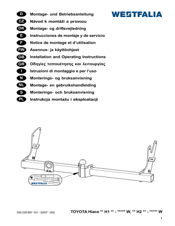 D Montage- und Betriebsanleitung CZ Návod k montáži a provozu DK Montage- og driftsvejledning E Instrucciones de montaje y de servicio F Notice de montage et d’utilisation FIN Asennus- ja käyttöohjeet GB Installation and Operating Instructions GR Οδηγ ε τοπου τηση και λειτουργ α I Istruzioni di montaggio e per l’uso N Monterings- og bruksanvisning NL Montage- en gebruikshandleiding S Monterings- och bruksanvisning PL Instrukcja montażu i eksploatacji 335 230 691 101 - 33/07 - 002 TOYOTA Hiace ** H1 ** - ***** W, ** H2 ** - ***** W 1 D Anhängevorrichtung (Kupplungskugel mit Halterung) ohne Elektrosatz Hersteller: WESTFALIA-AUTOMOTIVE GmbH Westfalia-Bestell - Nr.: 335 230 335 264 / DENGS-00084-17 / DENGS-00789-17 335 356 / DENGS-00787-17 Genehmigungsnummer nach Richtlinie 94/20/EG: e13 00-0246 Klasse: A50-X Typ: 335 229 Technische Daten : maximaler D-Wert: 12,0 kN maximale Stützlast: 80 kg Verwendungsbereich: Fahrzeughersteller: Toyota Modell: Hiace ** H1 ** - ***** W, ** H2 ** - ***** W Typbezeichnung: H1, H12, H12G, H18, H18G, H185, H186 Allgemeine Hinweise: Für den Fahrbetrieb sind die Angaben des Fahrzeugherstellers bzgl. Anhängelast und Stützlast maßgebend, wobei die Werte der Anhängevorrichtung nicht überschritten werden dürfen. Die Anhängevorrichtung dient zum Ziehen von Anhängern, welche mit Zugkugelkupplungen ausgerüstet sind und zum Betrieb von Lastenträgern, welche für die Montage auf der Kupplungs-kugel zugelassen sind. Artfremde Benutzung ist verboten. Der Betrieb muß den Straßen-verhältnissen angepaßt erfolgen. Beim Betrieb verändern sich die Fahreigenschaften des Fahrzeuges. Die Betriebsanleitung des Fahrzeugherstellers ist zu beachten. Bei Fahrzeugen mit Einparkhilfe können nach Montage der Anhängevorrichtung Fehlfunktionen auftreten, da Teile (Kugelstange, Kupplungskugel) im Erfassungsbereich der Sensoren liegen könnten. In diesem Fall sollte der Erfassungsbereich angepasst oder die Einparkhilfe deaktiviert werden. Bei Verwendung von Anhängevorrichtungen mit abnehmbaren bzw. schwenkbaren Kugelstangen ist eine Fehlfunktion nicht zu erwarten, wenn die Kugelstange aus der Betriebsposition genommen wird. Die vom Fahrzeughersteller serienmäßig genehmigten Befestigungspunkte sind eingehalten. Nationale Richtlinien über die Anbauabnahmen sind zu beachten. Diese Montage- und Betriebsanleitung ist den Kfz. - Papieren beizufügen. Montagehinweise: Die Anhängevorrichtung ist ein Sicherheitsteil und darf nur von Fachpersonal montiert werden. Jegliche Änderungen bzw. Umbauten an der Anhängevorrichtung sind verboten. Sie führen zum Erlöschen der Betriebserlaubnis. Isoliermasse bzw. Unterbodenschutz am Kfz. - falls vorhanden - im Bereich der Anlageflächen der Anhängevorrichtung entfernen. Blanke Karosseriestellen sowie Bohrungen mit Rostschutz-farbe versiegeln. Betriebshinweise: Sämtliche Befestigungsschrauben der Anhängevorrichtung nach ca. 1000 Anhänger - km mit den vorgeschriebenen Anziehdrehmomenten nochmals nachziehen. Die Kupplungskugel ist sauber zu halten und zu fetten. Werden jedoch Spurstabilisierungs-einrichtungen, wie z.B. die Westfalia "SSK" benutzt, muß die Kupplungskugel fettfrei sein. Die Hinweise in den jeweiligen Betriebsanleitungen beachten. Sobald an einer beliebigen Stelle ein Kupplungskugel-Durchmesser von 49,0 mm oder kleiner erreicht ist, darf die Anhängevorrichtung aus Sicherheitsgründen nicht mehr benutzt werden. Das Leergewicht des Fahrzeuges erhöht sich nach Montage der Anhängevorrichtung um 18 kg. Änderungen vorbehalten. 2 Tažna zařizeni bez elektropříslušenství Výrobce:WESTFALIA-AUTOMOTIVEGmbH Číslo povolení podle směrnice 94/20/EG: Třída: A50-X Typ: Technicke udaje: maximální D-hodnota: maximální zatížení podpěry: Oblast použití: výrobce vozidel: model: typové označení: CZ Westfalia objednací číslo: 335 230 335 264 335 356 e13 00-0246 335 229 12,0 kN 80 kg Toyota Hiace ** H1 ** - ***** W, ** H2 ** - ***** W H1, H12, H12G, H18, H18G, H185, H186 Všeobecné informace: Pro jízdu jsou směrodatné údaje výrobce vozidla popř. údaje o zatížení přívěsem a zatížení podpěry, přičemž nesmí být překročeny hodnoty tažného zařízení. Tažné zařízení slouží tahání přívěsů, které jsou vybaveny kulovým tažným zařízením a k provozu nosníků povolených k montáži na kulové tažném zařízení. Jiné použití je zakázáno. Použití musí odpovídat silničním poměrům. Při provozu se mění jízdní vlastnosti vozidla. Musí se brát na zřetel provozní návod výrobce vozidla. U vozidel s parkovacím zařízením mohou po montáži závěsného zařízení vzniknout chybové funkce, protože by se díly (tyč s koulí, spojovací koule) mohly nacházet v dosahu senzorů. V tomto případě by měl být přizpůsoben dosah nebo by mělo být deaktivováno parkovací zařízení. Při použití závěsných zařízení s odnímatelnými popř. výkyvnými tyčemi s koulí se chybová funkce neočekává, když se tyč s koulí nenachází v provozní pozici. Výrobcem vozidla sériově povolené upevňovací body se musí dodržet. Směrnice jednotlivých států o přejímání nástaveb musejí být respektovány. Montážní a provozní návod se musí připojit k dokladům vozidla. Montážní informace: Tažné zařízení je bezpečnostní díl a smí být namontován jen odborníky. Každá změna popř. přeměny na tažném zařízení jsou zakázány. Vedou jen ke ztrátě platnosti provozního povolení. Odstranit izolační masu popř. ochranný nátěr podvozku vozidla - když existuje - v oblasti přítlačných častí tažného zařízení. 0čištěné části karoserie, jakož i vývrty uzavřít barvou proti rezavění. Provozní informace: Všechny upevňovací šrouby tažného zařízení dotáhnout po cca 1000 km tažení přívěsu předepsaným kroutícím momentem. Spojovací koule se mus