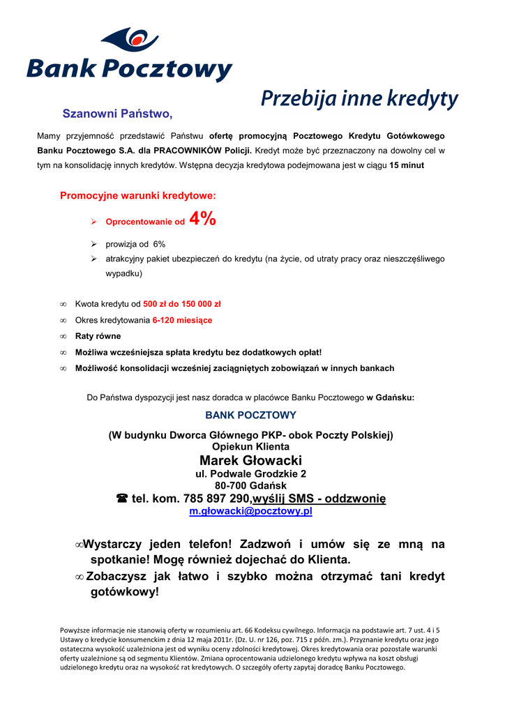 Szanowni Państwo, Mamy przyjemność przedstawić Państwu ofertę promocyjną Pocztowego Kredytu Gotówkowego Banku Pocztowego S.A. dla PRACOWNIKÓW Policji. Kredyt może być przeznaczony na dowolny cel w tym na konsolidację innych kredytów. Wstępna decyzja kredytowa podejmowana jest w ciągu 15 minut Promocyjne warunki kredytowe: Oprocentowanie od 4% prowizja od 6% atrakcyjny pakiet ubezpieczeń do kredytu (na życie, od utraty pracy oraz nieszczęśliwego wypadku) • Kwota kredytu od 500 zł do 150 000 zł • Okres kredytowania 6-120 miesiące • Raty równe • Możliwa wcześniejsza spłata kredytu bez dodatkowych opłat! • Możliwość konsolidacji wcześniej zaciągniętych zobowiązań w innych bankach Do Państwa dyspozycji jest nasz doradca w placówce Banku Pocztowego w Gdańsku: BANK POCZTOWY (W budynku Dworca Głównego PKP- obok Poczty Polskiej) Opiekun Klienta Marek Głowacki ul. Podwale Grodzkie 2 80-700 Gdańsk tel. kom. 785 897 290,wyślij SMS - oddzwonię m.gł[email protected] • Wystarczy jeden telefon! Zadzwoń i umów się ze mną na spotkanie! Mogę również dojechać do Klienta. • Zobaczysz jak łatwo i szybko można otrzymać tani kredyt gotówkowy! Powyższe informacje nie stanowią oferty w rozumieniu art. 66 Kodeksu cywilnego. Informacja na podstawie art. 7 ust. 4 i 5 Ustawy o kredycie konsumenckim z dnia 12 maja 2011r. (Dz. U. nr 126, poz. 715 z późn. zm.). Przyznanie kredytu oraz jego ostateczna wysokość uzależniona jest od wyniku oceny zdolności kredytowej. Okres kredytowania oraz pozostałe warunki oferty uzależnione są od segmentu Klientów. Zmiana oprocentowania udzielonego kredytu wpływa na koszt obsługi udzielonego kredytu oraz na wysokość rat kredytowych. O szczegóły oferty zapytaj doradcę Banku Pocztowego.