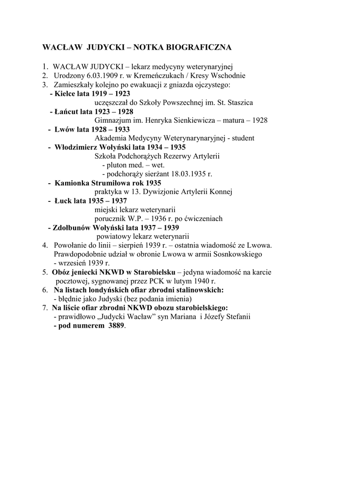 WACŁAW JUDYCKI – NOTKA BIOGRAFICZNA 1. WACŁAW JUDYCKI – lekarz medycyny weterynaryjnej 2. Urodzony 6.03.1909 r. w Kremeńczukach / Kresy Wschodnie 3. Zamieszkały kolejno po ewakuacji z gniazda ojczystego: - Kielce lata 1919 – 1923 uczęszczał do Szkoły Powszechnej im. St. Staszica - Łańcut lata 1923 – 1928 Gimnazjum im. Henryka Sienkiewicza – matura – 1928 - Lwów lata 1928 – 1933 Akademia Medycyny Weterynarynaryjnej - student - Włodzimierz Wołyński lata 1934 – 1935 Szkoła Podchorążych Rezerwy Artylerii - pluton med. – wet. - podchorąży sierżant 18.03.1935 r. - Kamionka Strumiłowa rok 1935 praktyka w 13. Dywizjonie Artylerii Konnej - Łuck lata 1935 – 1937 miejski lekarz weterynarii porucznik W.P. – 1936 r. po ćwiczeniach - Zdołbunów Wołyński lata 1937 – 1939 powiatowy lekarz weterynarii 4. Powołanie do linii – sierpień 1939 r. – ostatnia wiadomość ze Lwowa. Prawdopodobnie udział w obronie Lwowa w armii Sosnkowskiego - wrzesień 1939 r. 5. Obóz jeniecki NKWD w Starobielsku – jedyna wiadomość na karcie pocztowej, sygnowanej przez PCK w lutym 1940 r. 6. Na listach londyńskich ofiar zbrodni stalinowskich: - błędnie jako Judyski (bez podania imienia) 7. Na liście ofiar zbrodni NKWD obozu starobielskiego: - prawidłowo „Judycki Wacław” syn Mariana i Józefy Stefanii - pod numerem 3889.