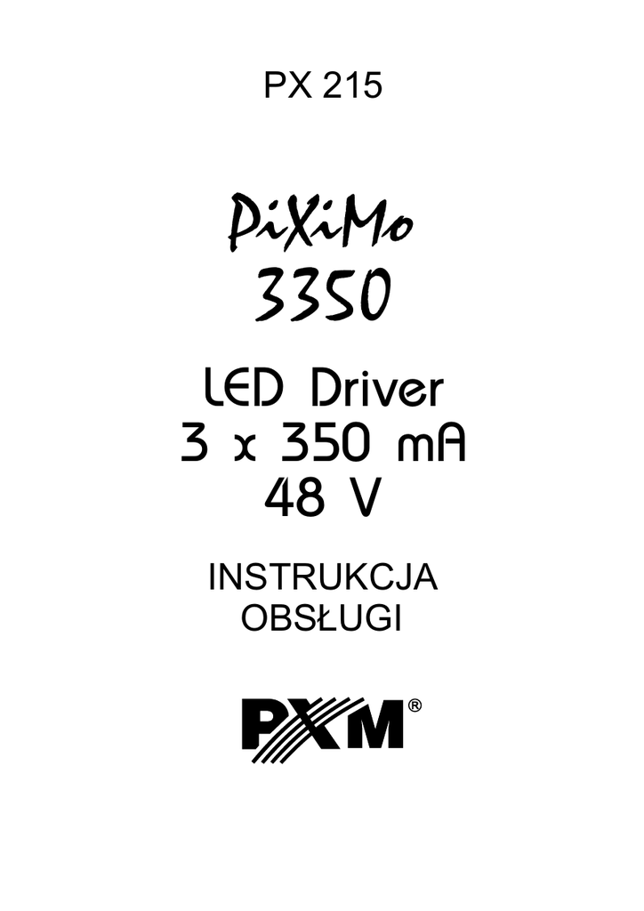 PX 215 PiXiMo 3350 LED Driver 3 x 350 mA 48 V INSTRUKCJA OBSŁUGI R SPIS TREŚCI 1. Opis ogólny......................................................................................................................... 3 2. Warunki bezpieczeństwa.................................................................................................... 3 3. Opis złączy i elementów sterowania...................................................................................4 4. Oznaczenia wyświetlanych komunikatów........................................................................... 4 5. Ustawianie adresu DMX..................................................................................................... 5 6. Funkcja FLP........................................................................................................................ 5 7. Funkcja MASTER / SLAVE.................................................................................................6 8. Balans bieli..........................................................................................................................7 9. Tryb kolorów........................................................................................................................7 10. Ustawienia indywidualne.....................................................................................................8 11. Reakcja na brak sygnału DMX............................................................................................9 12. Opis programów..................................................................................................................10 13. Częstotliwość sterowania jasnością....................................................................................12 14. Korekta częstotliwości sterowania...................................................................................... 11 15. Schemat podłączeń.............................................................................................................11 16. Programowanie...................................................................................................................13 17. Protokół PxLink...................................................................................................................14 18. Wymiary...............................................................................................................................14 19. Specyfikacja techniczna......................................................................................................14 20. Deklaracja zgodności..........................................................................................................15 Producent zastrzega sobie możliwość wprowadzania zmian w funkcjonowaniu i obsłudze sterownika, mających na celu ulepszenie wyrobu. PXM s.c. Rev.1.3. tel.: (12) 626 46 92 ul. Przemysłowa 12 fax: (12) 626 46 94 E-mail: [email protected] 30-701 Kraków Internet: www.pxm.pl 1. OPIS OGÓLNY Moduł PX215 jest przeznaczony do sterowania diodami LED. Wbudowany odbiornik DMX umożliwia wysterowanie 3 kanałów (R, G, B) bezpośrednio protokołem DMX. Szeroki zakres napięcia zasilającego i wysoka obciążalność prądowa wyjść umożliwiają wysterowanie dużych ilości diod LED. PX215 może być sterowany zarówno sygnałem DMX, jak i działać samodzielnie. W tym drugim przypadku użytkownik ma do dyspozycji w pełni programowalną scenę i 18 fabrycznie zaprogramowanych sekwencji, dla których może samodzielnie dowolnie zmieniać prędkość odtwarzania i płynność zmiany kroków. Driver posiada wbudowany system dostrajania częstotliwości sygnału sterującego (technologia "flicker free"), co czyni go szczególnie przydatnym w zastosowaniach dla przemysłu telewizyjnego. Ponieważ diody LED z serii RGB często różnią się dosyć znacznie parametrami, może to spowodować problemy w uzyskaniu białego koloru przy wysterowanie wszystkich kanałów na 100%. Dlatego PX215 został wyposażony w niezwykle przydatną funkcję tzw. balansu bieli. Dzięki niej można tak skorygować sterowanie poszczególnymi kolorami przez moduł, aby przy pełnym wysterowaniu osiągnąć kolor biały. Co więcej, funkcja ta pozwala w pewnym zakresie korygować również temperaturę barwy białego koloru. 2. WARUNKI BEZPIECZEŃSTWA PX215 jest urządzeniem zasilanym napięciem bezpiecznym 48 V, jednak podczas jego instalacji i użytkowania należy bezwzględnie przestrzegać podanych poniżej reguł: 1. Urządzenie może być podłączone wyłącznie do zasilania 12 - 48 V DC (napięcie stabilizowane) o obciążalności zgodnej z danymi technicznymi. 2. Należy chronić wszystkie przewody przed uszkodzeniami mechanicznymi i termicznymi. 3. W przypadku uszkodzenia któregokolwiek z przewodów należy zastąpić go przewodem o takich samych parametrach technicznych. 4. Do podłączenia sygnału DMX stosować wyłącznie przewód ekranowany. 5. Wszelkie naprawy jak i podłączenia wyjść czy sygnału DMX mogą być wykonywane wyłącznie przy odłączonym zasilaniu. 6. Należy bezwzględnie chronić PX 215 przed kontaktem z wodą i innymi płynami. 7. Unikać gwałtownych wstrząsów, a w szczególności upadków. 8. Nie włączać urządzeniach w pomieszczeniach o wilgotności powyżej 90%. 9. Urządzenia nie należy używać w pomieszczeniach o temperaturze niższej niż +2oC lub wyższej niż + 40oC. 10. Do czyszczenia używać wyłącznie lekko wilgotnej ściereczki. 3 3. OPIS ZŁĄCZY I ELEMENTÓW STEROWANIA 4 V+ PiXiMo 3350 1 6 3 5 1 Wejście DMX-512 2 Zasilanie 3 Wyjście DMX-512 4 Wyświetlacz 5 Wyjścia sterujące 6 Klawisze programowania 2 4. OZNACZENIA WYŚWIETLANYCH KOMUNIKATÓW adres DMX urządzenia - podstawowa pozycja w MENU ustawianie parametrów dla wszystkich kanałów jednocześnie ustawianie parametrów dla każdego kanału osobno odwracanie wskazań wyświetlacza o 180 stopni ustawianie adresu DMX wybór spos