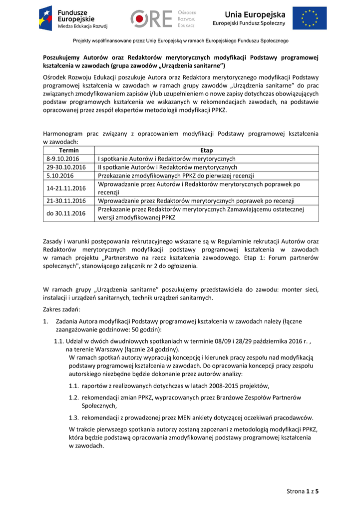 Projekty współfinansowane przez Unię Europejską w ramach Europejskiego Funduszu Społecznego Poszukujemy Autorów oraz Redaktorów merytorycznych modyfikacji Podstawy programowej kształcenia w zawodach (grupa zawodów „Urządzenia sanitarne”) Ośrodek Rozwoju Edukacji poszukuje Autora oraz Redaktora merytorycznego modyfikacji Podstawy programowej kształcenia w zawodach w ramach grupy zawodów „Urządzenia sanitarne” do prac związanych zmodyfikowaniem zapisów i/lub uzupełnieniem o nowe zapisy dotychczas obowiązujących podstaw programowych kształcenia we wskazanych w rekomendacjach zawodach, na podstawie opracowanej przez zespół ekspertów metodologii modyfikacji PPKZ. Harmonogram prac związany z opracowaniem modyfikacji Podstawy programowej kształcenia w zawodach: Termin Etap 8-9.10.2016 I spotkanie Autorów i Redaktorów merytorycznych 29-30.10.2016 II spotkanie Autorów i Redaktorów merytorycznych 5.10.2016 Przekazanie zmodyfikowanych PPKZ do pierwszej recenzji Wprowadzanie przez Autorów i Redaktorów merytorycznych poprawek po 14-21.11.2016 recenzji 21-30.11.2016 Wprowadzanie przez Redaktorów merytorycznych poprawek po recenzji Przekazanie przez Redaktorów merytorycznych Zamawiającemu ostatecznej do 30.11.2016 wersji zmodyfikowanej PPKZ Zasady i warunki postępowania rekrutacyjnego wskazane są w Regulaminie rekrutacji Autorów oraz Redaktorów merytorycznych modyfikacji podstawy programowej kształcenia w zawodach w ramach projektu „Partnerstwo na rzecz kształcenia zawodowego. Etap 1: Forum partnerów społecznych", stanowiącego załącznik nr 2 do ogłoszenia. W ramach grupy „Urządzenia sanitarne” poszukujemy przedstawiciela do zawodu: monter sieci, instalacji i urządzeń sanitarnych, technik urządzeń sanitarnych. Zakres zadań: 1. Zadania Autora modyfikacji Podstawy programowej kształcenia w zawodach należy (łączne zaangażowanie godzinowe: 50 godzin): 1.1. Udział w dwóch dwudniowych spotkaniach w terminie 08/09 i 28/29 października 2016 r. , na terenie Warszawy (łącznie 24 godziny). W ramach spotkań autorzy wypracują koncepcję i kierunek pracy zespołu nad modyfikacją podstawy programowej kształcenia w zawodach. Do opracowania koncepcji pracy zespołu autorskiego niezbędne będzie dokonanie przez autorów analizy: 1.1. raportów z realizowanych dotychczas w latach 2008-2015 projektów, 1.2. rekomendacji zmian PPKZ, wypracowanych przez Branżowe Zespołów Partnerów Społecznych, 1.3. rekomendacji z prowadzonej przez MEN ankiety dotyczącej oczekiwań pracodawców. W trakcie pierwszego spotkania autorzy zostaną zapoznani z metodologią modyfikacji PPKZ, która będzie podstawą opracowania zmodyfikowanej podstawy programowej kształcenia w zawodach. Strona 1 z 5 Projekty współfinansowane przez Unię Europejską w ramach Europejskiego Funduszu Społecznego 1.2. Praca na platformie edukacyjnej moodl’e (łącznie 6 godzin). Wypracowane, w ramach spotkań wstępne założenia pracy zespołu, zostaną przez autorów doprecyzowane w ramach pracy na platformie moodl’e. (poprzez wypowiedzi na forum dyskusyjnym i/lub za pośrednictwem zamieszczania materiałów w przestrzeni moodl’e, które będą stanowił materiał bazowy do opracowania modyfikacji podstawy programowej) 1.3. Zmodyfikowanie zapisów i/lub uzupełnienie o nowe zapisy dotychczas obowiązujących podstaw programowych kształcenia w danym zawodzie, na podstawie opracowanej przez zespół ekspertów metodologii modyfikacji PPKZ (łącznie 15 godzin) 1.4. Korekta opracowanych modyfikacji PPKZ po uwagach zawartych w recenzji modyfikowanej PPKZ (łącznie 5 godzin). 2. Zadania Redaktora merytorycznego (łączne zaangażowanie godzinowe: 15 godzin): 2.1. Konsultowanie struktury i zawartości dzieła (PPKZ) z pracownikami zadania 2 projektu. 2.2. Ujednolicenie i sprawdzenie pod kątem merytorycznym dzieła. 2.3. Przekazanie uwag recenzenta autorom dzieła po pierwszej recenzji. 2.4. Korekta opracowanych modyfikacji PPKZ po uwagach zawartych w drugiej recenzji modyfikowanej PPKZ. Redaktorem merytorycznym może być wyłącznie Autor modyfikacji PPKZ. Warunki realizacji umowy: Autor modyfikacji Podstawy programowej kształcenia w zawodach 1. Typ umowy: łączona (zlecenie 30 godzin + dzieło 20 godzin – łącznie 50 godzin). 2. Termin realizacji umowy: 8. 10.2016 – 21.11.2016 r. 3. Zakres zadań w ramach umowy: a. Udział w dwóch dwudniowych spotkaniach w terminie 08/09 i 28/29 października 2016 r. (łącznie 24 godziny) – umowa zlecenie. b. Praca na platformie edukacyjnej moodl’e (łącznie 6 godzin) – umowa zlecenie. c. Zmodyfikowanie zapisów i/lub uzupełnienie o nowe zapisy dotychczas obowiązujących podstaw programowych kształcenia w danym zawodzie, na podstawie opracowanej przez zespół ekspertów metodologii modyfikacji PPKZ (łącznie 15 godzin) – umowa o dzieło. d. Korekta opracowanych modyfikacji PPKZ po uwagach zawartych w recenzji modyfikowanej PPKZ (łącznie 5 godzin). 4. Łączna liczba godzin zaangażowania: 50 godzin. 5. Warunki finansowe: Na podstawie wniosku o dofinansowanie projektu Zamawiający określa następujący maksymalny limit kosztów na poszczególne wydatki związane z opisanym zadaniem: realizacja przedmiotu umowy: 100 zł/godzina * 50 h = 5000 zł/os. Redaktor merytoryczny modyfikacji Podstawy programowej kształcenia w zawodach 1. Typ umowy: zlecenie (łącznie 15 godzin). 2. Termin realizacji umowy: 8. 10.2016 – 28.11.2016 r. 3. Zakres zadań w ramach umowy: a. Konsultowanie struktury i zawartości dzieła (PPKZ) z pracownikami zadania 2 projektu Strona 2 z 5 Projekty współfinansowane przez Unię Europejską w ramach Europejskiego Funduszu Społecznego b. Ujednolicenie i sprawdzenie pod kątem merytorycznym dzieła. c. Przekazanie uwag recenzenta autorom dzieła. d. Korekta opracowanych modyfikacji PPKZ po uwagach zawartych w drugiej recenzji modyfikowanej PPKZ. 4. Łączna liczba godzin zaangażowania: 15 godzin.