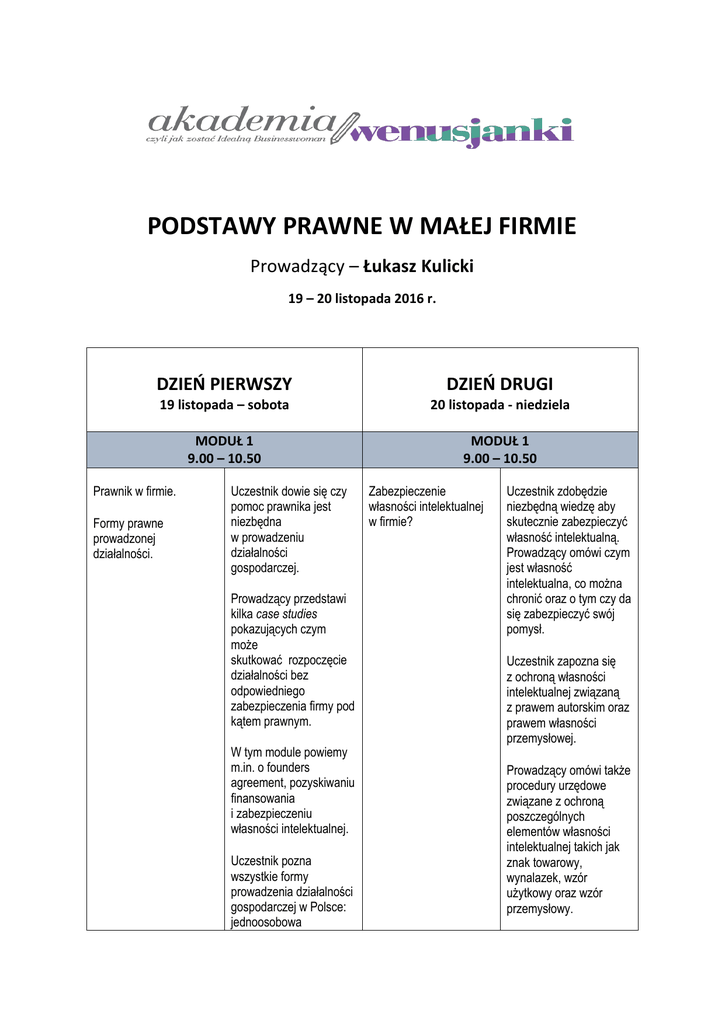 PODSTAWY PRAWNE W MAŁEJ FIRMIE Prowadzący – Łukasz Kulicki 19 – 20 listopada 2016 r. DZIEŃ PIERWSZY DZIEŃ DRUGI 19 listopada – sobota 20 listopada - niedziela MODUŁ 1 9.00 – 10.50 MODUŁ 1 9.00 – 10.50 Prawnik w firmie. Formy prawne prowadzonej działalności. Uczestnik dowie się czy pomoc prawnika jest niezbędna w prowadzeniu działalności gospodarczej. Prowadzący przedstawi kilka case studies pokazujących czym może skutkować rozpoczęcie działalności bez odpowiedniego zabezpieczenia firmy pod kątem prawnym. W tym module powiemy m.in. o founders agreement, pozyskiwaniu finansowania i zabezpieczeniu własności intelektualnej. Uczestnik pozna wszystkie formy prowadzenia działalności gospodarczej w Polsce: jednoosobowa Zabezpieczenie własności intelektualnej w firmie? Uczestnik zdobędzie niezbędną wiedzę aby skutecznie zabezpieczyć własność intelektualną. Prowadzący omówi czym jest własność intelektualna, co można chronić oraz o tym czy da się zabezpieczyć swój pomysł. Uczestnik zapozna się z ochroną własności intelektualnej związaną z prawem autorskim oraz prawem własności przemysłowej. Prowadzący omówi także procedury urzędowe związane z ochroną poszczególnych elementów własności intelektualnej takich jak znak towarowy, wynalazek, wzór użytkowy oraz wzór przemysłowy. działalność gospodarcza, spółki osobowe, spółki kapitałowe. Każda forma prawna zostanie omówiona pod kątem procedury rejestracyjnej oraz pod kątem kosztów założenia i prowadzenia firmy. Osobno prowadzący omówi kwestie związane z zasadami ponoszenia odpowiedzialności przez przedsiębiorcę, które są różne dla każdej z form prowadzenia działalności gospodarczej. Na koniec tego modułu uczestnik pozna możliwości zmiany formy prawnej prowadzonej działalności w przypadku rozwoju firmy, przejęcia innej firmy lub też jej sprzedaży. PRZERWA 10 minut MODUŁ 2 11.00 – 12.30 Obowiązki prawne związane z prowadzeniem działalności gospodarczej w Internecie. Uczestnik zdobędzie wiedzę niezbędną do prowadzenia działalności gospodarczej w Internecie. W sposób szczegółowy prowadzący omówi obowiązki związane z wprowadzeniem regulaminu w serwisie internetowym oraz ze świadczeniem usług drogą elektroniczną. Niemniej ważnym elementem tej części szkolenia będzie szczegółowa analiza PRZERWA 10 minut MODUŁ 2 11.00 – 12.30 Dochodzenie należności od dłużników. W tym module uczestnik zapozna się z możliwościami dochodzenia należności. Prowadzący omówi dostępne procedury sądowe i pozasądowe uwzględniając zarówno kwestie techniczne jak i praktyczne. Przedstawione zostanie poprawnie przygotowane wezwanie do zapłaty. Uczestnik dowie się również jak przygotować pozew o zapłatę oraz przepisów dotyczących ochrony danych osobowych. wniosek o wszczęcie egzekucji. Na koniec zostaną omówione najskuteczniejsze pozasądowego elementy rozwiązywania sporów. Prowadzący w sposób praktycznych przedstawi obowiązki prawne przedsiębiorców działających w różnych modelach biznesowych funkcjonujących w Internecie, tj. SaaS, marketplace, sklep internetowy. PRZERWA 40 minut MODUŁ 3 13.10 – 14.50 Zatrudnianie pracowników. Uczestnik pozna formy zatrudniania pracowników w firmie. Formy prawne zatrudnienia pracowników. PRZERWA 40 minut MODUŁ 3 13.10 – 14.50 Pozyskiwanie zewnętrznego finansowania Prowadzący szczególny nacisk położy na praktyczne omówienie umowy współpracy, umowy o pracę, umowy zlecenia i umowy o dzieło Rozwój firmy wymaga niekiedy pozyskania zewnętrznego źródła finansowania. Dlatego też uczestnik dowie się jakie są dostępne na rynku źródła finansowania. Prowadzący szczegółowo omówi m.in. pozyskanie środków na rozwój od aniołów biznesu, funduszy venture capital, za pośrednictwem crowdfundingu. Uczestnik zdobędzie niezbędne informacje istotne z punktu widzenia pracodawcy. Pozna swoje prawa i obowiązki jako pracodawcy. Zostaną także omówione prawne aspekty procesu inwestycyjnego. PRZERWA 10 minut MODUŁ 4 15.00 – 16.00 Najważniejsze umowy w firmie? Na co zwracać uwagę? W tym module uczestnik dowie się dlaczego zawieranie umów w formie pisemnej jest istotne z punktu widzenia pewności prowadzonej PRZERWA 10 minut MODUŁ 4 15.00 – 16.00 Podatki w firmie Uczestnik zdobędzie wiedzę na temat podatków obowiązujących przy różnych formach działalności gospodarczej. prowadzenia działalności gospodarczej. Prowadzący szczegółowo omówi elementy umowy, najważniejsze klauzule Omówione zostaną m.in. podatek dochodowy od osób fizycznych, podatek dochodowy od osób prawnych, podatek od czynności cywilnoprawnych, podatek od zysków kapitałowych. umowne oraz najczęstsze błędy popełniane przy pisaniu umów. Powyższe będzie omawiane na przykładzie m.in. umowy o zachowaniu poufności, umowy współpracy, umowy dostawy, umowy zlecenia, umowy o dzieło. KONIEC Osobno prowadzący omówi podatki znajdujące zastosowanie przy prowadzeniu działalności w Internecie. Na koniec przedstawione zostaną najważniejsze kwestie związane z kontrolą stosowania przepisów prawa podatkowego (tzw. kontrola skarbowa).