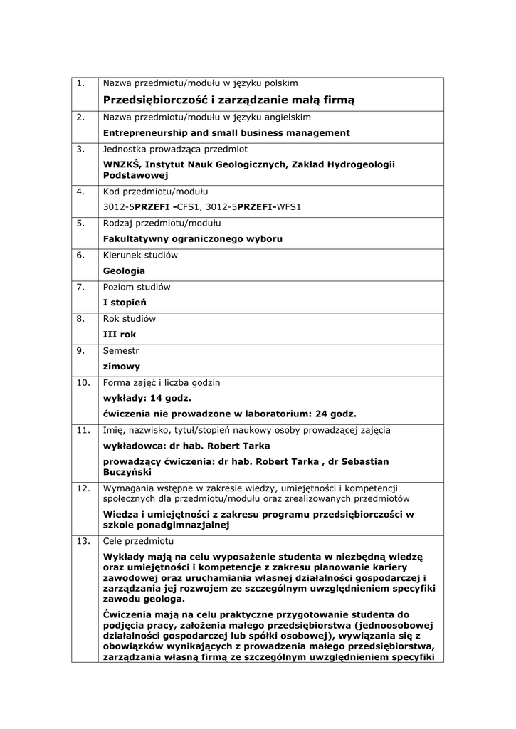 1. Nazwa przedmiotu/modułu w języku polskim Przedsiębiorczość i zarządzanie małą firmą 2. Nazwa przedmiotu/modułu w języku angielskim Entrepreneurship and small business management 3. Jednostka prowadząca przedmiot WNZKŚ, Instytut Nauk Geologicznych, Zakład Hydrogeologii Podstawowej 4. Kod przedmiotu/modułu 3012-5PRZEFI -CFS1, 3012-5PRZEFI-WFS1 5. Rodzaj przedmiotu/modułu Fakultatywny ograniczonego wyboru 6. Kierunek studiów Geologia 7. Poziom studiów I stopień 8. Rok studiów III rok 9. Semestr zimowy 10. Forma zajęć i liczba godzin wykłady: 14 godz. ćwiczenia nie prowadzone w laboratorium: 24 godz. 11. Imię, nazwisko, tytuł/stopień naukowy osoby prowadzącej zajęcia wykładowca: dr hab. Robert Tarka prowadzący ćwiczenia: dr hab. Robert Tarka , dr Sebastian Buczyński 12. Wymagania wstępne w zakresie wiedzy, umiejętności i kompetencji społecznych dla przedmiotu/modułu oraz zrealizowanych przedmiotów Wiedza i umiejętności z zakresu programu przedsiębiorczości w szkole ponadgimnazjalnej 13. Cele przedmiotu Wykłady mają na celu wyposażenie studenta w niezbędną wiedzę oraz umiejętności i kompetencje z zakresu planowanie kariery zawodowej oraz uruchamiania własnej działalności gospodarczej i zarządzania jej rozwojem ze szczególnym uwzględnieniem specyfiki zawodu geologa. Ćwiczenia mają na celu praktyczne przygotowanie studenta do podjęcia pracy, założenia małego przedsiębiorstwa (jednoosobowej działalności gospodarczej lub spółki osobowej), wywiązania się z obowiązków wynikających z prowadzenia małego przedsiębiorstwa, zarządzania własną firmą ze szczególnym uwzględnieniem specyfiki zawodu geologa. 14. Zakładane efekty kształcenia (W_1) Posiada wiedzę w zakresie planowania kariery zawodowej oraz uruchamiania własnej działalności gospodarczej i zarządzania jej rozwojem uwzględniającą podstawowe zasady zasad bezpieczeństwa i higieny pracy oraz ergonomii. (W_2) Zna podstawowe pojęcia i zasady ochrony własności intelektualnej. (U_1) Potrafi wyszukiwać i wykorzystywać publikacje źródłowe, w tym internetowe oraz poprawnie wnioskować na podstawie danych z różnych źródeł w celu kreowania swojej kariery zawodowej. (K_1) Wykazuje odpowiedzialność za bezpieczeństwo pracy własnej i innych osób. (K_2) Jest zdolny do obiektywnej oceny wykonanej pracy. 15. Symbole kierunkowych efektów kształcenia K1_W09 K1_W10 K1_U12, K1_U13 K1_K03 K1_K07 Treści programowe Wykłady: 1. Planowanie kariery zawodowej geologa. Skuteczne ubieganie się o pracę 2. Biznes plan przedsięwzięcia geologicznego. 3. Pojęcie, istota oraz zasady funkcjonowania małych i średnich przedsiębiorstw ze szczególnym uwzględnieniem firm geologicznych. 4. Źródła finansowania małych i średnich przedsiębiorstw. 5. Opis i wyjaśnienie podstawowych zagadnień niezbędnych do założenia własnej firmy geologicznej. 6. Podstawowe zasady i funkcje uproszczonej rachunkowości, różnice między rachunkowością finansową, a uproszczoną rachunkowością podatkową. 7. Wybór najkorzystniejszej formy opodatkowania małej firmy podatkiem dochodowym. 8. Budowa i zasady ewidencyjne podatkowej księgi przychodów i rozchodów. 9. Podatek od towarów i usług w małej firmie, rejestry VAT. 10. Marketing i zarządzanie małym i średnim przedsiębiorstwem. 11. Możliwości wsparcia małych i średnich przedsiębiorstw ze środków unijnych ze szczególnym uwzględnienie specyfiki geologii. Ćwiczenia: 1. Przygotowanie listu motywacyjnego i CV, przygotowanie do rozmowy kwalifikacyjnej. 2. Opracowanie biznes planu przedsięwzięcia geologicznego. 3. Rejestracja własnej działalności (firmy geologicznej): formularz do rejestracji działalności gospodarczej, formularz do rejestracji spółki, wniosek REGON, wniosek NIP, rozliczania podatku dochodowego od jej działalności, rozliczenia z ZUS. 4. Sporządzanie ofert, rozliczanie wykonanych prac. 16. Zalecana literatura (podręczniki) Literatura podstawowa: Francik A., Targalski J, 2009: Przedsiębiorczość i zarządzanie firmą - Teoria i praktyka (Wydanie drugie), C. H. Beck. 338 pp. Cebrowska T., Rachunkowość finansowa i podatkowa, PWN, Warszawa 2005. Literatura uzupełniająca: Targalski J, 2008: Przedsiębiorczość wobec wyzwań integracji europejskiej, Uniwersytet Ekonomiczny Kraków. 133 pp. Wyrzykowski W., Księgi, ewidencje i rejestry podatkowe małych przedsiębiorców, Scientific Publishing Group, Gdańsk 2005. 17. Forma zaliczenia poszczególnych komponentów przedmiotu/modułu, sposób sprawdzenia osiągnięcia zamierzonych efektów kształcenia: Wykłady: Egzamin pisemny (test otwarty) - po zaliczeniu ćwiczeń. Wynik pozytywny uzyskanie co najmniej 50% punktów. Ćwiczenia Zaliczenie na podstawie opracowywanych sprawozdań obejmujących napisanie biznes planu oraz zrealizowania wszystkich kroków niezbędnych do założenia i prowadzenia firmy geologicznej. 18. Język wykładowy polski 19. Obciążenie pracą studenta: Forma aktywności studenta Godziny zajęć (wg planu studiów) z nauczycielem: Średnia liczba godzin na zrealizowanie aktywności 38 godz. - wykład: 14 godz. - ćwiczenia: 24 godz. Praca własna studenta np.: 20 godz. - przygotowanie do zajęć: 2 godz. - opracowanie wyników: - czytanie wskazanej literatury: 5 godz. - napisanie raportu z zajęć: 11 godz. - przygotowanie do egzaminu: 2 godz. Suma godzin Liczba punktów ECTS 58 godz. 2 ECTS