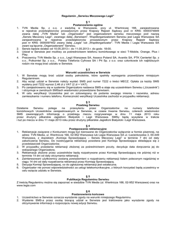 Regulamin „Serwisu Meczowego Legii” 1. 2. 3. 4. 1. 2. 3. 4. §1 Postanowienia ogólne TVN Media Sp. z o.o. z siedzibą w Warszawie, przy ul. Wiertniczej 166, zarejestrowana w rejestrze przedsiębiorców prowadzonym przez Krajowy Rejestr Sądowy pod nr KRS: 0000374849 zwana dalej „TVN Media” lub „Organizator” jest organizatorem serwisu meczowego pod nazwą „Serwis Meczowy Legii”, zwanego dalej „Serwisem”. Współorganizatorem Serwisu jest Legia Warszawa SA zarejestrowana w rejestrze przedsiębiorców prowadzonym przez Krajowy Rejestr Sądowy pod nr KRS: 0000097402 zwany dalej „Legia” lub „Współorganizator”. TVN Media i Legia Warszawa SA zwani są łącznie „Organizatorami” Serwisu. Serwis będzie działać od 10.05.2013 r. do 11.05.2013 r. do godz. 18:00. Udział w Serwisie jest możliwy za pośrednictwem telefonu komórkowego w sieci T-Mobile, Orange, Plus i Play. Pracownicy TVN Media Sp. z o.o., Legii Warszawa SA, Asseco Poland SA, Avantis SA, PTK Centertel Sp. z o.o., Polkomtel Sp. z o.o., Polska Telefonia Cyfrowa SA i P4 Sp. z o.o. oraz członkowie ich najbliższych rodzin nie mogą brać udziału w Serwisie. §2 Warunki uczestnictwa w Serwisie W Serwisie mogą brać udział osoby pełnoletnie, które spełniły wymagania przewidziane niniejszym Regulaminem. Aby wziąć udział w Serwisie należy wysłać SMS pod numer 7222 o treści MECZ. Opłata za każdy SMS wysłany pod 7222 wynosi 2,46 zł z VAT (2 zł + VAT). Po zarejestrowaniu się w systemie Organizatora nadawca SMS-a staje się uczestnikiem Serwisu („Uczestnik”) i otrzymuje w zwrotnych SMSach wiadomości przewidziane Serwisem. W celu weryfikacji Uczestnika jest on zobowiązany do podania swojego imienia i nazwiska, adresu zamieszkania i numeru telefonu. Konieczność weryfikacji Uczestnika zachodzi w przypadku reklamacji. §3 Przebieg Serwisu Działanie Serwisu polega na przesyłaniu przez Organizatorów na numery telefonów komórkowych Uczestników zarejestrowanych w Serwisie, w czasie trwania Serwisu, czterech wiadomości SMS zawierających informację o przebiegu meczu rozgrywanego w dniu 11 maja 2013 roku przez drużyny piłkarskie Jagielloni Białystok i Legii Warszawa. SMSy będą wysyłane w trakcie i tuż po meczu w dniu 11 maja 2013 roku przez drużyny piłkarskie Jagielloni Białystok i Legii Warszawa. 1. 2. 3. 4. 5. 6. §4 Postępowanie reklamacyjne Reklamacje związane z Konkursem mogą być kierowane do Organizatorów wyłącznie w formie pisemnej, na adres: TVN Media, ul. Wiertnicza 166, 02-952 Warszawa lub Legia Warszawa SA ul. Łazienkowska 3, 00-449 Warszawa, z dopiskiem „Komisja Sprawdzająca – Serwis Meczowy Legii” w terminie 7 dni od daty zakończenia Serwisu. Do rozstrzygania reklamacji powołana jest Komisja Sprawdzająca składająca się z przedstawicieli Organizatorów. W przypadku przesłania reklamacji złożonej za pośrednictwem poczty, decyduje data doręczenia jej do wskazanego Organizatora. Reklamacje złożone przez uczestników będą rozpatrywane przez Komisję Sprawdzającą nie później niż w terminie 14 dni od daty otrzymania reklamacji. Zainteresowani użytkownicy zostaną powiadomieni o rozpatrzeniu reklamacji listem poleconym najpóźniej w ciągu 14 dni od daty rozpatrzenia reklamacji przez Komisję Sprawdzającą. Decyzja Komisji Sprawdzającej, co do zgłoszonej reklamacji jest ostateczna. Organizator nie ponosi odpowiedzialności za usługi telekomunikacyjne, z których korzystać będą uczestnicy w celu wzięcia udziału w Serwisie. §5 Publikacja Regulaminu Serwisu Z treścią Regulaminu można się zapoznać w siedzibie TVN Media (ul. Wiertnicza 166, 02-952 Warszawa) oraz na www.legia.com 1. 2. §6 Postanowienia końcowe Uczestnictwo w Serwisie oznacza wyrażenie zgody na warunki niniejszego Regulaminu. Wysłanie SMS-a przez osobę biorącą udział w Serwisie jest traktowane jako wyrażenie zgody na otrzymywanie informacji o rozpoczęciu nowej edycji Serwisu.