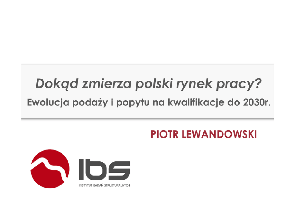 Dokąd zmierza polski rynek pracy? Ewolucja podaży i popytu na kwalifikacje do 2030r. PIOTR LEWANDOWSKI POPYT NA ZAWODY Restrukturyzacja i postęp technologiczny zmieniają popyt na zawody struktura pracujących wg zawodów, % 100% 100% USA 80% 60% 40% 20% 0% 21 40 3 16 80% 27 60% 11 10 7 13 13 40% 14 3 20% 12 8 3 4 0% 1950 21 1970 1990 2010 30 4 13 13 9 9 JAPONIA 43 1950 14 21 3 16 1970 1990 2010 Miejsca pracy znikają w przemyśle i rolnictwie a pojawiają się w usługach 20 000 16 000 12 000 8 000 4 000 pozostałe usługi handel, hotele i gastronomia dostarczanie energii, gazu i wody górnictwo 2007 2005 2003 2001 1999 1997 1995 1993 1991 1989 1987 1985 1983 1981 0 transport, magazynowanie i łączność budownictwo przemysł przetwórczy rolnictwo Najszybciej rośnie popyt na specjalistów i pracowników usług osobistych struktura pracujących Polska 1995 vs. 2012 6% 7% 10% 9% 8% 6% 9% 18% 11% 15% 20% 7% 11% 9% 12% 21% 7% 14% Kierownicy Pracownicy biurowi Robotnicy przem. Specjaliści Prac. usług osobistych Operatorzy maszyn Technicy Rolnicy Prace proste Jak prognozujemy popyt na pracę? konwergencja struktury sektorowej do modelu odniesienia dwa scenariusze: reidustrializacj a serwicyzacja trendy zmiany struktury zawodowej w sektorach projekcja popytu na pracę do 2030 roku Nowe miejsca pracy będą powstawać na górze i dole rozkładu kwalifikacji zmiana popytu na pracę w latach 2012-2030, tys. os. prace proste operatorzy robotnicy przem. rolnicy usługi osobiste prace biurowe technicy specjaliści menedżerowie -1200 -800 scenariusz "serwicyzacja" -400 0 400 scenariusz "reidustrializacja" 800 PODAŻ KWALIFIKACJI Polska doświadcza niebywałej zmiany edukacyjnej 50% odsetek osób z wykształceniem wyższym wg kohort 40% 30% 20% 10% 0% 1995 1997 1999 2001 2003 2005 2007 2009 2011 1966 1968 1970 1972 1974 1976 1978 1980 1982 1984 Jak przewidujemy podaż pracy? BAEL Łańcuch Markowa Dynamika w cyklu życia Boom edukacyjny determinuje strukturę podaży pracy na kolejne 40 lat prognoza struktury wykształcenia populacji w wieku 20-74 lata 5% 16% 23% 28% 11% 11% 28% 25% 2028 2026 2024 2022 2020 2018 2016 2014 wyższe średnie ogólne gimnazjalne lub niższe 2030 32% 20% 2012 100% 90% 80% 70% 60% 50% 40% 30% 20% 10% 0% średnie techniczne zasadnicze zawodowe Będziemy coraz lepiej wykształceni, ale na rynku pracy będzie nas coraz mniej 2012 M 500 [tys. os.] 2030 K 80 M 75 75 70 70 65 65 60 60 55 55 50 50 45 45 40 40 35 35 30 30 25 25 0 500 500 K 80 wyższe średnie techniczne średnie ogólne zasadnicze zawodowe gimnazjalne lub niższe średnie techniczne 0 500 [tys. os.] Czy kształcimy w odpowiednich obszarach? struktura studentów wg kierunków, 2012 Niemcy 4% 8% 17% 9% 13% Polska 14% 8% 9% 14% 18% 26% 14% 8% 38% ZESTAWIENIE PROGNOZ POPYTU I PODAŻY Popyt na pracowników wykwalifikowanych umysłowych przewyższa podaż prognoza struktury popytu i podaży pracy „reindustrializacja” Nadmiar pracowników wykwalifikowanych fizycznych większy przy serwicyzacji prognoza struktury popytu i podaży pracy „serwicyzacja” PODSUMOWANIE Technologia i globalizacja -> dalsza restrukturyzacja Technologie ICT -> wyższy popyt na umysłowe prace nierutynowe oraz premia za ich wykonywanie Starzenie się ludności -> wyższy popyt na nierutynowe prace fizyczne Polaryzacja może mieć wymiar międzypokoleniowy Wyzwanie przepływów między zawodami fizycznymi a umysłowymi ZAPRASZAM DO DYSKUSJI [email protected] www.ibs.org.pl twitter.com/ibs_thinktank