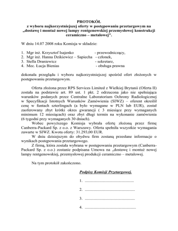 PROTOKÓŁ z wyboru najkorzystniejszej oferty w postępowaniu przetargowym na „dostawę i montaż nowej lampy rentgenowskiej przemysłowej konstrukcji ceramiczno – metalowej”. W dniu 14.07 2008 roku Komisja w składzie: 1. 2. 3. 4. Mgr inż. Krzysztof Isajenko Mgr inż. Hanna Dzikiewicz – Sapiecha Stella Draniewicz Mec. Łucja Bienias - przewodniczący, - członek, - sekretarz, - obsługa prawna dokonała przeglądu i wyboru najkorzystniejszej spośród ofert złożonych w postępowaniu przetargowym. Oferta złożona przez RPS Services Limited z Wielkiej Brytanii (Oferta II) została na podstawie art. 89 ust. 1 pkt. 2 odrzucona jako nie spełniająca warunków podanych przez Centralne Laboratorium Ochrony Radiologicznej w Specyfikacji Istotnych Warunków Zamówienia (SIWZ) – oferent określił cenę w funtach szterlingach (a było wymagane w PLN lub EUR), został zaoferowany zbyt krótki okres gwarancji ( 3 miesiące przy wymaganych minimum 12 miesiącach) oraz zbyt długi termin na wykonanie zamówienia (6 tygodni przy wymaganych 30 dniach). Wobec powyższego Komisja wybrała ofertę złożoną przez firmę Canberra-Packard Sp. z o.o. z Warszawy. Oferta spełniła wszystkie wymagania zawarte w SIWZ. Kwota oferty: 31.293,00 EUR. W dniu dzisiejszym do obydwu firm zostaną przesłane informacje o wynikach postępowania przetargowego. Z firmą, która została wybrana w postępowaniu przetargowym (CanberraPackard Sp. z o.o.) zostanie podpisana Umowa na „dostawę i montaż nowej lampy rentgenowskiej, przemysłowej produkcji ceramiczno – metalowej. Na tym protokół zakończono. Podpisy Komisji Przetargowej. 1. ............................................... 2. ................................................ 3. ................................................ 4. .................................................
