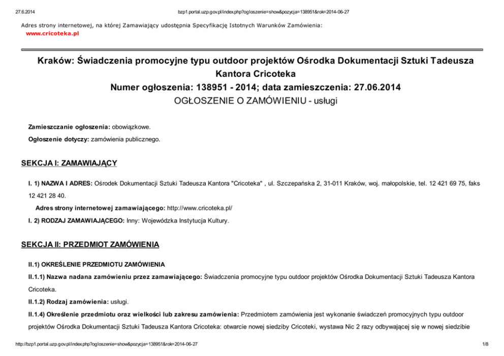 27.6.2014 bzp1.portal.uzp.gov.pl/index.php?ogloszenie=show&pozycja=138951&rok=2014-06-27 Adres strony internetowej, na której Zamawiający udostępnia Specyfikację Istotnych Warunków Zamówienia: www.cricoteka.pl Kraków: Świadczenia promocyjne typu outdoor projektów Ośrodka Dokumentacji Sztuki Tadeusza Kantora Cricoteka Numer ogłoszenia: 138951 - 2014; data zamieszczenia: 27.06.2014 OGŁOSZENIE O ZAMÓWIENIU - usługi Zamieszczanie ogłoszenia: obowiązkowe. Ogłoszenie dotyczy: zamówienia publicznego. SEKCJA I: ZAMAWIAJĄCY I. 1) NAZWA I ADRES: Ośrodek Dokumentacji Sztuki Tadeusza Kantora "Cricoteka" , ul. Szczepańska 2, 31-011 Kraków, woj. małopolskie, tel. 12 421 69 75, faks 12 421 28 40. Adres strony internetowej zamawiającego: http://www.cricoteka.pl/ I. 2) RODZAJ ZAMAWIAJĄCEGO: Inny: Wojewódzka Instytucja Kultury. SEKCJA II: PRZEDMIOT ZAMÓWIENIA II.1) OKREŚLENIE PRZEDMIOTU ZAMÓWIENIA II.1.1) Nazwa nadana zamówieniu przez zamawiającego: Świadczenia promocyjne typu outdoor projektów Ośrodka Dokumentacji Sztuki Tadeusza Kantora Cricoteka. II.1.2) Rodzaj zamówienia: usługi. II.1.4) Określenie przedmiotu oraz wielkości lub zakresu zamówienia: Przedmiotem zamówienia jest wykonanie świadczeń promocyjnych typu outdoor projektów Ośrodka Dokumentacji Sztuki Tadeusza Kantora Cricoteka: otwarcie nowej siedziby Cricoteki, wystawa Nic 2 razy odbywającej się w nowej siedzibie http://bzp1.portal.uzp.gov.pl/index.php?ogloszenie=show&pozycja=138951&rok=2014-06-27 1/8 27.6.2014 bzp1.portal.uzp.gov.pl/index.php?ogloszenie=show&pozycja=138951&rok=2014-06-27 Cricoteki Część I Wykonanie świadczeń promocyjnych otwarcia nowej siedziby Cricoteki w wybranych miastach Polski w okresie od 1 do 31 sierpnia 2014 r. poprzez zamieszczenie na nośnikach reklamy zewnętrznej typu billboard 18 m2 (6x3 m), typu billboard 12 m2 (5,04x2,38 m) oraz cityscroll 3,45 x 2,47 m; Część II Wykonanie świadczeń promocyjnych otwarcia nowej siedziby Cricoteki, w okresie od 8 do 21 września 2014 przeprowadzona w Metrze warszawskim na 31 nośnikach reklamy zewnętrznej infoscreen emitujących spot reklamowy długości 15 cali w jakości HD (1280 x 720 pikseli), powierzchnia ekranu 5m2, w godzinach 05:30 do 00:30, dzienna ilość emisji nie mniejsza niż 6 200 emisji na infoscreenach zlokalizowanych na 10 stacjach o największych przepływach pasażerów; Część III Zakres 1 Wykonanie świadczeń promocyjnych otwarcia nowej siedziby Cricoteki przeprowadzonych w Krakowie i w aglomeracji Śląska, w okresie od 1 do30 września 2014 na elektronicznych nośnikach LCD umieszczonych w 108 tramwajach krakowskich typu NGT6 oraz EU8N i śląskich typu 116Nd Citadis oraz PT8; długość spotu 20 sekund, dzienna liczba emisji spotu w ciągu 12 godzin do 5 184 emisje Wykonanie świadczeń promocyjnych wystawy Nic 2 razy przeprowadzonej w Krakowie i w aglomeracji Śląska, w okresie od 1 do 30 września 2014 na elektronicznych nośnikach LCD umieszczonych w 108 tramwajach krakowskich typu NGT6 oraz EU8N i śląskich typu 116Nd Citadis oraz PT8; długość spotu 20 sekund, dzienna liczba emisji spotu w ciągu 12 godzin tj. 5 184 emisje; Część IV Zakres 1 Wykonanie świadczeń promocyjnych otwarcia nowej siedziby Cricoteki przeprowadzona w Krakowie, w okresie od 8 do 21 września 2014 na nośnikach do umieszczenia plakatu B1 Zakres 2 wykonanie świadczeń promocyjnych wystawy Nic 2 razy przeprowadzonych w Krakowie, na nośnikach do umieszczenia plakatu B1 Część V wykonanie świadczeń promocyjnych wystawy Nic 2 razy przeprowadzona w Krakowie i Warszawie, w okresie od 15 września do 14 października na ekranach ledowych; lokalizacja na ruchliwych skrzyżowaniach tj. Kraków 10 lokalizacji i Warszawa 6 lokalizacji Część VI Wykonanie świadczeń promocyjnych wystawy Nic 2 razy przeprowadzona w Krakowie na 5 autobusach przegubowych; reklama modułowa typu full back w okresie od 15 września do 14 października 2014. Szczegółowy opis zamówienia zawiera Rozdział III SIWZ. II.1.6) Wspólny Słownik Zamówień (CPV): 79.34.10.00-6. II.1.7) Czy dopuszcza się złożenie oferty częściowej: tak, liczba części: 6. II.1.8) Czy dopuszcza się złożenie oferty wariantowej: nie. II.2) CZAS TRWANIA ZAMÓWIENIA LUB TERMIN WYKONANIA: Zakończenie: 14.10.2014. SEKCJA III: INFORMACJE O CHARAKTERZE PRAWNYM, EKONOMICZNYM, FINANSOWYM I TECHNICZNYM III.1) WADIUM Informacja na temat wadium: Zamawiający nie wymaga wniesienia wadium. http://bzp1.portal.uzp.gov.pl/index.php?ogloszenie=show&pozycja=138951&rok=2014-06-27 2/8 27.6.2014 bzp1.portal.uzp.gov.pl/index.php?ogloszenie=show&pozycja=138951&rok=2014-06-27 III.2) ZALICZKI III.3) WARUNKI UDZIAŁU W POSTĘPOWANIU ORAZ OPIS SPOSOBU DOKONYWANIA OCENY SPEŁNIANIA TYCH WARUNKÓW III. 3.1) Uprawnienia do wykonywania określonej działalności lub czynności, jeżeli przepisy prawa nakładają obowiązek ich posiadania Opis sposobu dokonywania oceny spełniania tego warunku Ocena spełniania warunku oparta będzie na oświadczeniu Wykonawcy, załączonym do oferty, uzupełnionym zgodnie z załącznikiem nr 3 do SIWZ III.3.2) Wiedza i doświadczenie Opis sposobu dokonywania oceny spełniania tego warunku dla części I minimum 1 (jedną) usługę polegającą na wykonaniu świadczeń promocyjnych polegających na wydruku oraz umieszczenia reklam nośnikach reklamy zewnętrznej typu billboard lub cityscroll obejmującą co najmniej 100 nośników na obszarze jednego miasta; dla części II minimum 1 (jedną) usługę polegającą na wykonaniu świadczeń promocyjnych na nośnikach reklamy typu infoscreen na terenie Metra Warszawskiego, obejmującą co najmniej 20 nośników; dla części III minimum 1 (jedną) usługę polegającą na wykonaniu świadczeń promocyjnych obejmujących emisję spotu reklamowego na nośnikach multimedialnych umieszczonych w środkach komunikacji miejskiej, obejmującą min. 30 pojazdów; dla części IV minimum 1 (jedną) usługę poleg