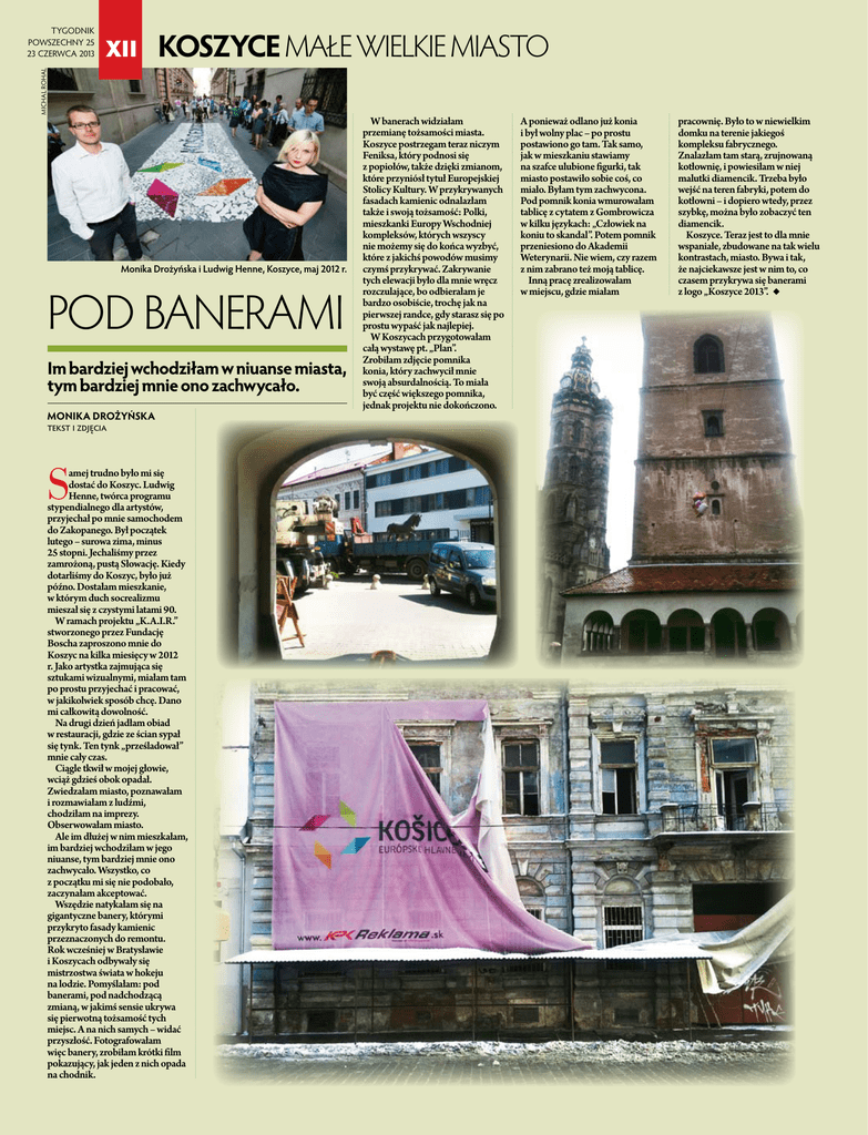 XII koszyce małe wielkie miasto MICHAL ROHAL Tygodnik powszechny 25 23 czerwca 2013 Monika Drożyńska i Ludwig Henne, Koszyce, maj 2012 r. Pod banerami Im bardziej wchodziłam w niuanse miasta, tym bardziej mnie ono zachwycało. Monika Drożyńska tekst i zdjęcia S amej trudno było mi się dostać do Koszyc. Ludwig Henne, twórca programu stypendialnego dla artystów, przyjechał po mnie samochodem do Zakopanego. Był początek lutego – surowa zima, minus 25 stopni. Jechaliśmy przez zamrożoną, pustą Słowację. Kiedy dotarliśmy do Koszyc, było już późno. Dostałam mieszkanie, w którym duch socrealizmu mieszał się z czystymi latami 90. W ramach projektu „K.A.I.R.” stworzonego przez Fundację Boscha zaproszono mnie do Koszyc na kilka miesięcy w 2012 r. Jako artystka zajmująca się sztukami wizualnymi, miałam tam po prostu przyjechać i pracować, w jakikolwiek sposób chcę. Dano mi całkowitą dowolność. Na drugi dzień jadłam obiad w restauracji, gdzie ze ścian sypał się tynk. Ten tynk „prześladował” mnie cały czas. Ciągle tkwił w mojej głowie, wciąż gdzieś obok opadał. Zwiedzałam miasto, poznawałam i rozmawiałam z ludźmi, chodziłam na imprezy. Obserwowałam miasto. Ale im dłużej w nim mieszkałam, im bardziej wchodziłam w jego niuanse, tym bardziej mnie ono zachwycało. Wszystko, co z początku mi się nie podobało, zaczynałam akceptować. Wszędzie natykałam się na gigantyczne banery, którymi przykryto fasady kamienic przeznaczonych do remontu. Rok wcześniej w Bratysławie i Koszycach odbywały się mistrzostwa świata w hokeju na lodzie. Pomyślałam: pod banerami, pod nadchodzącą zmianą, w jakimś sensie ukrywa się pierwotną tożsamość tych miejsc. A na nich samych – widać przyszłość. Fotografowałam więc banery, zrobiłam krótki film pokazujący, jak jeden z nich opada na chodnik. W banerach widziałam przemianę tożsamości miasta. Koszyce postrzegam teraz niczym Feniksa, który podnosi się z popiołów, także dzięki zmianom, które przyniósł tytuł Europejskiej Stolicy Kultury. W przykrywanych fasadach kamienic odnalazłam także i swoją tożsamość: Polki, mieszkanki Europy Wschodniej kompleksów, których wszyscy nie możemy się do końca wyzbyć, które z jakichś powodów musimy czymś przykrywać. Zakrywanie tych elewacji było dla mnie wręcz rozczulające, bo odbierałam je bardzo osobiście, trochę jak na pierwszej randce, gdy starasz się po prostu wypaść jak najlepiej. W Koszycach przygotowałam całą wystawę pt. „Plan”. Zrobiłam zdjęcie pomnika konia, który zachwycił mnie swoją absurdalnością. To miała być część większego pomnika, jednak projektu nie dokończono. A ponieważ odlano już konia i był wolny plac – po prostu postawiono go tam. Tak samo, jak w mieszkaniu stawiamy na szafce ulubione figurki, tak miasto postawiło sobie coś, co miało. Byłam tym zachwycona. Pod pomnik konia wmurowałam tablicę z cytatem z Gombrowicza w kilku językach: „Człowiek na koniu to skandal”. Potem pomnik przeniesiono do Akademii Weterynarii. Nie wiem, czy razem z nim zabrano też moją tablicę. Inną pracę zrealizowałam w miejscu, gdzie miałam pracownię. Było to w niewielkim domku na terenie jakiegoś kompleksu fabrycznego. Znalazłam tam starą, zrujnowaną kotłownię, i powiesiłam w niej malutki diamencik. Trzeba było wejść na teren fabryki, potem do kotłowni – i dopiero wtedy, przez szybkę, można było zobaczyć ten diamencik. Koszyce. Teraz jest to dla mnie wspaniałe, zbudowane na tak wielu kontrastach, miasto. Bywa i tak, że najciekawsze jest w nim to, co czasem przykrywa się banerami z logo „Koszyce 2013”. h