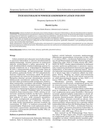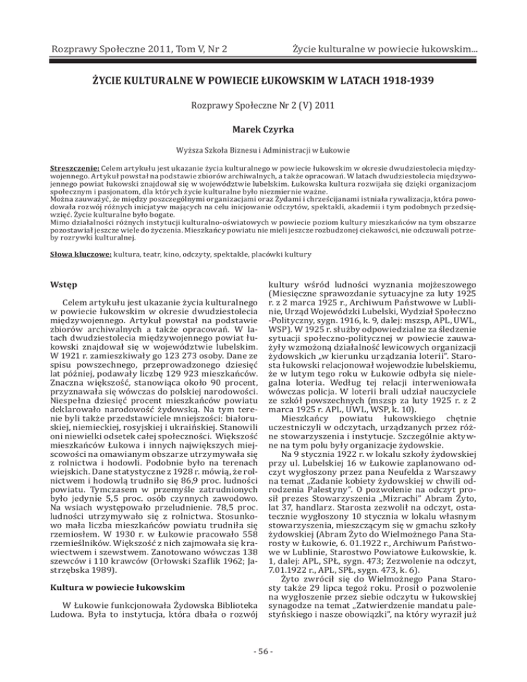 Rozprawy Społeczne 2011, Tom V, Nr 2 Życie kulturalne w powiecie łukowskim... ŻYCIE KULTURALNE W POWIECIE ŁUKOWSKIM W LATACH 1918-1939 Rozprawy Społeczne Nr 2 (V) 2011 Marek Czyrka Wyższa Szkoła Biznesu i Administracji w Łukowie Streszczenie: Celem artykułu jest ukazanie życia kulturalnego w powiecie łukowskim w okresie dwudziestolecia międzywojennego. Artykuł powstał na podstawie zbiorów archiwalnych, a także opracowań. W latach dwudziestolecia międzywojennego powiat łukowski znajdował się w województwie lubelskim. Łukowska kultura rozwijała się dzięki organizacjom społecznym i pasjonatom, dla których życie kulturalne było niezmiernie ważne. Można zauważyć, że między poszczególnymi organizacjami oraz Żydami i chrześcijanami istniała rywalizacja, która powodowała rozwój różnych inicjatyw mających na celu inicjowanie odczytów, spektakli, akademii i tym podobnych przedsięwzięć. Życie kulturalne było bogate. Mimo działalności różnych instytucji kulturalno-oświatowych w powiecie poziom kultury mieszkańców na tym obszarze pozostawiał jeszcze wiele do życzenia. Mieszkańcy powiatu nie mieli jeszcze rozbudzonej ciekawości, nie odczuwali potrzeby rozrywki kulturalnej. Słowa kluczowe: kultura, teatr, kino, odczyty, spektakle, placówki kultury Wstęp Celem artykułu jest ukazanie życia kulturalnego w powiecie łukowskim w okresie dwudziestolecia międzywojennego. Artykuł powstał na podstawie zbiorów archiwalnych a także opracowań. W latach dwudziestolecia międzywojennego powiat łukowski znajdował się w województwie lubelskim. W 1921 r. zamieszkiwały go 123 273 osoby. Dane ze spisu powszechnego, przeprowadzonego dziesięć lat później, podawały liczbę 129 923 mieszkańców. Znaczna większość, stanowiąca około 90 procent, przyznawała się wówczas do polskiej narodowości. Niespełna dziesięć procent mieszkańców powiatu deklarowało narodowość żydowską. Na tym terenie byli także przedstawiciele mniejszości: białoruskiej, niemieckiej, rosyjskiej i ukraińskiej. Stanowili oni niewielki odsetek całej społeczności. Większość mieszkańców Łukowa i innych największych miejscowości na omawianym obszarze utrzymywała się z rolnictwa i hodowli. Podobnie było na terenach wiejskich. Dane statystyczne z 1928 r. mówią, że rolnictwem i hodowlą trudniło się 86,9 proc. ludności powiatu. Tymczasem w przemyśle zatrudnionych było jedynie 5,5 proc. osób czynnych zawodowo. Na wsiach występowało przeludnienie. 78,5 proc. ludności utrzymywało się z rolnictwa. Stosunkowo mała liczba mieszkańców powiatu trudniła się rzemiosłem. W 1930 r. w Łukowie pracowało 558 rzemieślników. Większość z nich zajmowała się krawiectwem i szewstwem. Zanotowano wówczas 138 szewców i 110 krawców (Orłowski Szaflik 1962; Jastrzębska 1989). Kultura w powiecie łukowskim W Łukowie funkcjonowała Żydowska Biblioteka Ludowa. Była to instytucja, która dbała o rozwój kultury wśród ludności wyznania mojżeszowego (Miesięczne sprawozdanie sytuacyjne za luty 1925 r. z 2 marca 1925 r., Archiwum Państwowe w Lublinie, Urząd Wojewódzki Lubelski, Wydział Społeczno -Polityczny, sygn. 1916, k. 9, dalej: mszsp, APL, UWL, WSP). W 1925 r. służby odpowiedzialne za śledzenie sytuacji społeczno-politycznej w powiecie zauważyły wzmożoną działalność lewicowych organizacji żydowskich „w kierunku urządzania loterii”. Starosta łukowski relacjonował wojewodzie lubelskiemu, że w lutym tego roku w Łukowie odbyła się nielegalna loteria. Według tej relacji interweniowała wówczas policja. W loterii brali udział nauczyciele ze szkół powszechnych (mszsp za luty 1925 r. z 2 marca 1925 r. APL, UWL, WSP, k. 10). Mieszkańcy powiatu łukowskiego chętnie uczestniczyli w odczytach, urządzanych przez różne stowarzyszenia i instytucje. Szczególnie aktywne na tym polu były organizacje żydowskie. Na 9 stycznia 1922 r. w lokalu szkoły żydowskiej przy ul. Lubelskiej 16 w Łukowie zaplanowano odczyt wygłoszony przez pana Neufelda z Warszawy na temat „Zadanie kobiety żydowskiej w chwili odrodzenia Palestyny”. O pozwolenie na odczyt prosił prezes Stowarzyszenia „Mizrachi” Abram Żyto, lat 37, handlarz. Starosta zezwolił na odczyt, ostatecznie wygłoszony 10 stycznia w lokalu własnym stowarzyszenia, mieszczącym się w gmachu szkoły żydowskiej (Abram Żyto do Wielmożnego Pana Starosty w Łukowie, 6. 01.1922 r., Archiwum Państwowe w Lublinie, Starostwo Powiatowe Łukowskie, k. 1, dalej: APL, SPŁ, sygn. 473; Zezwolenie na odczyt, 7.01.1922 r., APL, SPŁ, sygn. 473, k. 6). Żyto zwrócił się do Wielmożnego Pana Starosty także 29 lipca tegoż roku. Prosił o pozwolenie na wygłoszenie przez siebie odczytu w łukowskiej synagodze na temat „Zatwierdzenie mandatu palestyńskiego i nasze obowiązki”, na który wyraził już - 56 - Rozprawy Społeczne 2011, Tom V, Nr 2 zgodę prezes Zarządu Gminy Żydowskiej w Łukowie (Abram Żyto do Starosty w Łukowie, APL, SPŁ, 29.07.1922 r., k.15). 16 sierpnia 1922 r. w Łukowie miał miejsce odczyt M. Zurmana z Zawiercia z żydowskiego Stronnictwa Ortodoksów. Według sprawozdania „przemawiał w duchu religijnym i o wychowaniu młodzieży żydowskiej i dawał przykłady z Talmudu tyczące się młodzieży i ich wychowania. Zgromadziło się wówczas 500 słuchaczy”. Kolejne dwa odczyty tego mówcy, zaplanowane na 17 i 20 sierpnia nie doszły do skutku, gdyż zabrakło słuchaczy. Według sprawozdania „22 sierpnia Zurman przemawiał także w duchu religijnym do ojców i matek, aby dopilnowali dzieci i wychowywali je podług zasad w Talmudzie na przyszłych obywateli żydowskich. Zaapelował o nieposyłanie dzieci do obcych szkół, ponieważ obce szkoły nie mogą wychowywać dzieci w duchu religijnym żydowskim. Na tle antypaństwowym nikt nie przemawiał”. Zgromadziło się wówczas 300 osób (Sprawozdanie starszego posterunkowego z 23
