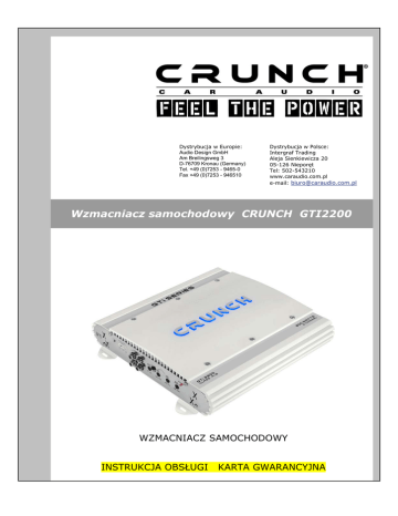 Dystrybucja w Europie: Audio Design GmbH Am Breilingsweg 3 D-76709 Kronau (Germany) Tel. +49 (0)7253 - 9465-0 Fax +49 (0)7253 - 946510 Dystrybucja w Polsce: Intergraf Trading Aleja Sienkiewicza 20 05-126 Nieporęt Tel: 502-543210 www.caraudio.com.pl e-mail: [email protected] Wzmacniacz samochodowy CRUNCH GTI2200 WZMACNIACZ SAMOCHODOWY INSTRUKCJA OBSŁUGI KARTA GWARANCYJNA Recykling sprzętu elektronicznego Strona 16 WZMACNIACZ SAMOCHODOWY INSTRUKCJA OBSŁUGI Dystrybucja w Europie: Audio Design GmbH Am Breilingsweg 3 D-76709 Kronau (Germany) Tel. +49 (0)7253 - 9465-0 Fax +49 (0)7253 - 946510 Dystrybucja w Polsce: Intergraf Trading Aleja Sienkiewicza 20 05-126 Nieporęt Tel: 502-543210 e-mail: [email protected] Wzmacniacz samochodowy CRUNCH GTI2200 Dziękujemy za zakup wzmacniacza samochodowego marki CRUNCH. Mamy nadzieję, że użytkowanie tego produktu sprawi Państwu wiele radości i spełni Państwa oczekiwania. Przed przystąpieniem do użytkowania proszę zapoznać się z niniejszą instrukcją. Wszystkich zainteresowanych poszerzeniem wiedzy na temat sprzętu car audio zapraszamy do odwiedzenia strony internetowej www.caraudio.com.pl WAŻNE INFORMACJE BARDZO WAŻNE ZALECENIA DOTYCZĄCE INSTALACJI I EKSPLOATACJI W NOWYCH SAMOCHODACH W pojazdach z ostatnich lat produkcji – od około 2002 – stosowane są komputerowe systemy sterowania i diagnostyki, jak CAN-BUS lub interfejsy MOST-BUS. Podczas instalacji wzmacniacza nowe urządzenie pojawia się w 12-Voltowym systemie elektrycznym, które może w kilku przypadkach powodować wyświetlanie komunikatów o błędach lub może przerwać pracę fabrycznego systemu diagnostycznego w rezultacie pojawienia się wysokich poziomów sygnału i większego zużycia energii. W związku z tym, w zależności od modelu i producenta, niektóre systemy wspomagające bezpieczną jazdę lub odpowiedzialne za bezpieczeństwo mogą zostać przerwane. Jeżeli planujesz używanie wzmacniacza w samochodzie i posiadasz samochód wyposażony w komputerowe systemy sterowania i diagnostyki, stosuj się do następujących zaleceń: − − − − powierz instalację profesjonalnej firmie, która zajmuje się profesjonalnym instalowaniem sprzętu lub usługami naprawczymi i konserwacyjnymi i jest obeznana z systemem elektrycznym pojazdu. po instalacji zleć przeprowadzenie komputerowego sprawdzenia poprawności działania systemu w celu wykrycia ewentualnych nieprawidłowości lub komunikatów o błędach. jeżeli praca systemu elektrycznego została zakłócona przez instalację wzmacniacza, zainstalowanie kondensatora może ustabilizować układ elektryczny i zapewnić prawidłowe i stabilne działanie. Najlepszym rozwiązaniem jest integracja drugiego systemu elektrycznego 12V zasilanego z niezależnego akumulatora do zasilenia całego systemu audio. W RAZIE JAKICHKOLWIEK WĄTPLIWOŚCI SKONSULTUJ SIĘ Z WYSPECJALIZOWANĄ FIRMĄ USŁUGOWĄ - 1 - Wzmacniacz samochodowy CRUNCH GTI2200 Informacje dotyczące bezpieczeństwa Urządzenie zostało zaprojektowane i wyprodukowane w sposób zapewniający bezpieczeństwo użytkowania. Jednakże niewłaściwa obsługa może spowodować porażenie elektryczne, pożar lub inne uszkodzenia. Podczas użytkowania prosimy o przestrzeganie poniższych zasad: Wzmacniacz przystosowany jest do pracy wyłącznie z zasilaniem 12V z ujemnym biegunem na masie samochodu. Z uwagi na zagrożenie pożarowe, zagrożenie porażenia prądem elektrycznym i inne szkody zabronione jest używanie urządzenia w pojazdach z innym zasilaniem. Nie należy używać wzmacniacza, gdy napięcie akumulatora jest za niskie, grozi to uszkodzeniem urządzenia. Zabronione jest wykonywanie jakichkolwiek operacji na systemie audio, które wymagają dłuższej uwagi i odwracają uwagę kierowcy od prowadzenia pojazdu. Aby uniknąć zagrożenia wypadkiem czynności te należy dokonywać tylko podczas postoju pojazdu w bezpiecznym miejscu. Głośność systemu podczas jazdy powinna być tak dobrana, by nie zakłócała uwagi kierowcy i jego kontaktu z otoczeniem. Wysokiej jakości systemy audio mogą generować wysokie ciśnienie akustyczne. Długotrwałe słuchanie muzyki na ekstremalnie wysokim poziomie głośności może spowodować utratę zdolności słuchowych i zaburzenia słuchowe. Poziom głośności słuchanej muzyki nie może osłabiać odbierania sygnałów ostrzegawczych w ruchu na drodze. W interesie wspólnego bezpieczeństwa zalecamy słuchanie muzyki na niższych poziomach głośności podczas jazdy, aby uniknąć ryzyka wypadku. Przed przystąpieniem do instalacji należy odłączyć co najmniej ujemny biegun akumulatora. Patrz rozdział Instalacja. Wzmacniacz powinien być zamontowany w miejscu pozbawionym kurzu i zapewniającym dobrą wentylację, zabezpieczonym przed działaniem wilgoci lub dostaniem się deszczu. Aby uniknąć zwarcia elektrycznego należy chronić wzmacniacz przed dostaniem się jakiegokolwiek płynu do jego wnętrza. Nie należy wrzucać jakichkolwiek przedmiotów do wewnątrz wzmacniacza przez otwory wentylacyjne czy jakiekolwiek inne otwory w urządzeniu. Wzmacniacz nie może być przykryty lub zamontowany w miejscu uniemożliwiającym cyrkulację powietrza. W szczególnych przypadkach należy zamontować wentylatory chłodzące. Kumulacja ciepła we wzmacniaczu stwarza zagrożenie pożarem. Wewnątrz wzmacniacza występuje niebezpieczne napięcie. Nie należy otwierać urządzenia, gdyż grozi to porażeniem i/lub uszkodzeniem wzmacniacza. Otwieranie urządzenia przez osoby niepowołane powoduje utratę gwarancji. W przypadku przepalenia się bezpieczników sprawdzić poprawność instalacji systemu. Wymienić bezpiecznik na nowy o tym samym nominale. - 2 - Wzmacniacz samochodowy CRUNCH GTI2200 Informacje dotyczące bezpieczeństwa Nie używaj urządzenia, jeżeli wykazuje jakiekolwiek błędy w działaniu. Sprawdź możliwą przyczynę w rozdziale Rozwiązywanie problemów. W razie powtarzającego się problemu należy