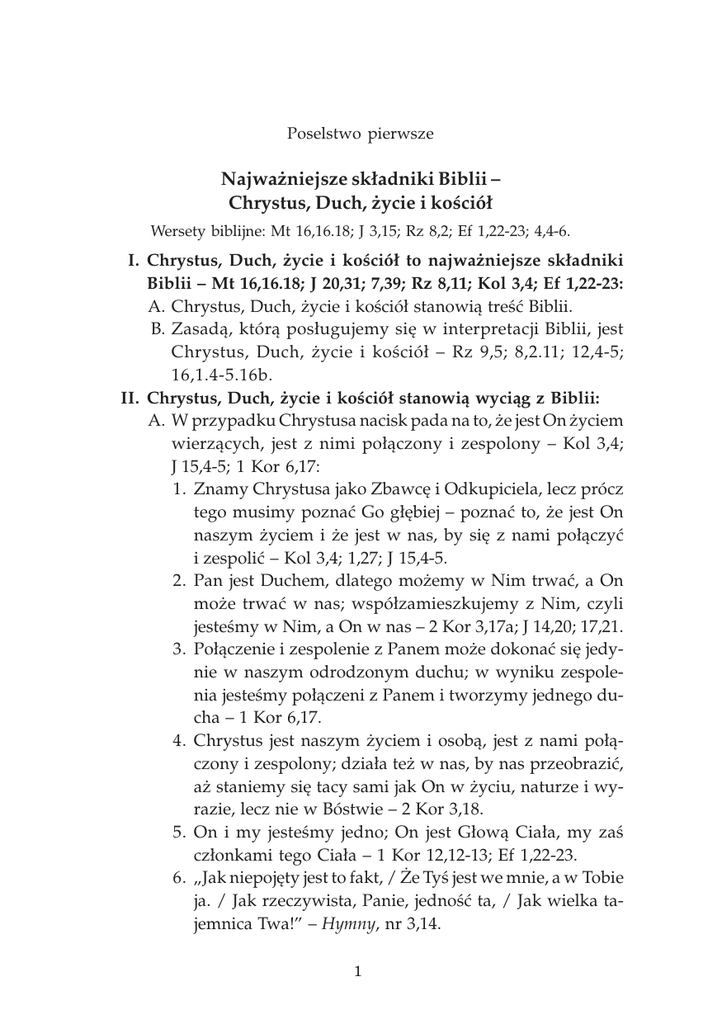 Poselstwo pierwsze Najważniejsze składniki Biblii – Chrystus, Duch, życie i kościół Wersety biblijne: Mt 16,16.18; J 3,15; Rz 8,2; Ef 1,22-23; 4,4-6. I. Chrystus, Duch, życie i kościół to najważniejsze składniki Biblii – Mt 16,16.18; J 20,31; 7,39; Rz 8,11; Kol 3,4; Ef 1,22-23: A. Chrystus, Duch, życie i kościół stanowią treść Biblii. B. Zasadą, którą posługujemy się w interpretacji Biblii, jest Chrystus, Duch, życie i kościół – Rz 9,5; 8,2.11; 12,4-5; 16,1.4-5.16b. II. Chrystus, Duch, życie i kościół stanowią wyciąg z Biblii: A. W przypadku Chrystusa nacisk pada na to, że jest On życiem wierzących, jest z nimi połączony i zespolony – Kol 3,4; J 15,4-5; 1 Kor 6,17: 1. Znamy Chrystusa jako Zbawcę i Odkupiciela, lecz prócz tego musimy poznać Go głębiej – poznać to, że jest On naszym życiem i że jest w nas, by się z nami połączyć i zespolić – Kol 3,4; 1,27; J 15,4-5. 2. Pan jest Duchem, dlatego możemy w Nim trwać, a On może trwać w nas; współzamieszkujemy z Nim, czyli jesteśmy w Nim, a On w nas – 2 Kor 3,17a; J 14,20; 17,21. 3. Połączenie i zespolenie z Panem może dokonać się jedynie w naszym odrodzonym duchu; w wyniku zespolenia jesteśmy połączeni z Panem i tworzymy jednego ducha – 1 Kor 6,17. 4. Chrystus jest naszym życiem i osobą, jest z nami połączony i zespolony; działa też w nas, by nas przeobrazić, aż staniemy się tacy sami jak On w życiu, naturze i wyrazie, lecz nie w Bóstwie – 2 Kor 3,18. 5. On i my jesteśmy jedno; On jest Głową Ciała, my zaś członkami tego Ciała – 1 Kor 12,12-13; Ef 1,22-23. 6. „Jak niepojęty jest to fakt, / Że Tyś jest we mnie, a w Tobie ja. / Jak rzeczywista, Panie, jedność ta, / Jak wielka tajemnica Twa!” – Hymny, nr 3,14. 1 B. W przypadku Ducha nacisk pada na to, że Boży Duch Święty został złożony z boskości Chrystusa, Jego człowieczeństwa, ukrzyżowania i zmartwychwstania, dzięki czemu stał się złożonym, życiodajnym, zamieszkującym, uświęcającym, przeobrażającym i siedmiokrotnie wzmocnionym Duchem – Wj 30,23-25; 1 Kor 15,45b; Rz 8,11; 15,16b; 2 Kor 3,18; Obj 4,5: 1. Duch jest zwieńczeniem Trójjedynego Boga, którzy przeszedł przez rozliczne procesy; w Duchu znajdują się pierwiastki Ojca, Syna i Ducha – Mt 1,18.20; Łk 1,35; Hbr 9,14; Rz 8,11. 2. Obecnie Duch jest złożonym Duchem (Wj 30,23-25), który składa się z Ducha Bożego i dwóch natur Chrystusa – boskiej i ludzkiej – z Jego śmierci i zmartwychwstania, dzięki czemu jest złożonym, życiodajnym (1 Kor 15,45b), zamieszkującym (Rz 8,11), uświęcającym (15,16b) i przeobrażającym Duchem (2 Kor 3,18). 3. Taki Duch ma obfity zasób, a nawet sam jest tym obfitym zasobem, byśmy tego doświadczali i z tego korzystali – Flp 1,19. 4. W aspekcie ekonomicznym złożony Duch stał się siedmioma Duchami Bożymi i zaopatruje nas siedmiokrotnie mocniej, byśmy mogli zrealizować Bożą ekonomię wobec kościoła w tym wieku upadku – Obj 1,4; 3,1; 4,5; 5,6. C. W przypadku życia nacisk pada na to, że Bóg w Chrystusie jako Duch rzeczywistości jest życiem wierzących, dzięki czemu mogą oni wyrażać przetworzonego Trójjedynego Boga – 1 Kor 1,30; J 14,17; Flp 1,19-21a: 1. Życiem jest Duch, który jest samym Trójjedynym Bogiem; życiem jest też Chrystus – Rz 8,2; J 11,25; 14,6; Kol 3,4. 2. Bóg dał nam życie wieczne, a życie to jest w Jego Synu; jeśli mamy Syna, mamy życie – 1 J 5,11-12. 3. Bóg w Chrystusie przeszedł przez rozliczne procesy i został zwieńczony jako Duch; teraz jako Duch rzeczywistości jest życiem dla wierzących, dzięki czemu mogą oni Go wyrażać jako przetworzonego Trójjedynego Boga – J 7,39; 14,17.19b. 2 4. Gdy uwierzyliśmy w Chrystusa, Syna Bożego, wszedł On w nas i stał się naszym życiem oraz osobą, żyje i porusza się wraz z nami – 3,15-16; Ga 2,20. D. W przypadku kościoła nacisk pada na to, że wierzący na podłożu jedności są świadectwem Ciała Chrystusa – Ef 1,23; 4,1-6: 1. Kościół tworzą ci, których Bóg wywołał ze świata; Bóg wywołał nas z każdego plemienia, języka, ludu i narodu i zgromadził razem jako kościół – Mt 16,18; 18,17; Obj 5,9; 7,9. 2. Bóg zrodził nas, wierzących w Chrystusa, swoim życiem, więc mamy w sobie boskie życie; zostaliśmy odrodzeni i staliśmy się ludem królestwa niebios oraz braćmi i siostrami w Jego powszechnej rodzinie – J 1,12-13; 3,3.5.15; Ef 2,19. 3. Kościół to coś utworzonego przez życie, to organizm, który ma życie i osobę; tym życiem i osobą jest sam Trójjedyny Bóg, który stanowi pierwiastek jedności kościoła – 4,3-6. 4. Powszechne Ciało Chrystusa wyraża się w postaci kościołów miejscowych; podłoże kościoła jest jednością Ciała Chrystusa – 1 Kor 12,12-13.27; 1,2; Ef 1,23; 4,3-6. 5. Wszyscy zostaliśmy ochrzczeni w jedno Ciało i mamy jednego Ducha, jednego Pana i jednego Boga i Ojca; teraz stójmy na podłożu jedności na jedno świadectwo Ciała Chrystusa i prowadźmy praktyczne życie kościoła – 1 Kor 12,13; Ef 4,4-6; Obj 1,11. III. Przedstawiajmy wszelkie prawdy biblijne, akcentując Chrystusa, Ducha, życie i kościół – 2 Tm 2,15: A. Każde poselstwo czy przedstawienie prawdy zawartej w Biblii bez Chrystusa, Ducha, życia i kościoła jest pustą skorupą, w której nic nie ma – 1 Tm 1,6-7. B. Zawsze bezpiecznie jest przedstawiać prawdy biblijne, akcentując Chrystusa, Ducha, życie i kościół; np. prawdę na temat świętości powinniśmy przedstawiać, opierając się na Chrystusie, Duchu, życiu i kościele – 1 Kor 1,30; Rz 6,22; Ef 5,26. 3 Poselstwo drugie Doświadczać zamieszkującego Chrystusa Wersety biblijne: J 14,16-18.20; Rz 8,9-10; Ga 2,20a; 4,19; Ef 3,17a. I. Chrystus jest tajemnicą i to, że w nas zamieszkuje, również jest tajemnicą – Kol 1,27: A. Zamieszkiwanie w nas Chrystusa jest dla nas bardzo realne i bliskie, gdyż odbywa się w nas i ściśle 