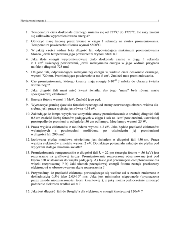 Fizyka współczesna 1 1 1. Temperatura ciała doskonale czarnego zmienia się od 727oC do 1727oC. Ile razy zmieni się całkowita wypromieniowana energia? 2. Obliczyć masę traconą przez Słońce w ciągu 1 sekundy na skutek promieniowania. Temperatura powierzchni Słońca wynosi 5800oC. 3. W jakiej części widma leży długość fali odpowiadająca maksimum promieniowania Słońca, jeżeli temperatura jego powierzchni wynosi 5800 K? 4. Jaką ilość energii wypromieniowuje ciało doskonale czarne w ciągu 1 sekundy z 1 cm2 świecącej powierzchni, jeżeli maksymalna energia w jego widmie przypada na falę o długości 725 nm? 5. Długość fali, odpowiadająca maksymalnej energii w widmie ciała doskonale czarnego, wynosi 720 nm. Promieniująca powierzchnia ma 5 cm2. Znaleźć moc promieniowania. 6. Czy promieniowanie, którego kwanty mają energię 6⋅10-19 J należy do obszaru światła widzialnego? 7. Jaką długość fali musi mieć kwant światła, aby jego "masa" była równa masie spoczynkowej elektronu? 8. Energia fotonu wynosi 1 MeV. Znaleźć jego pęd. 9. Wyznaczyć granicę zjawiska fotoelektrycznego od strony czerwonego obszaru widma dla srebra, jeśli praca wyjścia jest równa 4,74 eV. 10. Zakładając że lampa wysyła we wszystkie strony promieniowanie o średniej długości fali 0.5µm znaleźć liczbę fotonów padających w ciągu 1 sek na 1cm2 powierzchni, ustawionej prostopadle do promieni w odległości 50 cm od lampy. Moc lampy wynosi 25 W. 11. Praca wyjścia elektronów z molibdenu wynosi 4.2 eV. Jaka będzie prędkość elektronów wylatujących z powierzchni molibdenu po oświetleniu jej promieniami o długości fali 200 nm? 12. Izolowana płytka metalowa oświetlona jest światłem o długości fali 450 nm. Praca wyjścia elektronów z metalu wynosi 2 eV. Do jakiego potencjału naładuje się płytka pod wpływem stałego działania światła? 13. Promieniowanie rentgenowskie o długości fali λ = 22 pm (energia fotonu = 56 keV) jest rozpraszane na grafitowej tarczy. Promieniowanie rozproszone obserwowane jest pod kątem 850 w stosunku do wiązki padającej. A) Jakie jest przesunięcie comptonowskie dla wiązki rozproszonej ? b) Jaki ułamek początkowej energii fotonu zostaje przekazany elektronowi w obserwowanym akcie rozproszenia ? 14. Przypuśćmy, że prędkość elektronu poruszającego się wzdłuż osi x została zmierzona z dokładnością 0,5% jako 2,05·106 m/s. Jaka jest minimalna niepewność (wyznaczona przez zasadę nieoznaczoności teorii kwantowej ), z jaką można jednocześnie zmierzyć położenie elektronu wzdłuż osi x ? 15. Jaka jest długość fali de Broglie’a dla elektronu o energii kinetycznej 120eV ? Fizyka współczesna 1 2 16. Dla powierzchni cezu oświetlonej promieniowaniem o długości fali równej 360 nm potencjał hamujący jest równy1,47 V. Wyznaczy granicę zjawiska fotoelektrycznego od strony czerwonego obszaru widma dla cezu. 17. O ile należy zwiększyć temperaturę ciała doskonale czarnego, aby całkowita emitancja 18. 19. 20. 21. 22. 23. 24. 25. 26. 27. 28. 29. 30. 31. 32. 33. 34. 35. 36. 37. energetyczna jego powierzchni wzrosła 200 razy ? Temperatura ciała doskonale czarnego wynosi 527º C. Maksimum promieniowania ciała doskonale czarnego wypada przy długości fali równej 250 nm. Dla jakiej długości fali wypadnie maksimum promieniowania, jeżeli temperaturę ciała podwyższyć o 500C ? Izolowana kulka metalowa o średnicy 2 cm oświetlona jest światłem o długości faki 0,4 µm. W wyniku zjawiska fotoelektrycznego kulka traci elektrony i ładuje się dodatnio. Do jakiego maksymalnego potencjału naładuje się kulka? Jaki ładunek zgromadzi się na kulce? Praca wyjścia elektronów z metalu wynosi 1,5 eV. Graniczna długość fali promieniowania wywołującego zjawiska fotoelektryczne w rubidzie wynosi 540 nm. Oblicz pracę wyjścia i maksymalną prędkość elektronów, jeżeli powierzchnia rubidu jest oświetlona światłem o długości fali 400 nm. Wiedząc, że praca wyjścia elektronu dla cezu wynosi 1,8 eV, oblicz maksymalną prędkość wybijanych elektronów przy oświetlaniu płytki cezowej monochromatycznym światłem o długości fali równej 560 nm. Oblicz długość fali de Broglie’a protonów przyspieszonych napięciem 50 kV (przypadek nierelatywistyczny). Dwukrotne zwiększenie napięcia na lampie rentgenowskiej powoduje zmianę długości fali granicy krótkofalowej o 0,1 nm. Oblicz wartość tej granicy dla napięcia początkowego. Zaniedbując efekty relatywistyczne, oblicz stosunek długości fali de Broglie’a elektronów przyspieszonych napięciem 2 kV, do minimalnej długości fali elektromagnetycznej, powstającej w wyniku hamowania tychże elektronów na anodzie. Oblicz prędkość odrzutu atomu wodoru w wyniku przejścia elektronu z orbity drugiej na pierwszą. Dana jest energia stanu podstawowego równa –13,6 eV. Wyprowadź wzór na poziomy energetyczne dla modelu Bohra atomu wodoru. Korzystając z teorii Bohra oblicz promień pierwszej orbity Bohra oraz porównaj prędkość elektronów na tej orbicie z prędkością światła. Czy dla takich elektronów konieczne są poprawki relatywistyczne? Obliczyć długość fali de Broglie’a protonu o energii kinetycznej E = 5 MeV. Obliczyć energię i pęd neutronu , któremu odpowiada długość fali de Broglie’a λ = 2,56·10-12 cm. Obliczyć długość fali de Broglie’a dla samochodu o masie 2t poruszającego się z prędkością 100 km/h. Energia kinetyczna nukleonu wewnątrz jądra jest oceniana na ok. 25 MeV. Obliczyć stosunek długości fali de Broglie’a takiego nukleonu do promienia jądra o liczbie masowej A = 64. Jaki jest stosunek prędkości protonu i cząstki α, jeżeli długości fal de Broglie’a dla tych cząstek są takie same ? Przyjmujemy, że obie cząstki są nierelatywistyczne. Jaka zależność występuje pomiędzy prędkością v nierelatywistycznej cząstki, a prędkością fazową vf o