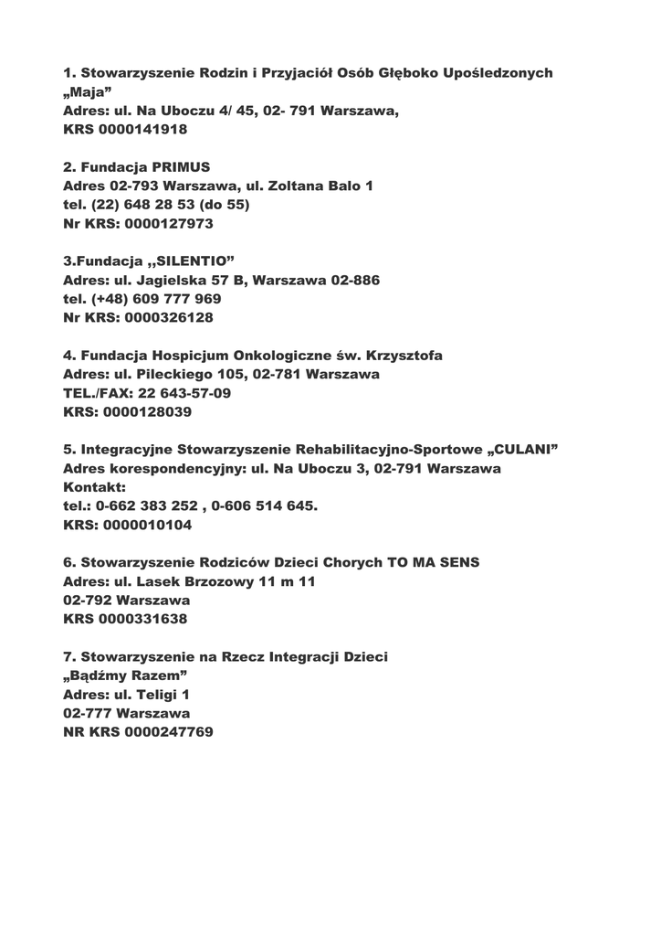 1. Stowarzyszenie Rodzin i Przyjaciół Osób Głęboko Upośledzonych „Maja” Adres: ul. Na Uboczu 4/ 45, 02- 791 Warszawa, KRS 0000141918 2. Fundacja PRIMUS Adres 02-793 Warszawa, ul. Zoltana Balo 1 tel. (22) 648 28 53 (do 55) Nr KRS: 0000127973 3.Fundacja ,,SILENTIO’’ Adres: ul. Jagielska 57 B, Warszawa 02-886 tel. (+48) 609 777 969 Nr KRS: 0000326128 4. Fundacja Hospicjum Onkologiczne św. Krzysztofa Adres: ul. Pileckiego 105, 02-781 Warszawa TEL./FAX: 22 643-57-09 KRS: 0000128039 5. Integracyjne Stowarzyszenie Rehabilitacyjno-Sportowe „CULANI” Adres korespondencyjny: ul. Na Uboczu 3, 02-791 Warszawa Kontakt: tel.: 0-662 383 252 , 0-606 514 645. KRS: 0000010104 6. Stowarzyszenie Rodziców Dzieci Chorych TO MA SENS Adres: ul. Lasek Brzozowy 11 m 11 02-792 Warszawa KRS 0000331638 7. Stowarzyszenie na Rzecz Integracji Dzieci „Bądźmy Razem” Adres: ul. Teligi 1 02-777 Warszawa NR KRS 0000247769