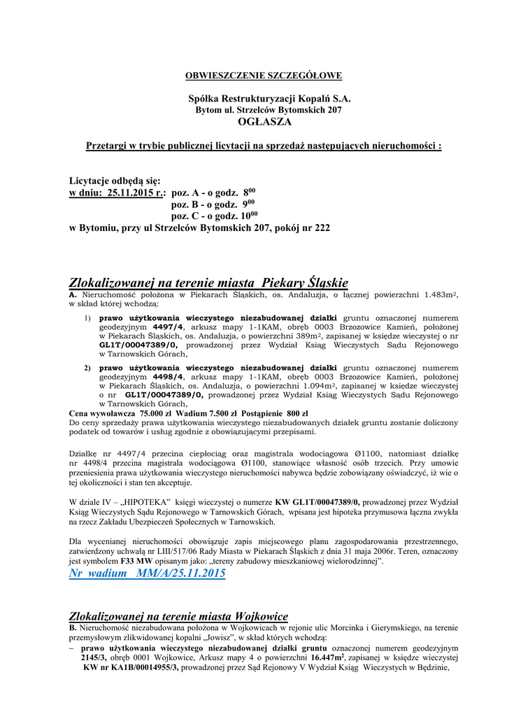 OBWIESZCZENIE SZCZEGÓŁOWE Spółka Restrukturyzacji Kopalń S.A. Bytom ul. Strzelców Bytomskich 207 OGŁASZA Przetargi w trybie publicznej licytacji na sprzedaż następujących nieruchomości : Licytacje odbędą się: w dniu: 25.11.2015 r.: poz. A - o godz. 800 poz. B - o godz. 900 poz. C - o godz. 1000 w Bytomiu, przy ul Strzelców Bytomskich 207, pokój nr 222 Zlokalizowanej na terenie miasta Piekary Śląskie A. Nieruchomość położona w Piekarach Śląskich, os. Andaluzja, o łącznej powierzchni 1.483m2, w skład której wchodzą: 1) prawo użytkowania wieczystego niezabudowanej działki gruntu oznaczonej numerem geodezyjnym 4497/4, arkusz mapy 1-1KAM, obręb 0003 Brzozowice Kamień, położonej w Piekarach Śląskich, os. Andaluzja, o powierzchni 389m 2, zapisanej w księdze wieczystej o nr GL1T/00047389/0, prowadzonej przez Wydział Ksiąg Wieczystych Sądu Rejonowego w Tarnowskich Górach, 2) prawo użytkowania wieczystego niezabudowanej działki gruntu oznaczonej numerem geodezyjnym 4498/4, arkusz mapy 1-1KAM, obręb 0003 Brzozowice Kamień, położonej w Piekarach Śląskich, os. Andaluzja, o powierzchni 1.094m 2, zapisanej w księdze wieczystej o nr GL1T/00047389/0, prowadzonej przez Wydział Ksiąg Wieczystych Sądu Rejonowego w Tarnowskich Górach, Cena wywoławcza 75.000 zł Wadium 7.500 zł Postąpienie 800 zł Do ceny sprzedaży prawa użytkowania wieczystego niezabudowanych działek gruntu zostanie doliczony podatek od towarów i usług zgodnie z obowiązującymi przepisami. Działkę nr 4497/4 przecina ciepłociąg oraz magistrala wodociągowa Ø1100, natomiast działkę nr 4498/4 przecina magistrala wodociągowa Ø1100, stanowiące własność osób trzecich. Przy umowie przeniesienia prawa użytkowania wieczystego nieruchomości nabywca będzie zobowiązany oświadczyć, iż wie o tej okoliczności i stan ten akceptuje. W dziale IV – „HIPOTEKA” księgi wieczystej o numerze KW GL1T/00047389/0, prowadzonej przez Wydział Ksiąg Wieczystych Sądu Rejonowego w Tarnowskich Górach, wpisana jest hipoteka przymusowa łączna zwykła na rzecz Zakładu Ubezpieczeń Społecznych w Tarnowskich. Dla wycenianej nieruchomości obowiązuje zapis miejscowego planu zagospodarowania przestrzennego, zatwierdzony uchwałą nr LIII/517/06 Rady Miasta w Piekarach Śląskich z dnia 31 maja 2006r. Teren, oznaczony jest symbolem F33 MW opisanym jako: „tereny zabudowy mieszkaniowej wielorodzinnej”. Nr wadium MM/A/25.11.2015 Zlokalizowanej na terenie miasta Wojkowice B. Nieruchomość niezabudowana położona w Wojkowicach w rejonie ulic Morcinka i Gierymskiego, na terenie przemysłowym zlikwidowanej kopalni „Jowisz”, w skład których wchodzą: prawo użytkowania wieczystego niezabudowanej działki gruntu oznaczonej numerem geodezyjnym 2145/3, obręb 0001 Wojkowice, Arkusz mapy 4 o powierzchni 16.447m2, zapisanej w księdze wieczystej KW nr KA1B/00014955/3, prowadzonej przez Sąd Rejonowy V Wydział Ksiąg Wieczystych w Będzinie, prawo użytkowania wieczystego niezabudowanej działki gruntu oznaczonej numerem geodezyjnym 1096/5, obręb 0001 Wojkowice, Arkusz mapy 4 o powierzchni 3.007m2, zapisanej w księdze wieczystej KW nr KA1B/00014955/3, prowadzonej przez Sąd Rejonowy V Wydział Ksiąg Wieczystych w Będzinie, prawo użytkowania wieczystego ułamkowej części 81/100 niezabudowanej działki gruntu oznaczonej numerem geodezyjnym 1096/12, obręb 0001 Wojkowice, Arkusz mapy 4 o powierzchni całkowitej 721m2, zapisanej w księdze wieczystej KW nr KA1B/00041553/3, prowadzonej przez Sąd Rejonowy V Wydział Ksiąg Wieczystych w Będzinie(stanowiącej drogę dojazdową), Cena wywoławcza 61.000 zł Wadium 6.100 zł Postąpienie 700 zł Do ceny sprzedaży prawa użytkowania wieczystego ww. działek gruntu zostanie doliczony podatek od towarów i usług zgodnie z obowiązującymi przepisami. Działając zgodnie z art. 285 k.c., w związku z art. 287 k.c i art. 145 k.c. postanawia się ustanowić na niezabudowanej działce gruntu oznaczonej numerem geodezyjnym 1096/14 o powierzchni 761m2, położonej w Wojkowicach w rejonie ulic Morcinka i Gierymskiego, zapisanej w księdze wieczystej KW nr KA1B/00014955/3, prowadzonej przez Sąd Rejonowy V Wydział Ksiąg Wieczystych w Będzinie, nieodpłatną służebność gruntową polegającą na prawie przechodu i przejazdu przez działkę gruntu oznaczoną numerem geodezyjnym 1096/14 na rzecz każdoczesnych użytkowników wieczystych, właścicieli lub posiadaczy ww. działek gruntu oznaczonych numerami geodezyjnymi 2145/3, 1096/5 i udziału 81/100 w prawie użytkowania wieczystego działki gruntu 1096/12, położonych w Wojkowicach w rejonie ulic Morcinka i Gierymskiego. W dziale IV – „HIPOTEKA” ksiąg wieczystych KW nr KA1B/00014955/3 i KA1B/00041553/3, prowadzonych przez Sąd Rejonowy V Wydział Ksiąg Wieczystych w Będzinie – brak wpisu. W planie zagospodarowania przestrzennego miasta Wojkowice zatwierdzonego Uchwałą nr XXXVI/313/2013 z dnia 26.02.2013r, nieruchomości oznaczone są symbolem B2/1P opisanym jako „tereny zabudowy technicznoprodukcyjnej”. Nr wadium MM/B/25.11.2015 Zlokalizowanej na terenie miasta Sosnowca C. Prawo użytkowania wieczystego działki gruntu oznaczonej numerem geodezyjnym 601/33, obręb 0003 Zagórze, o powierzchni 57 m2 wraz z prawem własności budynku wymienników ciepła o powierzchni użytkowej 64,80 m2 i kubaturze 158,40 m3 o numerze inwentarzowym 101/300496, położonej w Sosnowcu w rejonie ulicy Pięknej, zapisanej w księdze wieczystej KW nr KA1S/00027488/8, prowadzonej przez Sąd Rejonowy w Sosnowcu – VI Wydział Ksiąg Wieczystych. Cena wywoławcza 9.500 zł Wadium 950 zł Postąpienie 100 zł Dostawa budynku, o którym mowa powyżej, zwolniona jest od podatku od towarów i usług zgodnie z art. 43 ust. 1 pkt. 10a ustawy o podatku od towarów i usług, w związku z art. 29 ust. 5 oraz § 13 ust. 1 pkt. 11 Roz. Ministra Finansów z dnia 04.04.2011 r. dostawa (zbycie) prawa wieczy