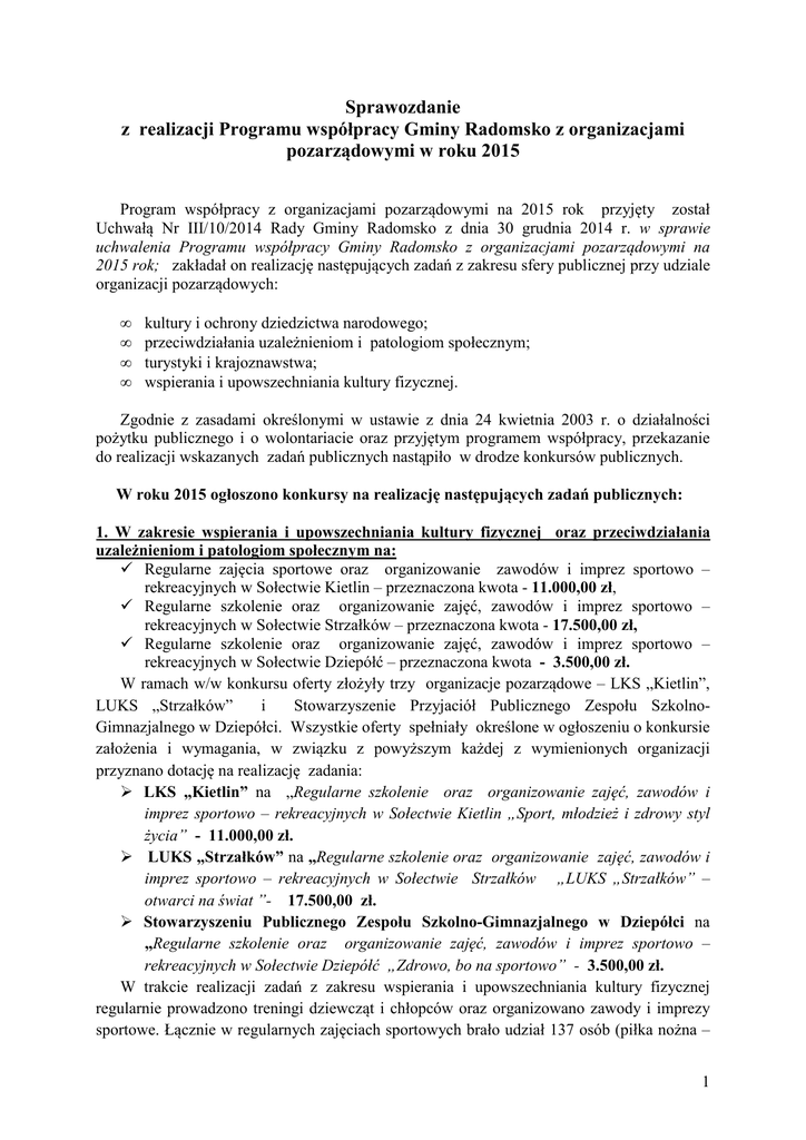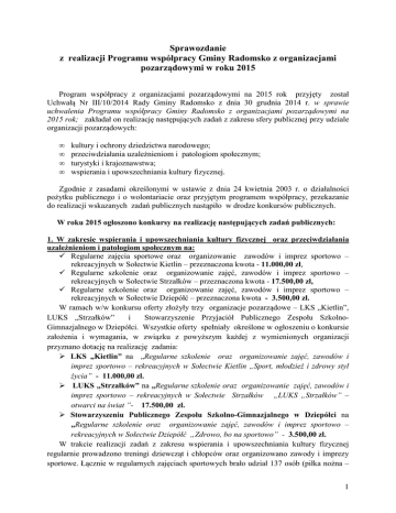Sprawozdanie z realizacji Programu współpracy Gminy Radomsko z organizacjami pozarządowymi w roku 2015 Program współpracy z organizacjami pozarządowymi na 2015 rok przyjęty został Uchwałą Nr III/10/2014 Rady Gminy Radomsko z dnia 30 grudnia 2014 r. w sprawie uchwalenia Programu współpracy Gminy Radomsko z organizacjami pozarządowymi na 2015 rok; zakładał on realizację następujących zadań z zakresu sfery publicznej przy udziale organizacji pozarządowych: • • • • kultury i ochrony dziedzictwa narodowego; przeciwdziałania uzależnieniom i patologiom społecznym; turystyki i krajoznawstwa; wspierania i upowszechniania kultury fizycznej. Zgodnie z zasadami określonymi w ustawie z dnia 24 kwietnia 2003 r. o działalności pożytku publicznego i o wolontariacie oraz przyjętym programem współpracy, przekazanie do realizacji wskazanych zadań publicznych nastąpiło w drodze konkursów publicznych. W roku 2015 ogłoszono konkursy na realizację następujących zadań publicznych: 1. W zakresie wspierania i upowszechniania kultury fizycznej oraz przeciwdziałania uzależnieniom i patologiom społecznym na: Regularne zajęcia sportowe oraz organizowanie zawodów i imprez sportowo – rekreacyjnych w Sołectwie Kietlin – przeznaczona kwota - 11.000,00 zł, Regularne szkolenie oraz organizowanie zajęć, zawodów i imprez sportowo – rekreacyjnych w Sołectwie Strzałków – przeznaczona kwota - 17.500,00 zł, Regularne szkolenie oraz organizowanie zajęć, zawodów i imprez sportowo – rekreacyjnych w Sołectwie Dziepółć – przeznaczona kwota - 3.500,00 zł. W ramach w/w konkursu oferty złożyły trzy organizacje pozarządowe – LKS „Kietlin”, LUKS „Strzałków” i Stowarzyszenie Przyjaciół Publicznego Zespołu SzkolnoGimnazjalnego w Dziepółci. Wszystkie oferty spełniały określone w ogłoszeniu o konkursie założenia i wymagania, w związku z powyższym każdej z wymienionych organizacji przyznano dotację na realizację zadania: LKS „Kietlin” na „Regularne szkolenie oraz organizowanie zajęć, zawodów i imprez sportowo – rekreacyjnych w Sołectwie Kietlin „Sport, młodzież i zdrowy styl życia” - 11.000,00 zł. LUKS „Strzałków” na „Regularne szkolenie oraz organizowanie zajęć, zawodów i imprez sportowo – rekreacyjnych w Sołectwie Strzałków „LUKS „Strzałków” – otwarci na świat ”- 17.500,00 zł. Stowarzyszeniu Publicznego Zespołu Szkolno-Gimnazjalnego w Dziepółci na „Regularne szkolenie oraz organizowanie zajęć, zawodów i imprez sportowo – rekreacyjnych w Sołectwie Dziepółć „Zdrowo, bo na sportowo” - 3.500,00 zł. W trakcie realizacji zadań z zakresu wspierania i upowszechniania kultury fizycznej regularnie prowadzono treningi dziewcząt i chłopców oraz organizowano zawody i imprezy sportowe. Łącznie w regularnych zajęciach sportowych brało udział 137 osób (piłka nożna – 1 20 osób, tenis stołowy – 30 osób, lekkoatletyka – 25 osób, gimnastyka korekcyjna – 25 osób, zajęcia z nordic walking – 15 osób, gry i zabawy ogólnorozwojowe – 12 osób, samoobrona i boks tajski – 10 osób). Zorganizowano również: IX Igrzyska Sportowe o Puchar Wójta Gminy Radomsko w Kietlinie, IX Zawody Gminne w Tenisa Stołowego o Puchar Wójta Gminy Radomsko w Kietlinie, Międzyszkolne Zawody Lekkoatletyczne w Strzałkowie, IV Otwarte Mistrzostwa Strzałkowa w Szachach Szybkich o Puchar Wójta Gminy Radomsko i piknik sportowo-profilaktyczny w Dziepółci. Łącznie w w/w imprezach sportowych wzięło udział około 400 osób oraz około 30 wolontariuszy. Kluby, które otrzymały dotacje organizowały również wyjazdy na zawody sportowe, turnieje, a ich zawodnicy osiągali sukcesy na szczeblu gminnym, powiatowym, wojewódzkim i krajowym. Zawodnicy LUKS „Strzałków” odnieśli znaczące sukcesy w tzw. „Czwartkach lekkoatletycznych” w Bełchatowie i wystartowali w Finale tej imprezy w Łodzi, 1 sprinter awansował do półfinału i w Mistrzostwach Polski osiągnął wysokie 14 miejsce, a dwoje zawodników reprezentowało Gminę Radomsko na Mistrzostwach Polski Młodzików. Szachista z LKS „Strzałków” zajął 15 miejsce w Mistrzostwach Polski Juniorów. Zawodnicy LKS „Kietlin” zajęli IV miejsce we współzawodnictwie organizowanym przez powiatowe i wojewódzkie zrzeszenia LZS w sporcie niekwalifikowanym. 2. W zakresie wspierania zadań publicznych z turystyki i krajoznawstwa na: Zorganizowanie zajęć, warsztatów, konkursów i imprez turystycznych (zloty, rajdy) popularyzujących rozwój turystyki i krajoznawstwa - przeznaczona kwota – 5.000 zł. W ramach w/w konkursu oferty złożyły dwie organizacje pozarządowe – LKS Kietlin i Stowarzyszenie Rozwoju Lokalnego „Nasze miejsce” w Szczepocicach. Oferty spełniały wszystkie określone w ogłoszeniu o konkursie założenia i wymagania, w związku z powyższym każdej z wymienionych organizacji przyznano dotacje na realizację zadań: LKS „Kietlin” na „Zorganizowanie zajęć, warsztatów, konkursów i imprez turystycznych (zloty, rajdy) popularyzujących rozwój turystyki i krajoznawstwa pod nazwą: „Wędruj z nami, z „Harnasiami” - 2.500 zł, Stowarzyszenie Rozwoju Lokalnego „Nasze miejsce” w Szczepocicach” na „Zorganizowanie zajęć, warsztatów, konkursów i imprez turystycznych (zloty, rajdy) popularyzujących rozwój turystyki i krajoznawstwa pod nazwą „Cudze chwalicie, swego nie znacie”- podróże po Polsce” – 2.500 zł. W trakcie realizacji w/w zadań regularne organizowano spotkania klubowe; uczestnicy wzięli udział w: Ogólnopolskim Zlocie Ekologiczno-Turystycznym „Szlakiem Nadpilicznym” w Sulejowie, zwiedzaniu dolin tatrzańskich, radzie rowerowym „Góra Kamieńsk”, rajdzie pieszym po Jurze Krakowsko-Częstochowskiej oraz wycieczce „Henryków - Kamień Śląski - Góra Św. Anny” . W projektach łącznie uczestniczyło około 100 osób. 2 3. W zakresie 