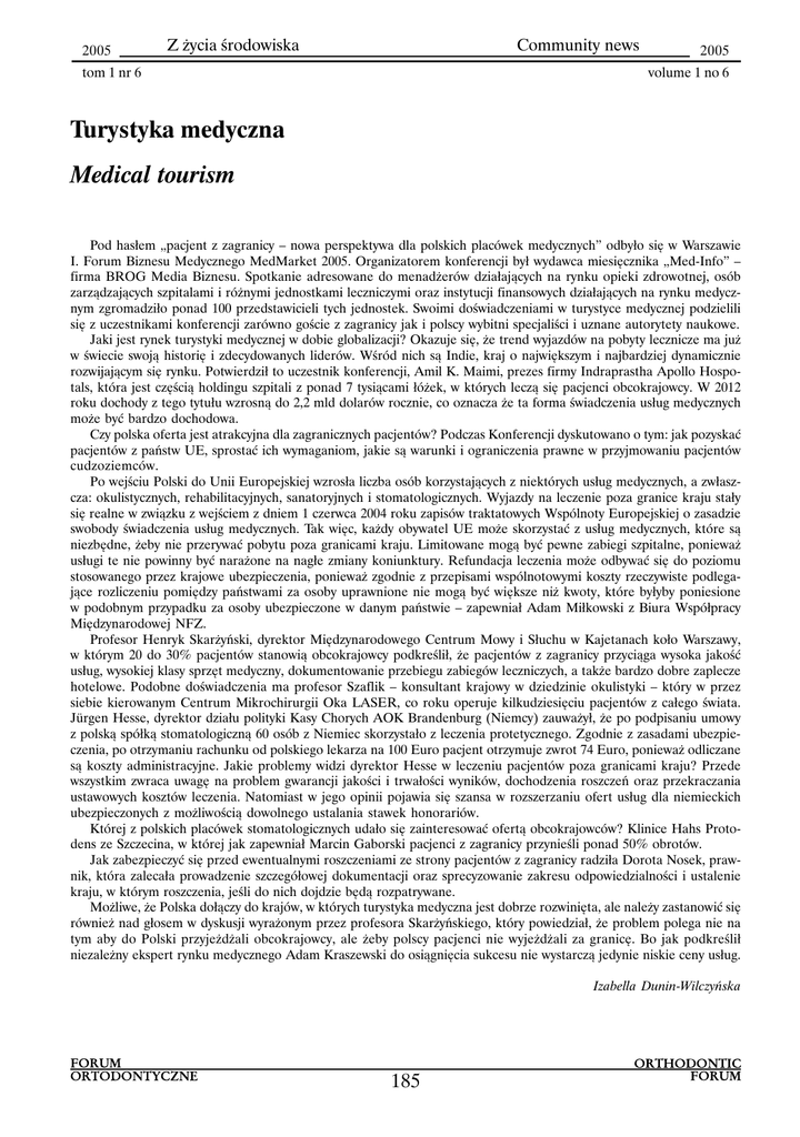 2005 Z życia środowiska Community news tom 1 nr 6 2005 volume 1 no 6 Turystyka medyczna Medical tourism Pod hasłem „pacjent z zagranicy – nowa perspektywa dla polskich placówek medycznych” odbyło się w Warszawie I. Forum Biznesu Medycznego MedMarket 2005. Organizatorem konferencji był wydawca miesięcznika „Med-Info” – firma BROG Media Biznesu. Spotkanie adresowane do menadżerów działających na rynku opieki zdrowotnej, osób zarządzających szpitalami i różnymi jednostkami leczniczymi oraz instytucji finansowych działających na rynku medycznym zgromadziło ponad 100 przedstawicieli tych jednostek. Swoimi doświadczeniami w turystyce medycznej podzielili się z uczestnikami konferencji zarówno goście z zagranicy jak i polscy wybitni specjaliści i uznane autorytety naukowe. Jaki jest rynek turystyki medycznej w dobie globalizacji? Okazuje się, że trend wyjazdów na pobyty lecznicze ma już w świecie swoją historię i zdecydowanych liderów. Wśród nich są Indie, kraj o największym i najbardziej dynamicznie rozwijającym się rynku. Potwierdził to uczestnik konferencji, Amil K. Maimi, prezes firmy Indraprastha Apollo Hospotals, która jest częścią holdingu szpitali z ponad 7 tysiącami łóżek, w których leczą się pacjenci obcokrajowcy. W 2012 roku dochody z tego tytułu wzrosną do 2,2 mld dolarów rocznie, co oznacza że ta forma świadczenia usług medycznych może być bardzo dochodowa. Czy polska oferta jest atrakcyjna dla zagranicznych pacjentów? Podczas Konferencji dyskutowano o tym: jak pozyskać pacjentów z państw UE, sprostać ich wymaganiom, jakie są warunki i ograniczenia prawne w przyjmowaniu pacjentów cudzoziemców. Po wejściu Polski do Unii Europejskiej wzrosła liczba osób korzystających z niektórych usług medycznych, a zwłaszcza: okulistycznych, rehabilitacyjnych, sanatoryjnych i stomatologicznych. Wyjazdy na leczenie poza granice kraju stały się realne w związku z wejściem z dniem 1 czerwca 2004 roku zapisów traktatowych Wspólnoty Europejskiej o zasadzie swobody świadczenia usług medycznych. Tak więc, każdy obywatel UE może skorzystać z usług medycznych, które są niezbędne, żeby nie przerywać pobytu poza granicami kraju. Limitowane mogą być pewne zabiegi szpitalne, ponieważ usługi te nie powinny być narażone na nagłe zmiany koniunktury. Refundacja leczenia może odbywać się do poziomu stosowanego przez krajowe ubezpieczenia, ponieważ zgodnie z przepisami wspólnotowymi koszty rzeczywiste podlegające rozliczeniu pomiędzy państwami za osoby uprawnione nie mogą być większe niż kwoty, które byłyby poniesione w podobnym przypadku za osoby ubezpieczone w danym państwie – zapewniał Adam Miłkowski z Biura Współpracy Międzynarodowej NFZ. Profesor Henryk Skarżyński, dyrektor Międzynarodowego Centrum Mowy i Słuchu w Kajetanach koło Warszawy, w którym 20 do 30% pacjentów stanowią obcokrajowcy podkreślił, że pacjentów z zagranicy przyciąga wysoka jakość usług, wysokiej klasy sprzęt medyczny, dokumentowanie przebiegu zabiegów leczniczych, a także bardzo dobre zaplecze hotelowe. Podobne doświadczenia ma profesor Szaflik – konsultant krajowy w dziedzinie okulistyki – który w przez siebie kierowanym Centrum Mikrochirurgii Oka LASER, co roku operuje kilkudziesięciu pacjentów z całego świata. Jürgen Hesse, dyrektor działu polityki Kasy Chorych AOK Brandenburg (Niemcy) zauważył, że po podpisaniu umowy z polską spółką stomatologiczną 60 osób z Niemiec skorzystało z leczenia protetycznego. Zgodnie z zasadami ubezpieczenia, po otrzymaniu rachunku od polskiego lekarza na 100 Euro pacjent otrzymuje zwrot 74 Euro, ponieważ odliczane są koszty administracyjne. Jakie problemy widzi dyrektor Hesse w leczeniu pacjentów poza granicami kraju? Przede wszystkim zwraca uwagę na problem gwarancji jakości i trwałości wyników, dochodzenia roszczeń oraz przekraczania ustawowych kosztów leczenia. Natomiast w jego opinii pojawia się szansa w rozszerzaniu ofert usług dla niemieckich ubezpieczonych z możliwością dowolnego ustalania stawek honorariów. Której z polskich placówek stomatologicznych udało się zainteresować ofertą obcokrajowców? Klinice Hahs Protodens ze Szczecina, w której jak zapewniał Marcin Gaborski pacjenci z zagranicy przynieśli ponad 50% obrotów. Jak zabezpieczyć się przed ewentualnymi roszczeniami ze strony pacjentów z zagranicy radziła Dorota Nosek, prawnik, która zalecała prowadzenie szczegółowej dokumentacji oraz sprecyzowanie zakresu odpowiedzialności i ustalenie kraju, w którym roszczenia, jeśli do nich dojdzie będą rozpatrywane. Możliwe, że Polska dołączy do krajów, w których turystyka medyczna jest dobrze rozwinięta, ale należy zastanowić się również nad głosem w dyskusji wyrażonym przez profesora Skarżyńskiego, który powiedział, że problem polega nie na tym aby do Polski przyjeżdżali obcokrajowcy, ale żeby polscy pacjenci nie wyjeżdżali za granicę. Bo jak podkreślił niezależny ekspert rynku medycznego Adam Kraszewski do osiągnięcia sukcesu nie wystarczą jedynie niskie ceny usług. Izabella Dunin-Wilczyńska 185