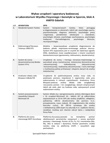 LABORARORIUM WYSIŁKU FIZYCZNEGO I GENETYKI W SPORCIE AWFIS GDAOSK Wykaz urządzeo i aparatury badawczej w Laboratorium Wysiłku Fizycznego i Genetyki w Sporcie, blok A AWFiS Gdaosk L.P. 1. APARATURA Wiedeoski System Testów OPIS System komputerowych testów, które pomagają w diagnozowaniu w obszarach, takich jak: psychologia sportu, psychomotoryka, diagnoza zdolności, psychologia pracy i organizacji, poradnictwo edukacyjne i zawodowe, psychologia zdrowia, psychologia wychowawcza, psychologia medyczna i farmakologiczna, psychologia kliniczna, neuropsychologia. 2. Elektromiograf Noraxon Telemyo 2400 DTS Mobilne i bezprzewodowe urządzenie diagnostyczne do badania układu mięśniowo-nerwowego podczas skurczu. System DTS wyposażony jest w czujniki do rejestracji sygnału EMG, dodatkowo może współpracowad z innymi czujnikami biomechanicznymi (goniometry, inklinometry, akcelerometry). 3. System do oceny dynamometrycznej Biodex System 4 Pro Urządzenie do oceny i treningu nerwowo-mięśniowego w warunkach pracy izometrycznej, izotonicznej (koncentrycznej i ekscentrycznej), izokinetycznej (ekscentrycznej i koncentrycznej), reaktywnej ekscentrycznej i ruchu biernego z możliwością pełnej archiwizacji i eksportu danych do analizy statystycznej. 4. Analizator składu ciała Biospace InBody720 Urządzenie do spektroskopowej analizy masy ciała, na podstawie pomiaru impedancji 5 segmentów ciała przy wykorzystaniu 6 różnych częstotliwości. Analizatory firmy Biospace podczas analizy składu ciała uwzględniają rzeczywisty pomiar i nie uwzględniają danych empirycznych takich jak wiek, płed czy budowa ciała, wpisywanych przed wykonaniem analizy. 5. System pozycjonowania zawodnika Catapult MinimaxX S4 System składa się z oprogramowania, anteny zbierającej dane z 16 urządzeo MinimaxX S4 – lekkich (67 g) odbiorników wyposażonych w 10 Hz GPS (do analizy prędkości, odległości, położenia), 100 Hz akcelerometry (do pomiaru m.in. przyspieszenia, czasu reakcji), 3D magnetometry (do analizy kierunku ruchu), 3D 100 Hz żyroskopy (do analizy z dokładnością 1200 stopni na sekundę m.in. szybkości obrotu, zwodów); możliwy jest również odczyt tętna z nadajników firmy Polar. 6. Platforma do oceny równowagi AMTI AccuSway Platforma Accusway pozwala na kompletny pomiar obiektywnych parametrów związanych z oceną wychyleo postawy i równowagi. Pomiar sił (Fx, Fy, Fz) i momentów (Mx, My, Mz) w statyce i dynamice; Pomiar parametru środka nacisku stóp na platformę (COP) i wszystkich jego pochodnych. Sporządził Robert Urbański 1 | STRONA LABORARORIUM WYSIŁKU FIZYCZNEGO I GENETYKI W SPORCIE AWFIS GDAOSK L.P. APARATURA OPIS 7. System do monitorowania obciążeo treningowych w grach zespołowych POLAR Team2 Pro. 3 zestawy Za pomocą oprogramowania Polar Team² można śledzid i rejestrowad pracę każdego zawodnika w czasie rzeczywistym. System Polar Team² zbiera dane o pracy serca za pomocą nadajników na klatkę piersiową Team². Nadajniki nawiązują łącznośd z bazą w zasięgu do 100 metrów i mogą się również komunikowad z większością pulsometrów Polar na rękę. Zestaw Polar Team² Pro składa się ze stacji bazowej, ładowarki, 10 nadajników na klatkę piersiową, USB Dongle oraz oprogramowania na PC. 8. Monitory serca POLAR RS400. 30 zestawów W zestawie znajduje się monitor serca, nadajnik i oprogramowanie Polar ProTrainer 5 służące do analizy i planowania treningów, a także prowadzenia dziennika treningowego. Monitory są kompatybilne z Polar Team. Laboratorium posiada również czytnik na podczerwieo umożliwiający przesłanie danych z pulsometru do PC. 9. Stacjonarny ergospirometr Jaeger Oxycon Pro 10. Mobilny ergospirometr Jaeger Oxycon Mobile Analizatory gazów wydechowych służą do badao wysiłkowych, zwłaszcza w dyscyplinach wytrzymałościowych, takich jak: bieganie, kolarstwo, wioślarstwo, triathlon. Urządzenie dokonuje za pomocą precyzyjnych analizatorów O2 i CO2 analizy każdego oddechu (Breath-by-Breath – 3B), dzięki czemu możliwa jest dokładna ocena czynnościowa układu sercowo-naczyniowego i płucnego, wiarygodne i powtarzalne wyniki pomiarów w szerokim zakresie wentylacji. Podstawowe parametry ustalane podczas takiego badania to: maksymalny pułap tlenowy VO2 max, szczytowe pochłanianie tlenu (VO2peak), wysiłkowa odpowiedź wentylacyjna (VE/VCO2slope), wskaźnik wymiany oddechowej podczas wysiłku (RER = VCO2/VO2); parametr użyteczny w ocenie stopnia wykorzystania przemian beztlenowych podczas wysiłku, wyznaczenie pułapu tlenowego. 11. Bieżnia h/p/cosmos/saturn Zawodnicy/pacjenci do badao wydolnościowych mają do dyspozycji bieżnię h/p/cosmos/saturn z regulacją prędkości w zakresie 0-40 km/h i nachylenie 0-25%. Przy odwróconym biegu możliwe jest zbieganie w zakresie 0-5 km/h i nachyleniu 0-25%. Wymiary bieżni pozwalają na bieg oraz jazdę na rowerze lub wózku inwalidzkim. 12. Cykloergometr Ergoline Ergoselect viasprint 150p Ergometr rowerowy: obciążenie maksymalne do 999 W, ręczne regulacja wysokości siodełka i kierownicy dla wzrostu i ciężaru ciała: 1,20-2,10m/140 kg. Ergometr wyposażony jest w programowalny panel sterowania z wyświetlaczem LCD, interfejsy do sterowania z PC, rękaw do pomiaru ciśnienia krwi. Sporządził Robert Urbański 2 | STRONA LABORARORIUM WYSIŁKU FIZYCZNEGO I GENETYKI W SPORCIE AWFIS GDAOSK L.P. 13. APARATURA Ergometr wioślarski Concept2 model D OPIS Najpowszechniej używany na świecie ergometr wioślarski wyposażony w monitor PM3 umożliwiający programowanie wysiłku i zapis na karcie pamięci. 14. System rejestracji obrazu video w jednej płaszczyźnie lub przestrzennie firmy SIMI System wyposażony jest w 2 kamery o wysokiej częstotliwości nagrywania (200-500 kl./sek.), maksymalnie do 6 kamer, oprogramowanie automatycznie śledzi aktywne markery (5 sztuk) umieszczone na ciele, co pozwala uzyskad współrzędne 3D. 15. Odbiornik GNSS o podwyższonej do