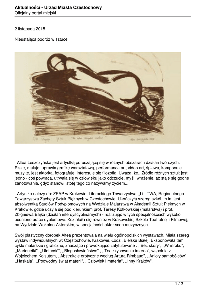 Aktualności - Urząd Miasta Częstochowy Oficjalny portal miejski 2 listopada 2015 Nieustająca podróż w sztuce Altea Leszczyńska jest artystką poruszającą się w różnych obszarach działań twórczych. Pisze, maluje, uprawia grafikę warsztatową, performance art, video art, śpiewa, komponuje muzykę, jest aktorką, fotografuje, interesuje się filozofią. Uważa, że...Źródło różnych sztuk jest jedno - coś powraca, utrwala się w człowieku jako odczucie, myśl, wrażenie, aż staje się godne zanotowania, gdyż stanowi istotę tego co nazywamy życiem... Artystka należy do: ZPAP w Krakowie, Literackiego Towarzystwa ,,Li - TWA, Regionalnego Towarzystwa Zachęty Sztuk Pięknych w Częstochowie. Ukończyła szereg szkół, m.in. jest absolwentką Studiów Podyplomowych na Wydziale Malarstwa w Akademii Sztuk Pięknych w Krakowie, gdzie uczyła się pod kierunkiem prof. Teresy Kotkowskiej (malarstwa) i prof. Zbigniewa Bajka (działań interdyscyplinarnych) - realizując w tych specjalnościach wysoko ocenione prace dyplomowe. Kształciła się również w Krakowskiej Szkole Teatralnej i Filmowej, na Wydziale Wokalno-Aktorskim, w specjalności-aktor scen muzycznych. Swój plastyczny dorobek Altea prezentowała na wielu ogólnopolskich wystawach. Miała szereg wystaw indywidualnych w: Częstochowie, Krakowie, Łodzi, Bielsku Białej. Eksponowała tam cykle malarskie i graficzne, znacząco i prowokująco zatytułowane : ,,Bez skóry”, ,,W mroku”, ,,Marionetki”, ,,Ulotność”, ,,Błogosławieństwo” , ,,Teatr rysowania interno”, wspólnie z Wojciechem Kołsutem, ,,Abstrakcje erotyczne według Artura Rimbaud”, ,,Anioły samobójców”, ,,Haskala”, ,,Podwodny świat materii”, ,,Człowiek i materia", ,,Inny Kraków”. 1/2 Aktualności - Urząd Miasta Częstochowy Oficjalny portal miejski Leszczyńska, pytana, dlaczego tworzy cyklami, odpowiada ,...Malowanie cyklu nie jest odruchem czy skutkiem przypadku .Wynika z sumy moich przemyśleń i działań, gdy staram się zrozumieć skrajne emocje. Jeżeli powstają cykle, to również z takiego względu ,że w jednej grafice czy obrazie nie mieści się wszystko, co miałam na jakiś temat do powiedzenia. Sztuka dla mnie to kabalistyczne ,,kroki”, - czyli bycie w drodze, stawanie się, nieustająca podróż... Swoje dokonania pisarskie, zarówno literackie jak publicystyczne, publikowała w pismach : ,,Panoptikum” , ,,Aleje 3” , ,,Galeria”, ,,Fahrenheit”. W sierpniu 2009 roku ukazała się jej książka pt. ,,Podwójna miara”, wydana przez Częstochowską Bibliotekę Poetów i Prozaików. Rok później pojawiła się na rynku księgarskim jej powieść ,,Brat” - zagadkowa, niepokojąca, jakby z kręgu prozy Allana Edgara Poego. Altea Leszczyńska lubi horror. Bawi się nim, czasami drastycznie, nie od dziś. Zarówno w malarstwie jak i literaturze. Także jej krótkie filmy odnoszą się do naszych lęków, przerażeń, obaw, męczących i groźnych, przeżywanych w malignie snów. Obecnie jednak poszukuje innych treści estetycznych w malarskiej abstrakcji. Skupia się nad materią przestrzeni. Uważa, że forma artystyczna jest miejscem spotkania, ruchem sprzecznych napięć otwierających i zamykających, które stanowią o energii przestrzeni. Być może jej doświadczenia sceniczne skłaniają ją do takich stwierdzeń. Występuje bowiem w krakowskim Eloe Cabareth, miała też okazję prezentować swój talent aktorski w Piwnicy pod Baranami. Stale pisze dla portalu muzycznego BloodArt. Co tydzień prowadzi audycje z kręgu muzyki Electro Gothic oraz Hardcore radiowe w Radiu ProRock. W swojej twórczej multimedialności w sposób progresywny odbywa nieustającą podróż w sztuce. Marian Panek Pozostałe aktualności 2/2 Powered by TCPDF (www.tcpdf.org)