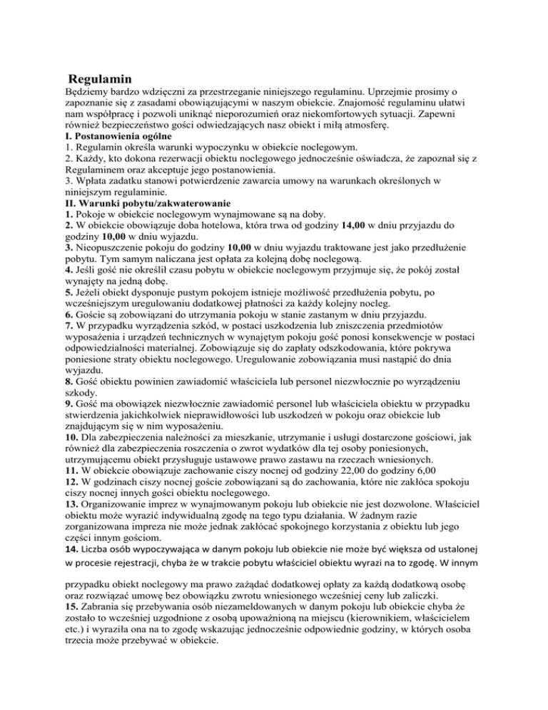 Regulamin Będziemy bardzo wdzięczni za przestrzeganie niniejszego regulaminu. Uprzejmie prosimy o zapoznanie się z zasadami obowiązującymi w naszym obiekcie. Znajomość regulaminu ułatwi nam współpracę i pozwoli uniknąć nieporozumień oraz niekomfortowych sytuacji. Zapewni również bezpieczeństwo gości odwiedzających nasz obiekt i miłą atmosferę. I. Postanowienia ogólne 1. Regulamin określa warunki wypoczynku w obiekcie noclegowym. 2. Każdy, kto dokona rezerwacji obiektu noclegowego jednocześnie oświadcza, że zapoznał się z Regulaminem oraz akceptuje jego postanowienia. 3. Wpłata zadatku stanowi potwierdzenie zawarcia umowy na warunkach określonych w niniejszym regulaminie. II. Warunki pobytu/zakwaterowanie 1. Pokoje w obiekcie noclegowym wynajmowane są na doby. 2. W obiekcie obowiązuje doba hotelowa, która trwa od godziny 14,00 w dniu przyjazdu do godziny 10,00 w dniu wyjazdu. 3. Nieopuszczenie pokoju do godziny 10,00 w dniu wyjazdu traktowane jest jako przedłużenie pobytu. Tym samym naliczana jest opłata za kolejną dobę noclegową. 4. Jeśli gość nie określił czasu pobytu w obiekcie noclegowym przyjmuje się, że pokój został wynajęty na jedną dobę. 5. Jeżeli obiekt dysponuje pustym pokojem istnieje możliwość przedłużenia pobytu, po wcześniejszym uregulowaniu dodatkowej płatności za każdy kolejny nocleg. 6. Goście są zobowiązani do utrzymania pokoju w stanie zastanym w dniu przyjazdu. 7. W przypadku wyrządzenia szkód, w postaci uszkodzenia lub zniszczenia przedmiotów wyposażenia i urządzeń technicznych w wynajętym pokoju gość ponosi konsekwencje w postaci odpowiedzialności materialnej. Zobowiązuje się do zapłaty odszkodowania, które pokrywa poniesione straty obiektu noclegowego. Uregulowanie zobowiązania musi nastąpić do dnia wyjazdu. 8. Gość obiektu powinien zawiadomić właściciela lub personel niezwłocznie po wyrządzeniu szkody. 9. Gość ma obowiązek niezwłocznie zawiadomić personel lub właściciela obiektu w przypadku stwierdzenia jakichkolwiek nieprawidłowości lub uszkodzeń w pokoju oraz obiekcie lub znajdującym się w nim wyposażeniu. 10. Dla zabezpieczenia należności za mieszkanie, utrzymanie i usługi dostarczone gościowi, jak również dla zabezpieczenia roszczenia o zwrot wydatków dla tej osoby poniesionych, utrzymującemu obiekt przysługuje ustawowe prawo zastawu na rzeczach wniesionych. 11. W obiekcie obowiązuje zachowanie ciszy nocnej od godziny 22,00 do godziny 6,00 12. W godzinach ciszy nocnej goście zobowiązani są do zachowania, które nie zakłóca spokoju ciszy nocnej innych gości obiektu noclegowego. 13. Organizowanie imprez w wynajmowanym pokoju lub obiekcie nie jest dozwolone. Właściciel obiektu może wyrazić indywidualną zgodę na tego typu działania. W żadnym razie zorganizowana impreza nie może jednak zakłócać spokojnego korzystania z obiektu lub jego części innym gościom. 14. Liczba osób wypoczywająca w danym pokoju lub obiekcie nie może być większa od ustalonej w procesie rejestracji, chyba że w trakcie pobytu właściciel obiektu wyrazi na to zgodę. W innym przypadku obiekt noclegowy ma prawo zażądać dodatkowej opłaty za każdą dodatkową osobę oraz rozwiązać umowę bez obowiązku zwrotu wniesionego wcześniej ceny lub zaliczki. 15. Zabrania się przebywania osób niezameldowanych w danym pokoju lub obiekcie chyba że zostało to wcześniej uzgodnione z osobą upoważnioną na miejscu (kierownikiem, właścicielem etc.) i wyraziła ona na to zgodę wskazując jednocześnie odpowiednie godziny, w których osoba trzecia może przebywać w obiekcie. 16. Za pobyt zwierząt domowych, jeżeli obiekt noclegowy przewiduje taką możliwość, pobierana jest dodatkowa opłata zgodna z cennikiem bądź indywidualnie ustalona z właścicielem obiektu. 17. Gość, który przywozi do obiektu zwierzę domowe jest zobowiązany zachować wszelkie środki bezpieczeństwa i ponosi całkowitą odpowiedzialność ze ewentualne szkody przez nie spowodowane. 18. Gość wraz z otrzymaniem kluczy do pokoju lub obiektu staje się za niego odpowiedzialny. 19. Gość zobowiązuje się do zamykania okien i drzwi (na klucz) wynajmowanego pokoju lub obiektu przy każdorazowym wyjściu z tego obiektu. 20. Gość zobowiązuje się do nieprzekazywania kluczy osobom postronnym. 21. W przypadku zgubienia kluczy gość jest zobowiązany do poniesienia kosztów wymiany zamka oraz dorobienia klucza (standardowo jest to kwota zł 100-150 PLN) 22. W przypadku pozostawienia w obiekcie noclegowym osobistych przedmiotów przez wyjeżdżającego gościa, będą one odesłane na jego koszt po wcześniejszym listownym zawiadomieniu. W przypadku kiedy obiekt nie uzyska wymaganej zgody gościa, przedmioty zostaną w obiekcie na przechowanie za cenę uzgodnioną z klientem albo w razie braku porozumienia w tym zakresie, właściciel obiektu odda je do biura rzeczy znalezionych, zaś kosztami obciąży gościa obiektu. 23. Ponad postanowienia poprzedzające gość pozostaje zobowiązany do: a) Przestrzegania regulaminu obiektu oraz przestrzegania zasad i dyscypliny właściwej dla obiektu, z którego korzystają inne osoby, w szczególności zakazane jest spożywanie alkoholu w ilości prowadzącej do stanu upojenia alkoholowego. Zabrania się też innych zachowań zakłócających pobyt osób zakwaterowanych w obiekcie. b) Utrzymania czystości, ładu i porządku w zajmowanych pokojach oraz w pomieszczeniach ogólnodostępnych, a także w otoczeniu obiektu. c) Dbałości o sprzęt i powierzone mienie. d) Bezzwłocznego zawiadamiania pracowników administracji obiektu o wszelkich awariach i uszkodzeniach zaistniałych w pomieszczeniach. e) Użytkowania urządzeń sanitarnych zgodnie z ich przeznaczeniem. Do muszli klozetowych nie można wrzucać śmieci. f) Wszyscy użytkownicy obiektu zobowiązani są do przestrzegania zasad bezpieczeństwa p. pożarowego. III. Prawa i obowiązki o