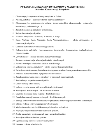PYTANIA NA EGZAMIN DYPLOMOWY MAGISTERSKI Katedra Konserwacji Zabytków 1. Charakterystyka systemu ochrony zabytków w Polsce. 2. Pojęcie „zabytku” – ustawowe formy ochrony zabytków? 3. Charakterystyka podstawowych działań konserwatorskich (konserwacja, restauracja, rewitalizacja, rekonstrukcja…). 4. Zasady konserwacji zabytków architektury. 5. Rejestr i ewidencja zabytków 6. Wartości zabytkowe – J.Ruskin, W.Morris, A.Riegl…. 7. Karta Ateńska, Karta Wenecka, Karta Waszyngtońska… – teksty doktrynalne w konserwacji zabytków. 8. Ochrona architektury wenakularnej (skansen) 9. Dokumentacja zabytków (inwentaryzacja, ikonografia, fotogrametria, Archeologiczne Zdjęcie Polski). 10. „Trwała ruina” – zasady działania konserwatorskiego 11. Remont, modernizacja, adaptacja obiektów zabytkowych 12. Prawa i obowiązki właściciela obiektu zabytkowego. 13. „Obszarowa ochrona zabytków” – strefy ochrony konserwatorskiej 14. Badania architektoniczne, badania archeologiczne, studium historyczno-konserwatorskie 15. Wnioski konserwatorskie, wytyczne konserwatorskie 16. Zasady projektowania nowej zabudowy w zespołach staromiejskich. 17. Rewitalizacja zespołów staromiejskich 18. Omów metodę lekko-mokrą. 19. Izolacje przeciwwodne wtórne w obiektach istniejących 20. Rodzaje soli budowlanych i ich niszczące działanie. 21. Czynniki niszczące mury ceglane i detale kamienne. 22. Zasady konserwacji murów ceglanych i detali kamiennych. 23. Zabiegi konserwatorskie i ich rodzaje w przypadku murów ceglanych i detali kamiennych. 24. Główne rodzaje soli występujących w budynkach. 25. Mechanizm zniszczeń detali kamiennych i analiza uszkodzeń. 26. Przyczyny najczęstszych wad i uszkodzeń tynków. 27. Źródła najczęściej występujących wad i uszkodzeń tynków. 28. Rodzaje wad lub uszkodzeń tynków. 29. Ogólne zasady napraw i konserwacji tynków. 30. Naprawa tynków szlachetnych. 1 31. Przyczyny występowania korozji biologicznej w budynkach. 32. Likwidacja korozji biologicznej w budynkach. 33. Przyczyny i skutki zawilgocenia obiektów budowlanych. 34. Objawy porażenia drewna i cechy rozpoznawcze gatunków owadów. 35. Zwalczanie korozji biologicznej w budynkach. 36. Zasady ustalenia wytrzymałości obliczeniowych w konstrukcjach drewnianych. 37. Rodzaje łączników stosowanych w konstrukcjach drewnianych. 38. Typy więźb dachowych. 39. Zasady sprawdzania SGN belek dwuteowych z łącznikami trzpieniowymi. 40. Zabezpieczenie przeciwpożarowe drewnianych elementów konstrukcyjnych. 41. Przerwy dylatacyjne w konstrukcjach murowych. 42. Modele obliczeniowe konstrukcji murowych ściskanych pionowo. 43. Wytrzymałość muru na ściskanie – rodzaje, sposoby wyznaczania. 44. Konstrukcje murowe zbrojone i zespolone. 45. Wieńce w budynkach murowanych – wymagania, zbrojenie. 46. Fazy zniszczenia ściskanej konstrukcji murowej. 47. Rodzaje ścian murowanych – podział ze względu na rozwiązania konstrukcyjne. 48. Zaprawy stosowane w konstrukcjach murowych – rodzaje i charakterystyka. KONSTRUKCJE BETONOWE a) Podstawy konstrukcji żelbetowych 1. Klasa betonu i jak ją określamy. 2. Omówić fazy pracy belki żelbetowej. 3. Na czym polega współpraca betonu i stali zbrojeniowej w konstrukcjach żelbetowych. 4. Podać cechy fizyko-mechaniczne stali zbrojeniowych stosowanych w konstrukcjach żelbetowych. 5. Podać ogólne założenia wymiarowania konstrukcji żelbetowych metodą stanów granicznych. 6. Podać ogólną koncepcję modelu kratownicowego wymiarowania stref przypodporowych w belkach. 7. Jak uwzględniamy wpływ wyboczenia przy wymiarowaniu elementów ściskanych. 8. Podać ogólne zasady sprawdzania stanu granicznego ugięć w konstrukcjach żelbetowych. 9. Podać ogólne zasady sprawdzania stanu granicznego zarysowania w konstrukcjach żelbetowych. 10. Omówić odkształcalność doraźną betonu. 11. Omówić zjawiska reologiczne betonu 2 12. Stan graniczny nośności na przebicie. b) Konstrukcje żelbetowe 1. Definicja i podstawowe zasady konstruowania i obliczania stropów gęstożebrowych. 2. Kiedy płytę żelbetową traktujemy jako jednokierunkowo zbrojoną i jakie są zasady konstrukcyjne doboru zbrojenia w takiej płycie. 3. Definicja, zasady obliczeń i konstruowania płyt krzyżowo zbrojonych. 4. Podstawowe zasady projektowania stropów żelbetowych bezbelkowych. 5. Różnice w konstrukcji i pracy statycznej ścian oporowych płytowo-kątowych i płytowożebrowych. 6. Zasady obliczania i zbrojenia żelbetowych ław fundamentowych pod ściany i rzędy słupów. 7. Zasady obliczania i zbrojenia stóp fundamentowych. 8. Tarcze żelbetowe, zasady ich projektowania i zbrojenia. c) Żelbetowe konstrukcje inżynierskie i przemysłowe 1. Zasady projektowania powłok żelbetowych. 2. Różnice między silosem smukłym i krępym i podstawowe zasady ich obliczeń. 3. Zasady projektowania żelbetowych zbiorników na ciecze o przekroju kołowym. 4. Zasady obliczania i konstruowania żelbetowych zbiorników na ciecze o przekroju prostokątnym. d) Konstrukcje sprężone 1. Idea sprężania i rodzaje konstrukcji sprężonych. 2. Technologia sprężania elementów strunobetonowych. 3. Technologia sprężania elementów kablobetonowych. 4. Charakterystyka i asortyment stali sprężających. II. KONSTRUKCJE STALOWE 1. Podstawowe parametry wytrzymałościowe stali. 2. Metoda stanów granicznych w konstrukcjach stalowych – podstawowe założenia. 3. Obciążenia charakterystyczne i obliczeniowe w metodzie stanów granicznych. 4. Stan graniczny nośności pręta ściskanego osiowo. 5. Zapisać warunek stanu granicznego nośności dla belek stalowych. 6. Zapisać warunek stanu granicznego użytkowania dla belek stalowych. 7. Jaki wpływ na podstawowe parametry stali ma temperatura? 8. Co to jest zmęczenie materiału (stali) i kiedy występuje? 9. Jak sprawdzamy konstrukcję stalową na zmęczenie? 10. Nośność śrub i nitów w połączeniach. 11. Połącz