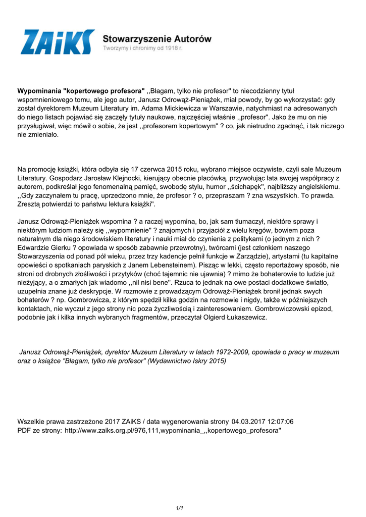 Wypominania "kopertowego profesora" ,,Błagam, tylko nie profesor'' to niecodzienny tytuł wspomnieniowego tomu, ale jego autor, Janusz Odrowąż-Pieniążek, miał powody, by go wykorzystać: gdy został dyrektorem Muzeum Literatury im. Adama Mickiewicza w Warszawie, natychmiast na adresowanych do niego listach pojawiać się zaczęły tytuły naukowe, najczęściej właśnie ,,profesor''. Jako że mu on nie przysługiwał, więc mówił o sobie, że jest ,,profesorem kopertowym'' ? co, jak nietrudno zgadnąć, i tak niczego nie zmieniało. Na promocję książki, która odbyła się 17 czerwca 2015 roku, wybrano miejsce oczywiste, czyli sale Muzeum Literatury. Gospodarz Jarosław Klejnocki, kierujący obecnie placówką, przywołując lata swojej współpracy z autorem, podkreślał jego fenomenalną pamięć, swobodę stylu, humor ,,ścichapęk'', najbliższy angielskiemu. ,,Gdy zaczynałem tu pracę, uprzedzono mnie, że profesor ? o, przepraszam ? zna wszystkich. To prawda. Zresztą potwierdzi to państwu lektura książki''. Janusz Odrowąż-Pieniążek wspomina ? a raczej wypomina, bo, jak sam tłumaczył, niektóre sprawy i niektórym ludziom należy się ,,wypomnienie'' ? znajomych i przyjaciół z wielu kręgów, bowiem poza naturalnym dla niego środowiskiem literatury i nauki miał do czynienia z politykami (o jednym z nich ? Edwardzie Gierku ? opowiada w sposób zabawnie przewrotny), twórcami (jest członkiem naszego Stowarzyszenia od ponad pół wieku, przez trzy kadencje pełnił funkcje w Zarządzie), artystami (tu kapitalne opowieści o spotkaniach paryskich z Janem Lebensteinem). Pisząc w lekki, często reportażowy sposób, nie stroni od drobnych złośliwości i przytyków (choć tajemnic nie ujawnia) ? mimo że bohaterowie to ludzie już nieżyjący, a o zmarłych jak wiadomo ,,nil nisi bene''. Rzuca to jednak na owe postaci dodatkowe światło, uzupełnia znane już deskrypcje. W rozmowie z prowadzącym Odrowąż-Pieniążek bronił jednak swych bohaterów ? np. Gombrowicza, z którym spędził kilka godzin na rozmowie i nigdy, także w późniejszych kontaktach, nie wyczuł z jego strony nic poza życzliwością i zainteresowaniem. Gombrowiczowski epizod, podobnie jak i kilka innych wybranych fragmentów, przeczytał Olgierd Łukaszewicz. Janusz Odrowąż-Pieniążek, dyrektor Muzeum Literatury w latach 1972-2009, opowiada o pracy w muzeum oraz o książce "Błagam, tylko nie profesor" (Wydawnictwo Iskry 2015) Wszelkie prawa zastrzeżone 2017 ZAiKS / data wygenerowania strony 04.03.2017 12:07:06 PDF ze strony: http://www.zaiks.org.pl/976,111,wypominania_,,kopertowego_profesora'' 1/1