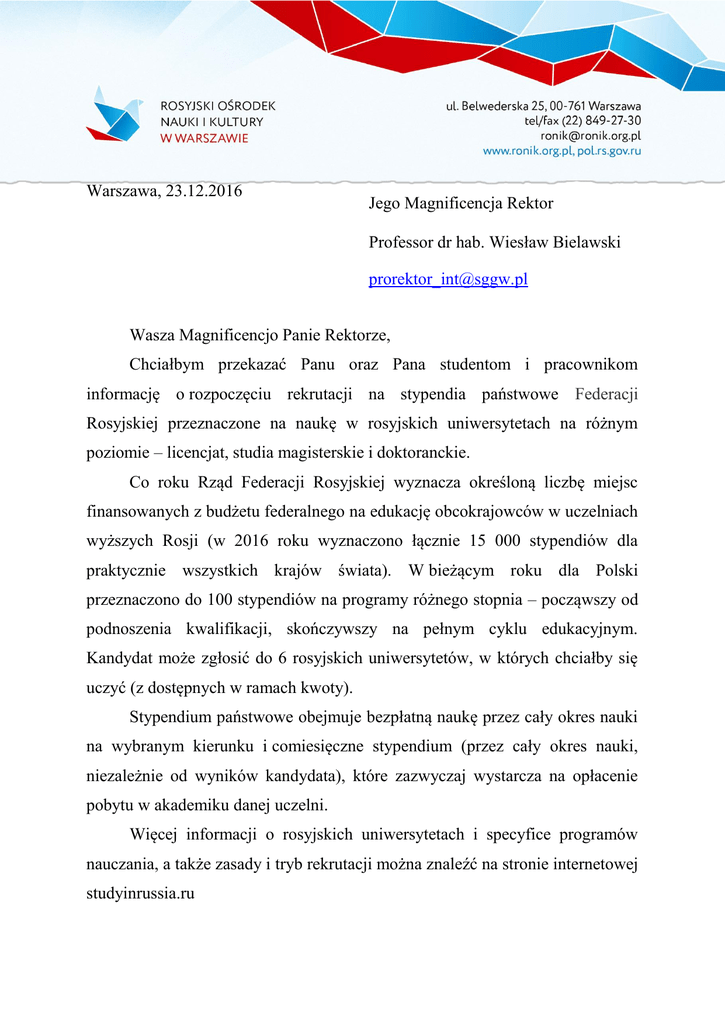Warszawa, 23.12.2016 Jego Magnificencja Rektor Professor dr hab. Wiesław Bielawski [email protected] Wasza Magnificencjo Panie Rektorze, Chciałbym przekazać Panu oraz Pana studentom i pracownikom informację o rozpoczęciu rekrutacji na stypendia państwowe Federacji Rosyjskiej przeznaczone na naukę w rosyjskich uniwersytetach na różnym poziomie – licencjat, studia magisterskie i doktoranckie. Co roku Rząd Federacji Rosyjskiej wyznacza określoną liczbę miejsc finansowanych z budżetu federalnego na edukację obcokrajowców w uczelniach wyższych Rosji (w 2016 roku wyznaczono łącznie 15 000 stypendiów dla praktycznie wszystkich krajów świata). W bieżącym roku dla Polski przeznaczono do 100 stypendiów na programy różnego stopnia – począwszy od podnoszenia kwalifikacji, skończywszy na pełnym cyklu edukacyjnym. Kandydat może zgłosić do 6 rosyjskich uniwersytetów, w których chciałby się uczyć (z dostępnych w ramach kwoty). Stypendium państwowe obejmuje bezpłatną naukę przez cały okres nauki na wybranym kierunku i comiesięczne stypendium (przez cały okres nauki, niezależnie od wyników kandydata), które zazwyczaj wystarcza na opłacenie pobytu w akademiku danej uczelni. Więcej informacji o rosyjskich uniwersytetach i specyfice programów nauczania, a także zasady i tryb rekrutacji można znaleźć na stronie internetowej studyinrussia.ru Rejestracja kandydatów i składanie dokumentów odbywają się przez stronę http://russia.study Wszelkie dodatkowe informacje i konsultacje można uzyskać w Rosyjskim Ośrodku Nauki i Kultury w Warszawie (osoba odpowiedzialna: Dr. Andriej Potiomkin, zastępca dyrektora, tel. +48 600-233-023, e-mail [email protected]) W razie konieczności przedstawiciel naszego Ośrodka może przeprowadzić spotkanie informacyjne z zainteresowanymi kandydatami, zarówno u nas, jak i na Pana uczelni. Prosimy o udostępnienie informacji o stypendiach wszystkim zainteresowanym. Rosyjski Ośrodek Nauki i Kultury składa Panu i wszystkim Pana studentom, pracownikom i wykładowcom serdeczne życzenia zdrowia i wszelkiej pomyślności z okazji nadchodzących Świąt Bożego Narodzenia i Nowego Roku. Dyrektor Rosyjskiego Ośrodka Nauki i Kultury w Warszawie dr. IgorZhukovskii