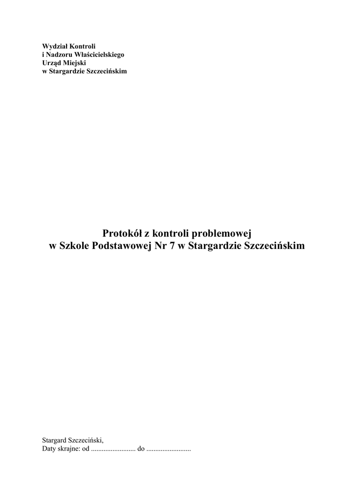 Wydział Kontroli i Nadzoru Właścicielskiego Urząd Miejski w Stargardzie Szczecińskim Protokół z kontroli problemowej w Szkole Podstawowej Nr 7 w Stargardzie Szczecińskim Stargard Szczeciński, Daty skrajne: od ......................... do ......................... Urząd Miejski w Stargardzie Szczecińskim Wydział Kontroli i Nadzoru właścicielskiego MK. 2, 4/0912-9/2004 -do użytku zewnętrznego- PROTOKÓŁ z przeprowadzonej kontroli problemowej w Szkole Podstawowej Nr 7 w Stargardzie Szczecińskim w okresie od 20 lipca 2004 roku do 28 lipca 2004 roku. Na podstawie upoważnienia Nr 15/2004 Prezydenta Miasta Stargardu Szczecińskiego z 16 lipca 2004 roku kontrolę przeprowadzili: 1. Helena M. - inspektor Wydziału Kontroli i Nadzoru Właścicielskiego, 2. Aneta G. - inspektor Wydziału Kontroli i Nadzoru Właścicielskiego. Zakres kontroli: Wydatki rzeczowe za I kwartał 2004r. Dyrektorem Szkoły Podstawowej Nr 7 w Stargardzie Szczecińskim jest Elżbieta Witczak, której powierzono stanowisko dyrektora szkoły zarządzeniem Nr 306/2003 Prezydenta Miasta Stargardu Szczecińskiego z dnia 15 maja 2003 roku na okres od 1 września 2003 roku do 31 sierpnia 2008 roku. Główną księgową w Szkole Podstawowej Nr 7 jest Alicja Podlewska, zatrudniona od 1 września 1993 roku na podstawie umowy o pracę w pełnym wymiarze czasu pracy. W trakcie kontroli wyjaśnień udzielała główna księgowa Alicja Podlewska. Zbadano 100% dokumentów z kontrolowanego okresu. Nieprawidłowości nie stwierdzono. 2 Szkoła Podstawowa Nr 7 w Stargardzie Szczecińskim została powołana z dniem 1 sierpnia 1980 roku przez Kuratora Oświaty i Wychowania w Szczecinie Orzeczeniem organizacyjnym Nr 0.I – 5090/2/80 z dnia 15 marca 1980 roku na wniosek Prezydenta Miasta Stargardu Szczecińskiego. Informacja o stanie zatrudnienia w Szkole Podstawowej Nr 7 na dzień 27 lipca 2004 roku stanowi załącznik nr 1. Wydatki rzeczowe za I kwartał 2004 roku. Temat ten zbadano w oparciu o dokumenty źródłowe, tj.: faktury, wyciągi bankowe, delegacje służbowe, raporty kasowe, sprawozdawczość i urządzenia finansowo – księgowe. 1. Dział 801 rozdział 80101 – Szkoły Podstawowe. 1.1. Zakup materiałów i wyposażenia § 4210 (plan 15.000, 00 zł wykonanie za I kwartał 6.383,10 zł): • • • • • zakup czasopism (Rachunkowość budżetowa, Biblioteka w szkole, Głos nauczycielski, Służba pracownicza) 1.609,67 zł zakup materiałów biurowych (toner, druki księgowe, papier ksero, zszywacz, zszywki, skoroszyty, koperty, spinacze, brystol, folia samoprzylepna, tusz do drukarki, segregatory, blok biurowy) 1.845,98 zł zakup materiałów na potrzeby konserwatora (zamek do drzwi, kołki, wiertła, pędzle, żarówki, drzwi do szatni, szyld, klamka, wkładka, zawieszka) zakup środków czystości (miotły, ssawka do odkurzacza, worki, ścierki, pasta do podłóg, szufelka, płyny i proszki do czyszczenia) pozostałe materiały (druki dla uczniów klas VI biorących udział w próbie sprawdzianu, arkusz ocen, legitymacje, kieliszki jednorazowe do gabinetu pielęgniarki) 679,56 zł 1.983,52 zł 264,37 zł 1.2. Zakup pomocy naukowych, dydaktycznych i książek § 4240 (plan 1.000,00 zł wykonanie za I kwartał 343,19 zł): • zakup mapy Unii Europejskiej 100,00 zł • zakup cyrkla, kątomierza, liniału tablicowego do gabinetu matematycznego 243,19 zł 1.3. Zakup energii § 4260 (plan 100.033,00 zł wykonanie za I kwartał 39.166,52 zł): • zakup energii cieplnej • zakup gazu • zakup wody 2.036,12 zł • zakup energii elektrycznej 6.919,37 zł 29.781,35 zł 429,68 zł 3 1.4. Zakup usług remontowych § 4270 (plan 22.000,00 zł wykonanie za I kwartał 13.603,80 zł): • naprawa dysku programem antywirusowym • konserwacja sieci telefonicznej, kserokopiarki i systemu alarmowego 262,30 zł • wymiana tapicerki skrzyni gimnastycznej i materacy 200,00 zł • wymiana opraw oświetleniowych w sali gimnastycznej 13.050,00 zł (zgodnie z Umową nr 1/02/2004 zawartą ( ochrona danych ) . Wartość zamówienia nie przekroczyła 6.000 EURO. Usługa nie podlegała ustawie prawo zamówień publicznych) 91,50 zł 1.5. Zakup usług zdrowotnych § 4280 (plan 1.400,00 zł wykonanie za I kwartał 56,00 zł): • badania profilaktyczne pracowników 56,00 zł 1.6. Zakup usług pozostałych § 4300 (plan 54.046,00 zł wykonanie za I kwartał 32.675,88 zł): • opłaty i prowizje bankowe • usługi pocztowo – telekomunikacyjne • opłaty za naukę pływania 10.430,00 zł • koszt przygotowania posiłków 15.194,25 zł • usługi transportowe 283,16 zł • wydatki ponoszone na dokształcanie pracowników 240,00 zł • usługi informatyczne 651,85 zł • wywóz nieczystości 638,34 zł • monitorowanie obiektu ( ochrona danych ) 732,00 zł • szklenie okna 141,25 zł • dorabianie kluczy 49,00 zł • wyrób pieczątek 20,00 zł 815,00 zł 3.481,03 zł 1.7. Podróże służbowe krajowe § 4410 (plan 800,00 zł wykonanie za I kwartał 179,68 zł): • zwrot kosztów przejazdu i diet 179,68 zł 1.8. Podatek od nieruchomości § 4480 (plan 2.112,00 zł wykonanie za I kwartał 721,53 zł): • podatek od nieruchomości pobierany od dzierżawców prowadzących na terenie szkoły działalność gospodarczą 721,53zł 2. Dział 801 rozdział 80146 - Dokształcanie i doskonalenie nauczycieli 2.1. Zakup usług pozostałych (plan 16.196,00 zł wykonanie za I kwartał 1.075,00 zł): • szkolenia i konferencje nauczycieli 575,00 zł • dofinansowanie studiów podyplomowych nauczyciela 500,00 zł 4 2.2. Podróże służbowe krajowe § 4410 (plan 1.000,00 zł wykonanie za I kwartał 269,56 zł): • diety i koszty przejazdów nauczycieli 269,56 zł 3. Dział 854 – Edukacyjna opieka wychowawcza, rozdział 85412 – Kolonie i obozy oraz inne formy wypoczynku dzieci i młodzieży szkolnej a także szkolenia młodzieży. 3.1. Zakup usług pozostałych § 4300 (plan 2.876,00 zł wykonanie za I kwartał 2.875,93): • wynag