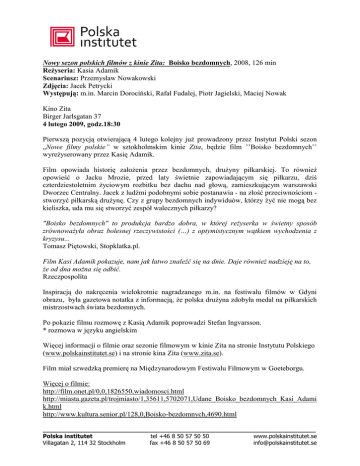 Nowy sezon polskich filmów z kinie Zita: Boisko bezdomnych, 2008, 126 min Reżyseria: Kasia Adamik Scenariusz: Przemysław Nowakowski Zdjęcia: Jacek Petrycki Występują: m.in. Marcin Dorociński, Rafał Fudalej, Piotr Jagielski, Maciej Nowak Kino Zita Birger Jarlsgatan 37 4 lutego 2009, godz.18:30 Pierwszą pozycją otwierającą 4 lutego kolejny już prowadzony przez Instytut Polski sezon „Nowe filmy polskie” w sztokholmskim kinie Zita, będzie film ’’Boisko bezdomnych’’ wyreżyserowany przez Kasię Adamik. Film opowiada historię założenia przez bezdomnych, drużyny piłkarskiej. To również opowieść o Jacku Mrozie, przed laty świetnie zapowiadającym się piłkarzu, dziś czterdziestoletnim życiowym rozbitku bez dachu nad głową, zamieszkującym warszawski Dworzec Centralny. Jacek z ludźmi podobnymi sobie postanawia - na złość przeciwnościom stworzyć piłkarską drużynę. Czy z grupy bezdomnych indywiduów, którzy żyć nie mogą bez kieliszka, uda mu się stworzyć zespół walecznych piłkarzy? "Boisko bezdomnych" to produkcja bardzo dobra, w której reżyserka w świetny sposób zrównoważyła obraz bolesnej rzeczywistości (…) z optymistycznym wątkiem wychodzenia z kryzysu... Tomasz Piętowski, Stopklatka.pl. Film Kasi Adamik pokazuje, nam jak łatwo znaleźć się na dnie. Daje również nadzieję na to, że od dna można się odbić. Rzeczpospolita Inspiracją do nakręcenia wielokrotnie nagradzanego m.in. na festiwalu filmów w Gdyni obrazu, była gazetowa notatka z informacją, że polska drużyna zdobyła medal na piłkarskich mistrzostwach świata bezdomnych. Po pokazie filmu rozmowę z Kasią Adamik poprowadzi Stefan Ingvarsson. * rozmowa w języku angielskim Więcej informacji o filmie oraz sezonie filmowym w kinie Zita na stronie Instytutu Polskiego (www.polskainstitutet.se) i na stronie kina Zita (www.zita.se). Film miał szwedzką premierę na Międzynarodowym Festiwalu Filmowym w Goeteborgu. Więcej o filmie: http://film.onet.pl/0,0,1826550,wiadomosci.html http://miasta.gazeta.pl/trojmiasto/1,35611,5702071,Udane_Boisko_bezdomnych_Kasi_Adami k.html http://www.kultura.senior.pl/128,0,Boisko-bezdomnych,4690.html _______________________________________________________________________ Polska institutet tel +46 8 50 57 50 50 www.polskainstitutet.se Villagatan 2, 114 32 Stockholm fax +46 8 50 57 50 69 [email protected]