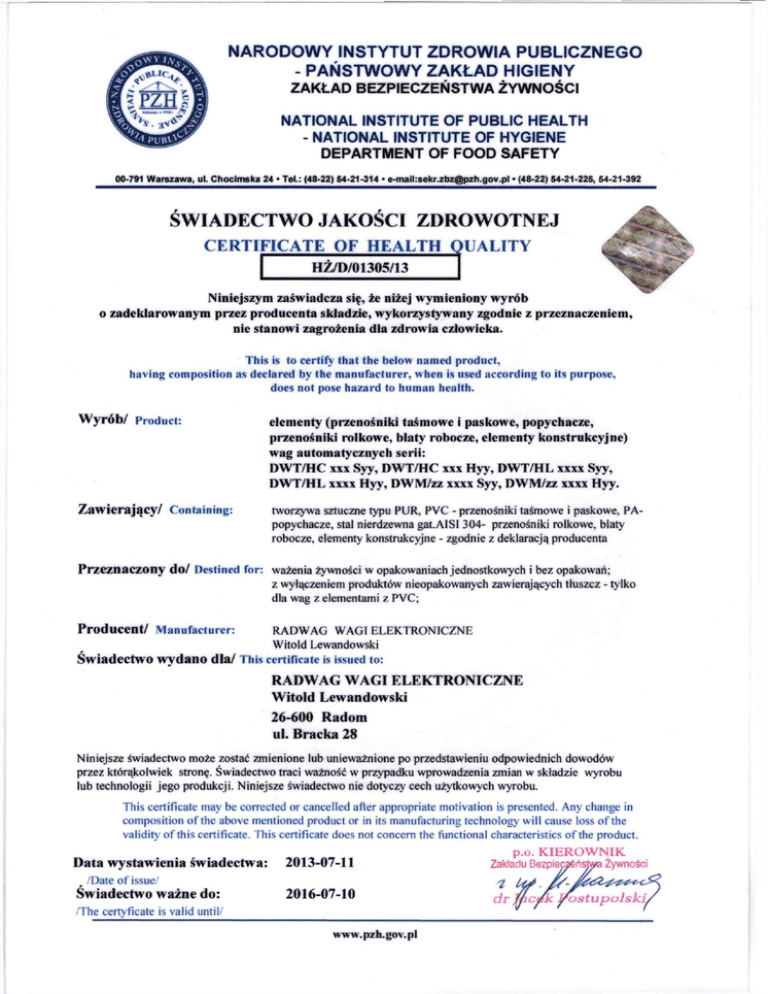 NARODOWY INSTYTUT ZDROWIA PUBLICZNEGO - PAŃSTWOWY ZAKŁAD HIGIENY ZAKŁAD BEZPIECZEŃSTWA ŻYWNOŚCI NATIONAL INSTITUTE O F P U B L I C HEALTH - NATIONAL INSTITUTE O F HYGIENE DEPARTMENT O F FOOD S A F E T Y 00-791 Warszawa, ul. Chocimska 24 • Tel.: (48-22) 54-21-314 »e-mail:[email protected] • (48-22) 54-21-225, 54-21-392 ŚWIADECTWO JAKOŚCI ZDROWOTNEJ CERTIFICATE OF HEALTH OUALITY HŻ/D/01305/13 Niniejszym zaświadcza się, że niżej wymieniony wyrób o zadeklarowanym przez producenta składzie, wykorzystywany zgodnie z przeznaczeniem, nie stanowi zagrożenia dla zdrowia człowieka. This is to certify that the below named product, having composition as declared by the manufacturer, when is used according to its purpose, does not pose hazard to human health. Wyrób/ Product: elementy (przenośniki taśmowe i paskowe, popycliacze, przenośniki rolkowe, blaty robocze, elementy konstrukcyjne) wag automatycznych serii: D W T / H C xxx Syy, D W T / H C xxx Hyy, D W T / H L xxxx Syy, D W T / H L xxxx Hyy, DWM/zz xxxx Syy, DWM/zz xxxx Hyy. Zawierający/ Containing: tworzywa sztuczne typu PUR, PVC - przenośniki taśmowe i paslcowe, PApopychacze, stal nierdzewna gat.AISl 304- przenośniki rolkowe, blaty robocze, elementy konstrukcyjne - zgodnie z deklaracją producenta Przeznaczony do/ Destined for: ważenia żywności w opakowaniach jednostkowych i bez opakowań; z wyłączeniem produktów nieopakowanych zawierających thiszcz - tylko dla wag z elementami z PVC; Producent/ Manufacturer: RADWAG WAGI ELEKTRONICZNE Witold Lewandowski Świadectwo wydano dla/ This certificate is issued to: RADWAG WAGI E L E K T R O N I C Z N E Witold Lewandowski 26-600 Radom ul. Bracka 28 Niniejsze świadectwo może zostać zmienione lub unieważnione po przedstawieniu odpowiednich dowodów przez którąkolwiek stronę. Świadectwo traci ważność w przypadku wprowadzenia zmian w składzie wyrobu lub technologii jego produkcji. Niniejsze świadectwo nie dotyczy cech użytkowych wyrobu. This certificate may be corrected or canceiled after appropriate motivation is presented. Any change in composition of the above mentioned product or in its manufacturing technology will cause loss of the yalidity of this certificate. This certificate does not concem the functional characteristics of the product. p.o. K I E R O W N I K Data wystawienia świadectwa: 2013-07-11 ^ /Date of issue/ Świadectwo ważne do: /rhe certyficate is valid until/ 2016-07-10 www.pzh.gov.pl Zakładu Bezpiec/śńs;^ Żywności