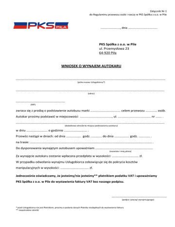 Załącznik Nr 1 do Regulaminu przewozu osób i rzeczy w PKS Spółka z o.o. w Pile ........................, dnia .................................... PKS Spółka z o.o. w Pile ul. Przemysłowa 23 64-920 Piła WNIOSEK O WYNAJEM AUTOKARU ........................................................................................................................................................... (pełna nazwa Usługobiorcy*) .......................................................................................................................................................... (adres) ................................................... (NIP) zwraca się z prośbą o podstawienie autobusu marki .................................. celem przewozu ............. osób. Autokar prosimy podstawić w miejscowości ...................................., ul. ..................................... nr ....... . ....................................................................................................................................................................... (dodatkowe określenie miejsca podstawienia autokaru) w dniu ........................ o godzinie .......................... . Przewóz nastąpi w dniach: od dnia ................. godz. ............ do dnia ................. godz. ............. . na trasie: ......................................................................................................................................... . Do dysponowania wynajętym autobusem upoważniam ................................................................. (nazwisko i imię pilota) Za wynajęcie autokaru zostanie wpłacona przedpłata w wysokości: .............................. zł. W przypadku odwołania wynajmu Usługobiorca zobowiązuje się do pokrycia kosztów manipulacyjnych w wysokości: ................................ zł. Jednocześnie oświadczamy, że jesteśmy/nie jesteśmy** płatnikiem podatku VAT i upoważniamy PKS Spółka z o.o. w Pile do wystawienia faktury VAT bez naszego podpisu. ......................................................... (podpis i pieczęć wynajmującego) * jeżeli Usługobiorca nie jest Płatnikiem, prosimy o podanie danych Płatnika niezbędnych do wystawienia faktury ** niepotrzebne skreślić