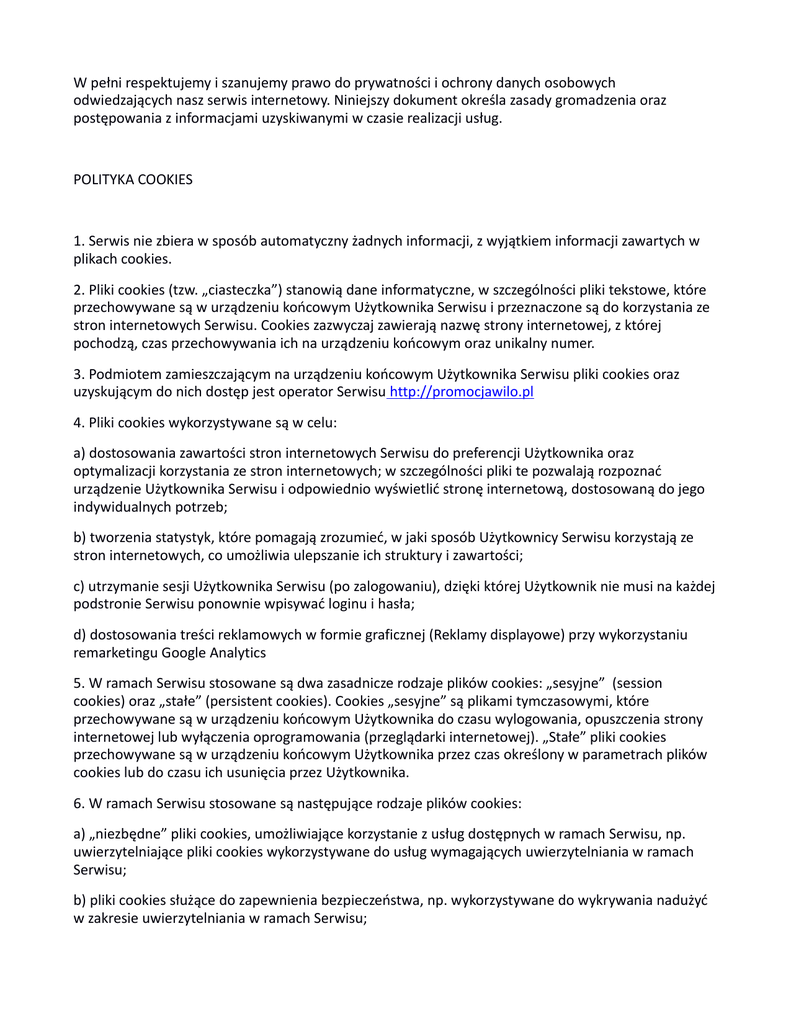 W pełni respektujemy i szanujemy prawo do prywatności i ochrony danych osobowych odwiedzających nasz serwis internetowy. Niniejszy dokument określa zasady gromadzenia oraz postępowania z informacjami uzyskiwanymi w czasie realizacji usług. POLITYKA COOKIES 1. Serwis nie zbiera w sposób automatyczny żadnych informacji, z wyjątkiem informacji zawartych w plikach cookies. 2. Pliki cookies (tzw. „ciasteczka”) stanowią dane informatyczne, w szczególności pliki tekstowe, które przechowywane są w urządzeniu końcowym Użytkownika Serwisu i przeznaczone są do korzystania ze stron internetowych Serwisu. Cookies zazwyczaj zawierają nazwę strony internetowej, z której pochodzą, czas przechowywania ich na urządzeniu końcowym oraz unikalny numer. 3. Podmiotem zamieszczającym na urządzeniu końcowym Użytkownika Serwisu pliki cookies oraz uzyskującym do nich dostęp jest operator Serwisu http://promocjawilo.pl 4. Pliki cookies wykorzystywane są w celu: a) dostosowania zawartości stron internetowych Serwisu do preferencji Użytkownika oraz optymalizacji korzystania ze stron internetowych; w szczególności pliki te pozwalają rozpoznać urządzenie Użytkownika Serwisu i odpowiednio wyświetlić stronę internetową, dostosowaną do jego indywidualnych potrzeb; b) tworzenia statystyk, które pomagają zrozumieć, w jaki sposób Użytkownicy Serwisu korzystają ze stron internetowych, co umożliwia ulepszanie ich struktury i zawartości; c) utrzymanie sesji Użytkownika Serwisu (po zalogowaniu), dzięki której Użytkownik nie musi na każdej podstronie Serwisu ponownie wpisywać loginu i hasła; d) dostosowania treści reklamowych w formie graficznej (Reklamy displayowe) przy wykorzystaniu remarketingu Google Analytics 5. W ramach Serwisu stosowane są dwa zasadnicze rodzaje plików cookies: „sesyjne” (session cookies) oraz „stałe” (persistent cookies). Cookies „sesyjne” są plikami tymczasowymi, które przechowywane są w urządzeniu końcowym Użytkownika do czasu wylogowania, opuszczenia strony internetowej lub wyłączenia oprogramowania (przeglądarki internetowej). „Stałe” pliki cookies przechowywane są w urządzeniu końcowym Użytkownika przez czas określony w parametrach plików cookies lub do czasu ich usunięcia przez Użytkownika. 6. W ramach Serwisu stosowane są następujące rodzaje plików cookies: a) „niezbędne” pliki cookies, umożliwiające korzystanie z usług dostępnych w ramach Serwisu, np. uwierzytelniające pliki cookies wykorzystywane do usług wymagających uwierzytelniania w ramach Serwisu; b) pliki cookies służące do zapewnienia bezpieczeństwa, np. wykorzystywane do wykrywania nadużyć w zakresie uwierzytelniania w ramach Serwisu; c) „wydajnościowe” pliki cookies, umożliwiające zbieranie informacji o sposobie korzystania ze stron internetowych Serwisu; d) „funkcjonalne” pliki cookies, umożliwiające „zapamiętanie” wybranych przez Użytkownika ustawień i personalizację interfejsu Użytkownika, np. w zakresie wybranego języka lub regionu, z którego pochodzi Użytkownik, rozmiaru czcionki, wyglądu strony internetowej itp.; e) „reklamowe” pliki cookies, umożliwiające dostarczanie Użytkownikom treści reklamowych bardziej dostosowanych do ich zainteresowań. 7. W wielu przypadkach oprogramowanie służące do przeglądania stron internetowych (przeglądarka internetowa) domyślnie dopuszcza przechowywanie plików cookies w urządzeniu końcowym Użytkownika. Użytkownicy Serwisu mogą dokonać w każdym czasie zmiany ustawień dotyczących plików cookies. Ustawienia te mogą zostać zmienione w szczególności w taki sposób, aby blokować automatyczną obsługę plików cookies w ustawieniach przeglądarki internetowej bądź informować o ich każdorazowym zamieszczeniu w urządzeniu Użytkownika Serwisu. Szczegółowe informacje o możliwości i sposobach obsługi plików cookies dostępne są w ustawieniach oprogramowania (przeglądarki internetowej). Użytkownicy mogą zablokować usługę Analytics dla reklam displayowych oraz dostosowywać reklamy w sieci reklamowej Google w Menedżerze preferencji reklam. Można również pobrać program blokujący Google Analytics ze strony https://tools.google.com/dlpage/gaoptout/ 8. Operator Serwisu informuje, że ograniczenia stosowania plików cookies mogą wpłynąć na niektóre funkcjonalności dostępne na stronach internetowych Serwisu. 9. Pliki cookies zamieszczane w urządzeniu końcowym Użytkownika Serwisu i wykorzystywane mogą być również przez współpracujących z operatorem Serwisu reklamodawców oraz partnerów. 10. Więcej informacji na temat plików cookies dostępnych jest pod adresem http://wszystkoociasteczkach.pl lub w sekcji „Pomoc” w menu przeglądarki internetowej.