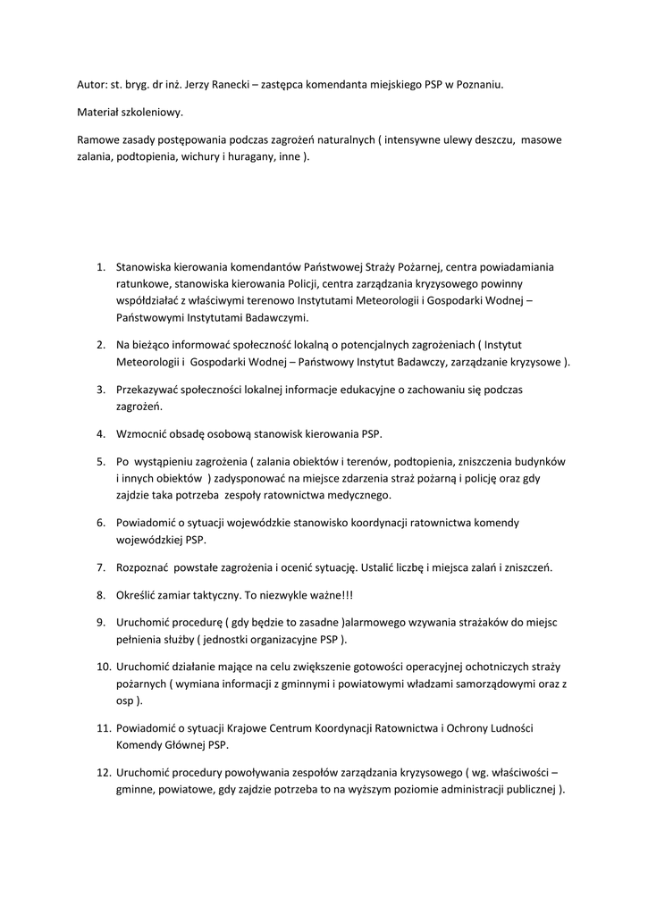 Autor: st. bryg. dr inż. Jerzy Ranecki – zastępca komendanta miejskiego PSP w Poznaniu. Materiał szkoleniowy. Ramowe zasady postępowania podczas zagrożeń naturalnych ( intensywne ulewy deszczu, masowe zalania, podtopienia, wichury i huragany, inne ). 1. Stanowiska kierowania komendantów Państwowej Straży Pożarnej, centra powiadamiania ratunkowe, stanowiska kierowania Policji, centra zarządzania kryzysowego powinny współdziałać z właściwymi terenowo Instytutami Meteorologii i Gospodarki Wodnej – Państwowymi Instytutami Badawczymi. 2. Na bieżąco informować społeczność lokalną o potencjalnych zagrożeniach ( Instytut Meteorologii i Gospodarki Wodnej – Państwowy Instytut Badawczy, zarządzanie kryzysowe ). 3. Przekazywać społeczności lokalnej informacje edukacyjne o zachowaniu się podczas zagrożeń. 4. Wzmocnić obsadę osobową stanowisk kierowania PSP. 5. Po wystąpieniu zagrożenia ( zalania obiektów i terenów, podtopienia, zniszczenia budynków i innych obiektów ) zadysponować na miejsce zdarzenia straż pożarną i policję oraz gdy zajdzie taka potrzeba zespoły ratownictwa medycznego. 6. Powiadomić o sytuacji wojewódzkie stanowisko koordynacji ratownictwa komendy wojewódzkiej PSP. 7. Rozpoznać powstałe zagrożenia i ocenić sytuację. Ustalić liczbę i miejsca zalań i zniszczeń. 8. Określić zamiar taktyczny. To niezwykle ważne!!! 9. Uruchomić procedurę ( gdy będzie to zasadne )alarmowego wzywania strażaków do miejsc pełnienia służby ( jednostki organizacyjne PSP ). 10. Uruchomić działanie mające na celu zwiększenie gotowości operacyjnej ochotniczych straży pożarnych ( wymiana informacji z gminnymi i powiatowymi władzami samorządowymi oraz z osp ). 11. Powiadomić o sytuacji Krajowe Centrum Koordynacji Ratownictwa i Ochrony Ludności Komendy Głównej PSP. 12. Uruchomić procedury powoływania zespołów zarządzania kryzysowego ( wg. właściwości – gminne, powiatowe, gdy zajdzie potrzeba to na wyższym poziomie administracji publicznej ). 13. Teren, na którym wystąpiło zagrożenie ( zalania, zniszczenia, inne ) podzielić na odcinki bojowe ( obszary ratownicze ) i odpowiednio je nazwać lub przydzielić numery. 14. W wyznaczonych obszarach zorganizować procesy kierowania działaniem ratowniczym na poziomie interwencyjnym ( wyznaczyć kierujących i przydzielić im zadania ). 15. Zorganizować kierowanie taktyczne, którym będzie objęty cały teren zagrożenia ( wszystkie obszary ratownicze ). 16. Kierujący na poziomie taktycznym, w zależności od sytuacji, powinien powołać sztab działań ratowniczych i wyznaczyć miejsce jego funkcjonowania. 17. Przy stanowisku kierowania PSP powołać zespół operacyjny, w skład którego wejdą strażacy wyznaczeni przez komendanta. Zadaniem zespołu będzie analizowanie i koordynowanie sytuacji na terenie, gdzie wystąpiło zagrożenie oraz na obszarze chronionym komendy. 18. Planować użycie do działań ratowniczych odwodów operacyjnych. 19. W zależności od sytuacji, uruchomić kierowanie działaniem ratowniczym na poziomie strategicznym i zorganizować sztab strategiczny. 20. Kierujący działaniem ratowniczym na poziomie taktycznym powinien zorganizować punkt przyjęcia sił i środków. To z tego punktu siły i środki będą dysponowane do poszczególnych odcinków bojowych (obszarów ratowniczych). 21. Należy wyznaczyć dowódcę punktu przyjęcia sił i środków. 22. Kierujący działaniem ratowniczym, w zależności od sytuacji, może użyć podczas procesu kierowania samochodu drabiny mechanicznej do obserwacji terenu akcji ratowniczej. 23. Zorganizować łączność na terenie akcji ratowniczej ( kierujący działaniem ratowniczym na poziomie taktycznym utrzymuje łączność z kierującymi interwencyjnymi na kanale dowodzenia i współdziałania, a kierujący interwencyjni z podległymi siłami i środkami na kanałach ratowniczo-gaśniczych ). Należy także zorganizować łączność z policją, innymi służbami i inspekcjami. Zespół operacyjny przy powiatowym ( miejskim ) stanowisku kierowania PSP utrzymuje łączność z zespołami zarządzania kryzysowego i sztabem działań ratowniczych na poziomie taktycznym ( sztab działa na terenie akcji ratowniczej ). 24. Zaplanować skierowanie do punktu przyjęcia sił i środków pomp przeciwpowodziowych, łodzi, namiotów , odzieży ochronnej do prac przeciwpowodziowych, worków przeciwpowodziowych i zapór przeciwpowodziowych. Kierujący działaniem ratowniczym na poziomie taktycznym, w oparciu o wnioski kierujących na poziomie interwencyjnym i analizę sztabu przedstawi zespołowi operacyjnemu zapotrzebowanie operacyjno-logistyczne. 25. Podczas zdarzeń ( masowe zalania, podtopienia ) w miejscowościach i niedużych miastach ( kilkanaście lub kilkadziesiąt tysięcy ludzi ) zorganizować , najlepiej w obiekcie miejscowej strażnicy lub urzędu punkt informacyjno-konsultacyjny dla mieszkańców zgłaszających się po pomoc. 26. Zorganizować punkt informacyjny dla środków masowego przekazu. Wyznaczyć dowódcę tego punktu i określić zasady współdziałania z kierującym działaniem ratowniczym na poziomie taktycznym. 27. Współdziałać , na poziomie organizacyjnym i technicznym, z przedsiębiorstwami wodociągów i kanalizacji. Kierownictwo lub ich przedstawiciele powinni wspomagać kierującego działaniem ratowniczym na poziomie taktycznym ( praca w sztabie działań ratowniczych ). 28. Zabezpieczyć ujęcia wody przed zanieczyszczeniami. 29. Należy prognozować możliwość zalania obiektów infrastruktury krytycznej. 30. Opracować politykę medialną na czas zagrożenia ( cele, zadania, miejsca wywiadów, konferencji, inne ). 31. Wyznaczyć obszary, z których będzie planowana ewakuacja ludzi. Jak najszybciej poinformować ludzi o planowanej ewakuacji. 32. Zorganizować miejsca do których będą ewakuowani ludzie. Zapewnić opiekę socjalną, medyczną i psychologiczną. 33. 