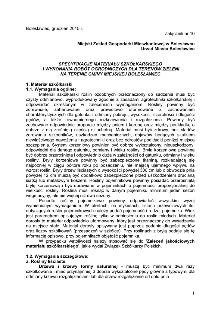 Zał. nr 10 Specyfikacje materiału szkółkarskiego i wykonania robót
