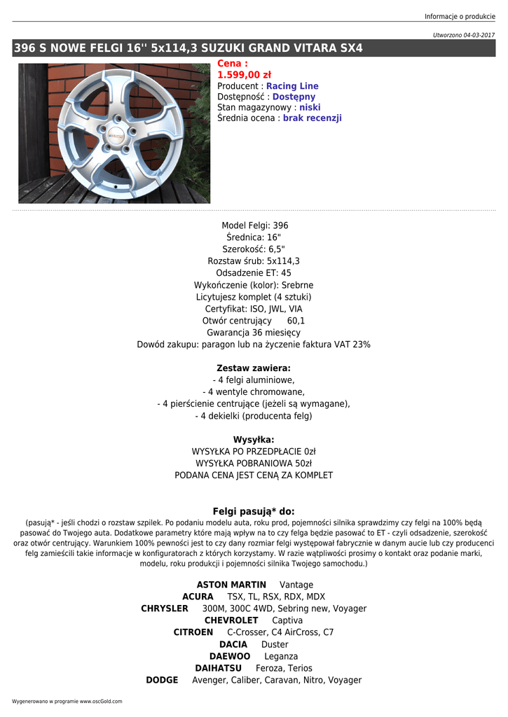 Informacje o produkcie Utworzono 04-03-2017 396 S NOWE FELGI 16'' 5x114,3 SUZUKI GRAND VITARA SX4 Cena : 1.599,00 zł Producent : Racing Line Dostępność : Dostępny Stan magazynowy : niski Średnia ocena : brak recenzji Model Felgi: 396 Średnica: 16" Szerokość: 6,5" Rozstaw śrub: 5x114,3 Odsadzenie ET: 45 Wykończenie (kolor): Srebrne Licytujesz komplet (4 sztuki) Certyfikat: ISO, JWL, VIA Otwór centrujący 60,1 Gwarancja 36 miesięcy Dowód zakupu: paragon lub na życzenie faktura VAT 23% Zestaw zawiera: - 4 felgi aluminiowe, - 4 wentyle chromowane, - 4 pierścienie centrujące (jeżeli są wymagane), - 4 dekielki (producenta felg) Wysyłka: WYSYŁKA PO PRZEDPŁACIE 0zł WYSYŁKA POBRANIOWA 50zł PODANA CENA JEST CENĄ ZA KOMPLET Felgi pasują* do: (pasują* - jeśli chodzi o rozstaw szpilek. Po podaniu modelu auta, roku prod, pojemności silnika sprawdzimy czy felgi na 100% będą pasować do Twojego auta. Dodatkowe parametry które mają wpływ na to czy felga będzie pasować to ET - czyli odsadzenie, szerokość oraz otwór centrujący. Warunkiem 100% pewności jest to czy dany rozmiar felgi występował fabrycznie w danym aucie lub czy producenci felg zamieścili takie informacje w konfiguratorach z których korzystamy. W razie wątpliwości prosimy o kontakt oraz podanie marki, modelu, roku produkcji i pojemności silnika Twojego samochodu.) ASTON MARTIN Vantage ACURA TSX, TL, RSX, RDX, MDX CHRYSLER 300M, 300C 4WD, Sebring new, Voyager CHEVROLET Captiva CITROEN C-Crosser, C4 AirCross, C7 DACIA Duster DAEWOO Leganza DAIHATSU Feroza, Terios DODGE Avenger, Caliber, Caravan, Nitro, Voyager Wygenerowano w programie www.oscGold.com FIAT Sedici FORD Escape, Maverick, Probe HONDA Accord (>03), Accord Coupe (>98) + Type R, Civic, Civic Sport (>04) + TypeR, Civic Tourer (2014-), CR-V, CR-Z, HR-V, FR-V, Integra Type-R, NSX, S200, Odyssey, Prelude (4WS, BB6, BB8) (97-02), Shuttle, Stream HYUNDAI Coupe Tiburon (>02), Elantra, Genesis Coupe, Grandeur, I30, I30 Coupe, I40, IX20, IX35, IX35 Facelift, IX55, Santa Fe, Grand Santa Fe, Sonata new, Trajet, Tucson, XG25/XG30, Veloster INFINITI FX35, FX45, EX35, G35, G37, I30, M35, M45, Q45, Q50 JEEP Grand Cherokee (92-99), Patriot, Compass KIA Carnival, Carens, Ceed, Ceed SW, Magentis new, Opirus, Optima, Pro Ceed, Sedeona, Soul, Sorento II (09-), Sorento III, Sprotage II, Sportage III, Venga LANCIA Flavia LAND ROVER Freelander LEXUS GS 300/430 (>98), IS 200/300 (>98), IS250, IS220d, LS 400, LS 430, RX300, SC 430 MAZDA 3, 5, 6, CX5, CX7, CX9, 323 F (>00), 626 (97-03), MPV, MX-6, Premacy, RX8, Tribute, Xedos 6, Xedos 9 MITSUBISHI ASX, Eclipse (D20, D30), Grandis, Lancer neu, Outlander, Pajero Pinin, Sigma, Space Gear NISSAN 200SX (97-00), 350Z, Almera Tino, Altima, e-NV200, Juke, Maxima (95-00), Maxima QX (>00), Murano, Primera (02-), Qashqai, Primastar (15-), Pulsar, X-Trail, Opel Antara, Cascada, Sintra, Vivaro B PEUGEOT 4007, 4008, RENAULT Fluence, Koleos, Laguna III, Latitute, Megane III(cabrio), Scenic III, Grand Scenic III, Trafic III SUBARU Impreza STI, Tribeca SUZUKI Grand Vitara new, Kizashi, Swift Sport, SX 4 TOYOTA Auris, Auris Touring Sports, Avensis Verso, Camry (>96), Corolla Verso new, Hiace, Picnic (XM1), Previa, Prius+, RAV4, Supra, Verso Zgodnie z Kodeksem PWP art.156 ust 3, emblematy widoczne na felgach mają charakter wyłącznie informacyjny i nie należy się tym sugerować, że jest to produkt oryginalny danego producenta samochodu. Alufelgi dobieramy wg parametrów katalogowych producentów. W przypadku niektórych modeli aut lub felg zachodzi konieczność zastosowania dystansów, śrub/nakrętek ampułkowych. Ponieważ, zawsze może zajść taka sytuacja w której katalog/konfigurator wprowadzi w błąd sprzedawcę zaleca się przed montażem opon przyłożyć felgę na piastę i sprawdzić czy felga nigdzie nie będzie obcierać. Po założeniu opon zwrot felg będzie nie możliwy.