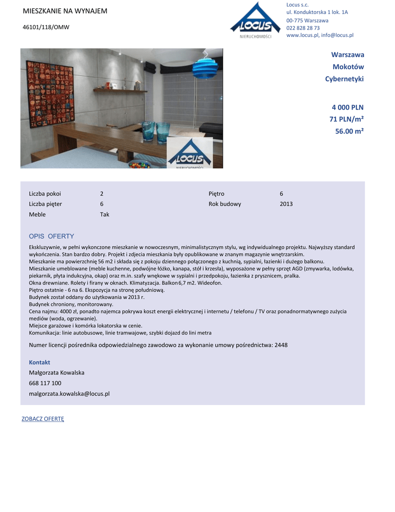 Locus s.c. ul. Konduktorska 1 lok. 1A 00-775 Warszawa 022 828 28 73 www.locus.pl, [email protected] MIESZKANIE NA WYNAJEM 46101/118/OMW Warszawa Mokotów Cybernetyki 4 000 PLN 71 PLN/m² 56.00 m² Liczba pokoi 2 WŝħƚƌŽ 6 >ŝĐnjďĂƉŝħƚĞƌ 6 Rok budowy 2013 Meble Tak OPIS OFERTY ŬƐŬůƵnjLJǁŶŝĞ͕ǁƉĞųŶŝǁLJŬŽŶĐnjŽŶĞŵŝĞƐnjŬĂŶŝĞǁŶŽǁŽĐnjĞƐŶLJŵ͕ŵŝŶŝŵĂůŝƐƚLJĐnjŶLJŵƐƚLJůƵ͕ǁŐŝŶĚLJǁŝĚƵĂůŶĞŐŽƉƌŽũĞŬƚƵ͘EĂũǁLJǏƐnjLJƐƚĂŶĚĂƌĚ ǁLJŬŽŷĐnjĞŶŝĂ͘^ƚĂŶďĂƌĚnjŽĚŽďƌLJ͘WƌŽũĞŬƚŝnjĚũĞĐŝĂŵŝĞƐnjŬĂŶŝĂďLJųLJŽƉƵďůŝŬŽǁĂŶĞǁnjŶĂŶLJŵŵĂŐĂnjLJŶŝĞǁŶħƚƌnjĂƌƐŬŝŵ͘ DŝĞƐnjŬĂŶŝĞŵĂƉŽǁŝĞƌnjĐŚŶŝħ56 m2ŝƐŬųĂĚĂƐŝħnjƉŽŬŽũƵĚnjŝĞŶŶĞŐŽƉŽųČĐnjŽŶĞŐŽnjŬƵĐŚŶŝČ͕ƐLJƉŝĂůŶŝ͕ųĂnjŝĞŶŬŝŝĚƵǏĞŐŽďĂůŬŽŶƵ͘ DŝĞƐnjŬĂŶŝĞƵŵĞďůŽǁĂŶĞ;ŵĞďůĞŬƵĐŚĞŶŶĞ͕ƉŽĚǁſũŶĞųſǏŬŽ͕ŬĂŶĂƉĂ͕ƐƚſųŝŬƌnjĞƐųĂͿ͕ǁLJƉŽƐĂǏŽŶĞǁƉĞųŶLJƐƉƌnjħƚ';njŵLJǁĂƌŬĂ͕ůŽĚſǁŬĂ͕ ƉŝĞŬĂƌŶŝŬ͕ƉųLJƚĂŝŶĚƵŬĐLJũŶĂ͕ŽŬĂƉͿŽƌĂnjŵ͘ŝŶ͘ƐnjĂĨLJǁŶħŬŽǁĞǁƐLJƉŝĂůŶŝŝƉƌnjĞĚƉŽŬŽũƵ͕ųĂnjŝĞŶŬĂnjƉƌLJƐnjŶŝĐĞŵ͕ƉƌĂůŬĂ͘ Okna drewniane. Rolety i firany w oknach. Klimatyzacja. Balkon 6,7 m2. Wideofon. WŝħƚƌŽŽƐƚĂƚŶŝĞͲ6 na 6͘ŬƐƉŽnjLJĐũĂŶĂƐƚƌŽŶħƉŽųƵĚŶŝŽǁČ͘ ƵĚLJŶĞŬnjŽƐƚĂųŽĚĚĂŶLJĚŽƵǏLJƚŬŽǁĂŶŝĂǁ2013 r. Budynek chroniony, monitorowany. Cena najmu: 4000njų͕ƉŽŶĂĚƚŽŶĂũĞŵĐĂƉŽŬƌLJǁĂŬŽƐnjƚĞŶĞƌŐŝŝĞůĞŬƚƌLJĐnjŶĞũŝŝŶƚĞƌŶĞƚƵͬƚĞůĞĨŽŶƵͬdsŽƌĂnjƉŽŶĂĚŶŽƌŵĂƚLJǁŶĞŐŽnjƵǏLJĐŝĂ mediów (woda, ogrzewanie). DŝĞũƐĐĞŐĂƌĂǏŽǁĞŝŬŽŵſƌŬĂůŽŬĂƚŽƌƐŬĂǁĐĞŶŝĞ͘ Komunikacja: linie autobusowe, linie tramwajowe, szybki dojazd do lini metra EƵŵĞƌůŝĐĞŶĐũŝƉŽƑƌĞĚŶŝŬĂŽĚƉŽǁŝĞĚnjŝĂůŶĞŐŽnjĂǁŽĚŽǁŽnjĂǁLJŬŽŶĂŶŝĞƵŵŽǁLJƉŽƑƌĞĚŶŝĐƚǁĂ͗Ϯϰϰϴ Kontakt DĂųŐŽƌnjĂƚĂ<ŽǁĂůƐŬĂ 668 117 100 [email protected] KK&Zd%