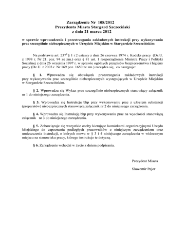 Zarządzenie Nr 108/2012 Prezydenta Miasta Stargard Szczeciński z dnia 21 marca 2012 w sprawie wprowadzenia i przestrzegania zakładowych instrukcji przy wykonywaniu prac szczególnie niebezpiecznych w Urzędzie Miejskim w Stargardzie Szczecińskim Na podstawie art. 2374 § 1 i 2 ustawy z dnia 26 czerwca 1974 r. Kodeks pracy (Dz.U. z 1998 r. Nr 21, poz. 94 ze zm.) oraz § 81 ust. 1 rozporządzenia Ministra Pracy i Polityki Socjalnej z dnia 26 września 1997 r. w sprawie ogólnych przepisów bezpieczeństwa i higieny pracy (Dz.U. z 2003 r. Nr 169 poz. 1650 ze zm.) zarządza się, co następuje: § 1. Wprowadza się obowiązek przestrzegania zakładowych instrukcji przy wykonywaniu prac szczególnie niebezpiecznych występujących w Urzędzie Miejskim w Stargardzie Szczecińskim. § 2. Wprowadza się Wykaz prac szczególnie niebezpiecznych stanowiący załącznik nr 1 do niniejszego zarządzenia. § 3. Wprowadza się Instrukcję bhp przy wykonywaniu prac z użyciem substancji (preparatów) niebezpiecznych stanowiącą załącznik nr 2 do niniejszego zarządzenia. § 4. Wprowadza się Instrukcję bhp przy wykonywaniu prac na wysokości stanowiącą załącznik nr 3 do niniejszego zarządzenia. § 5. Zobowiązuje się wszystkie osoby kierujące komórkami organizacyjnymi Urzędu Miejskiego do zapoznania podległych pracowników z niniejszym zarządzeniem oraz umieszczenia instrukcji, o których mowa w § 3 i 4 niniejszego zarządzenia w widocznym miejscu na stanowisku pracy, którego instrukcje te dotyczą. § 6. Zarządzenie wchodzi w życie z dniem podpisania. Prezydent Miasta Sławomir Pajor UZASADNIENIE Art. 2374 § 1 ustawy Kodeks pracy (Dz.U. z 1998 r. Nr 21, poz. 94 ze zm.) nakłada na pracodawcę obowiązek zapoznawania pracowników z przepisami i zasadami bhp dotyczącymi wykonywanych przez nich prac oraz wydawania instrukcji na stanowiskach pracy. Instrukcje bhp powinny w sposób zrozumiały i jednoznaczny wskazywać czynności, które pracownik powinien wykonać przed rozpoczęciem danej pracy, zasady i sposoby bezpiecznego wykonywania tej pracy, czynności do wykonania po jej zakończeniu oraz zasady postępowania w sytuacjach awaryjnych, stwarzających zagrożenie dla życia lub zdrowia pracowników. Na podstawie § 81 ust. 1 rozporządzenia Ministra Pracy i Polityki Socjalnej z dnia 26 września 1997 r. w sprawie ogólnych przepisów bezpieczeństwa i higieny pracy (Dz.U. z 2003 r. Nr 169 poz. 1650 ze zm.) pracodawca określa szczegółowe wymagania bezpieczeństwa i higieny pracy prac szczególnie niebezpiecznych, zapewniając odpowiedni nadzór, środki zabezpieczające oraz instruktaż pracowników. Załącznik nr 1 do Zarządzenia Nr 108/2012 Prezydenta Miasta Stargard Szczeciński z dnia 21 marca 2012 WYKAZ PRAC SZCZEGÓLNIE NIEBEZPIECZNYCH 1. Prace szczególnie niebezpieczne wykonywane przez pracowników Urzędu Miejskiego to: 1) prace na wysokości, 2) prace z użyciem materiałów niebezpiecznych, takich jak substancje i preparaty chemiczne. 2. Podstawowe środki techniczne i organizacyjne zapobiegające niebezpieczeństwom Przed przystąpieniem do prac szczególnie niebezpiecznych osoba kierująca pracownikami przeprowadza instruktaż pracowników obejmujący w szczególności: 1) imienny podział pracy, 2) kolejność wykonywania zadań, 3) wymagania bezpieczeństwa i higieny pracy przy poszczególnych czynnościach, 4) określenie zasad postępowania w przypadku wystąpienia zagrożenia, 5) określenie rodzaju środków ochrony indywidualnej, jakie pracownicy muszą stosować w celu zabezpieczenia się przed skutkami zagrożeń, 6) informowanie pracowników o właściwościach fizycznych oraz chemicznych stosowanych materiałów niebezpiecznych oraz o ryzyku dla zdrowia i bezpieczeństwa, 7) określenie zasad bezpośredniego nadzoru. Pracownicy, przed przystąpieniem do wykonywania prac szczególnie niebezpiecznych, powinni być odpowiednio przygotowani zapoznając się z przepisami i zasadami bezpieczeństwa i higieny pracy. 3. Wykaz prac szczególnie niebezpiecznych występujących w Urzędzie Miejskim w Stargardzie Szczecińskim przedstawia poniższa tabela: Lp. Rodzaj wykonywanej pracy niebezpiecznej 1 Praca na wysokości wykonywana przy czynności mycia okien, wykonywana do wysokości 2 m nad poziomem podłogi, przy użyciu drabin lub mostka Stanowisko Pracownik gospodarczy sprzątaczka Stosowane środki bezpieczeństwa 1. Instruktaż przed wykonaniem pracy. 2. Imienny podział pracy. 3. Zapoznanie z instrukcją bhp przy wykonywaniu prac na wysokości 2 Prace z użyciem materiałów niebezpiecznych, takich jak substancje i preparaty chemiczne – środki drażniące stosowane do mycia urządzeń sanitarnych, umywalek, sanitariatów 3 Praca na wysokości wykonywana przy czynnościach konserwacyjnych, naprawach, pracach malarskich, wymianie świetlówek, żarówek wykonywana do wysokości 2 m nad poziomem podłogi, przy użyciu drabin Pracownik gospodarczy sprzątaczka Pracownik gospodarczy konserwator 4 Prace z użyciem materiałów niebezpiecznych, takich jak substancje i preparaty chemiczne – szkodliwe i drażniące stosowane przy malowaniu, czyszczeniu, konserwacji Pracownik gospodarczy – konserwator 5 Praca na wysokości wykonywana przy układaniu dokumentów na wyższych regałach wykonywana do wysokości 2 m nad poziomem podłogi, przy użyciu drabin Pracownicy zatrudnieni na stanowiskach administracyjno biurowych 1. Instruktaż przed wykonaniem pracy. 2. Imienny podział pracy. 3. Zapoznanie z instrukcją bhp przy wykonywaniu prac z użyciem substancji (preparatów) niebezpiecznych. 4. Zapoznanie z kartami charakterystyki substancji niebezpiecznej 1. Instruktaż przed wykonaniem pracy. 2. Imienny podział pracy. 3. Zapoznanie z instrukcją bhp przy wykonywaniu prac na wysokości 1. Instruktaż przed wykonaniem pracy. 2. Imienny podział pracy. 3. Zapoznanie z instrukcją bhp przy wykonywaniu praca z użyciem substancji (preparatów) niebezpiecznych. 4