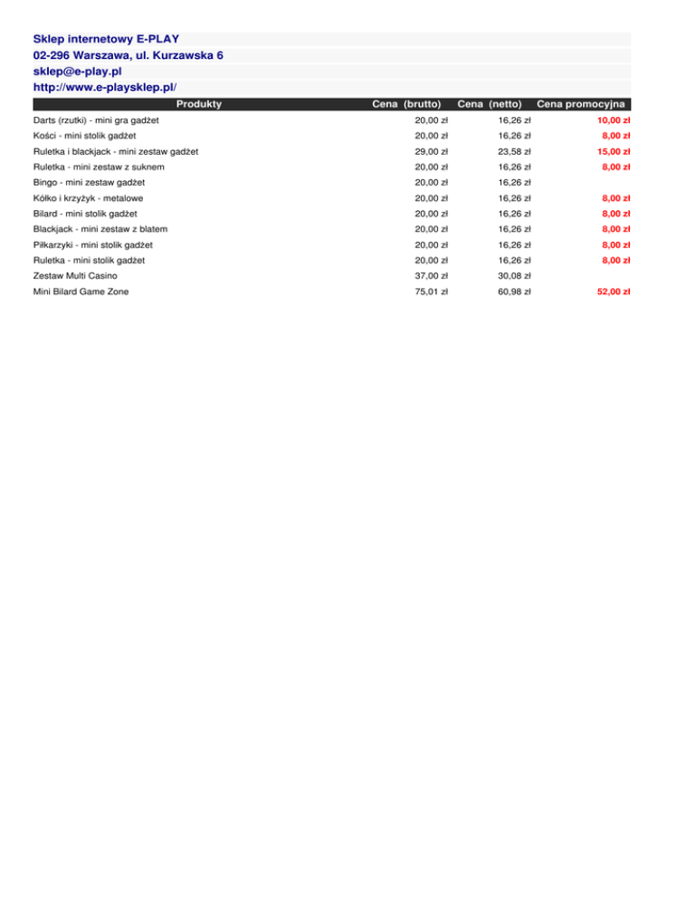 Sklep internetowy E-PLAY 02-296 Warszawa, ul. Kurzawska 6 [email protected] http://www.e-playsklep.pl/ Produkty Cena (brutto) Cena (netto) Cena promocyjna Darts (rzutki) - mini gra gadżet 20,00 zł 16,26 zł 10,00 zł Kości - mini stolik gadżet 20,00 zł 16,26 zł 8,00 zł Ruletka i blackjack - mini zestaw gadżet 29,00 zł 23,58 zł 15,00 zł Ruletka - mini zestaw z suknem 20,00 zł 16,26 zł 8,00 zł Bingo - mini zestaw gadżet 20,00 zł 16,26 zł Kółko i krzyżyk - metalowe 20,00 zł 16,26 zł 8,00 zł Bilard - mini stolik gadżet 20,00 zł 16,26 zł 8,00 zł Blackjack - mini zestaw z blatem 20,00 zł 16,26 zł 8,00 zł Piłkarzyki - mini stolik gadżet 20,00 zł 16,26 zł 8,00 zł Ruletka - mini stolik gadżet 20,00 zł 16,26 zł 8,00 zł Zestaw Multi Casino 37,00 zł 30,08 zł Mini Bilard Game Zone 75,01 zł 60,98 zł 52,00 zł