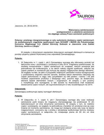 Jaworzno, dn. 28.02.2014r. Wykonawcy zainteresowani postępowaniem o udzielenie zamówienia nie objętego ustawą Prawo zamówień publicznych Dotyczy: przetargu nieograniczonego w celu wyłonienia dostawcy części zamiennych do podwieszanych ciągników spalinowych typu SCHARF i BIZON dla Południowego Koncernu Węglowego S.A. Zakład Górniczy Sobieski w Jaworznie oraz Zakład Górniczy Janina w Libiążu” W związku z otrzymanym zapytaniem dotyczącym wymagań ofertowych w temacie jw. poniżej cytujemy pytanie Wykonawcy oraz odpowiedź Zamawiającego. Pytanie: 1. W Załączniku nr 1, część I, pkt.3 Zamawiający wymaga aby oferowany produkt był fabrycznie nowy i pochodzący z produkcji w roku 2014. Pragniemy poinformować, że dostawy komponentów i części zamiennych do urządzeń, których produkcja jest jednostkowa lub krótkoseryjna, a do takich należą ciągniki spalinowe, odbywa się często partiami w momencie gdy kończą się zapasy magazynowe danego elementu. Ze względu na fakt, że tylko w przypadku większych zamówień można wynegocjować u poddostawcy dogodne warunki cenowe, dostawy takich elementów odbywają się często jednorazowo w ciągu roku (przykładem są rolki jezdne i nośne) i nie jest możliwe zapewnienie produkcji z bieżącego roku, pomimo tego, że dostarczony element będzie elementem nowym i oryginalnym. W związku z tym prosimy o modyfikację w/w wymagania, w taki sposób by Wykonawca miał możliwość dostarczenia części nowych, ale wyprodukowanych w roku wcześniejszym niż 2014. Odpowiedź: Zamawiający podtrzymuje zapisy wymagań ofertowych. Pytanie: 2. W Załączniku nr 1, część II, pkt.1 Zamawiający wymaga aby czas realizacji zamówienia partii towaru do magazynu Zamawiającego nie przekraczał 14 dni kalendarzowych od dnia otrzymania zamówienia. W związku z tym, że niektóre części i podzespoły, ze względu na jednostkowy charakter ich produkcji oraz jej czas trwania od momentu zamówienia, nie mogą być dostępne przez cały czas na stanie magazynowym, zwracamy się z prośbą o akceptację wydłużonego terminu dostawy części wymienionych w załączniku do niniejszego pisma do 60 dni od dnia otrzymania zamówienia. Strona 2 z 3 Odpowiedź: Zamawiający podtrzymuje zapisy wymagań ofertowych. Pytanie: 3. W Załączniku nr 1, część II, pkt.2 Zamawiający wymaga aby minimalny okres gwarancji wynosił 12 miesięcy od daty dokonania odbioru towaru w magazynie kupującego. Ponieważ w zakres dostaw wchodzą również elementy eksploatacyjne, szybkozużywające się i o ograniczonej gwarancji zwracamy się z prośbą o uzupełnienie w/w wymagania o następujące zapisy (oraz uzupełnić o nie zapisy §5, pkt.12 Załącznika nr 5): „Gwarancją objęte jest całe urządzenie, z wyłączeniem wyspecyfikowanych poniżej części i podzespołów: a. materiały eksploatacyjne, m.in.: oleje, smary i hydrauliczne płyny robocze, filtry i wkłady filtracyjne oraz separatory i odolejacze, żarówki i diody, bezpieczniki i elementy topikowe, klocki i szczęki hamulcowe, tarcze hamulcowe wciągników; b. części szybkozużywające się, m.in.: rolki nośne i prowadzące, linki i wałki giętkie, gumowe odbojniki i elementy amortyzujące, instalacja gaśnicza (bez zbiornika środka gaśniczego), przewody elektryczne, paski klinowe, sworznie, sprzęgi i elementy połączeniowe zestawów, sprężyny i dźwignie w układzie hamulca, haki ładunkowe, łańcuchy i rolki łańcuchowe, uszczelnienia w układzie hydraulicznym i silniku spalinowym; c. części o ograniczonej gwarancji: koła cierne – gwarancja na 600 godzin pracy, zębnik rozrusznika – gwarancja na 1200 godzin pracy, rura wydechowa elastyczna chłodzona cieczą – gwarancja na 1800 godzin pracy. Z gwarancji wyłączone są także wszystkie przypadki wynikające z: nieprzestrzegania zapisów Instrukcji Obsługi; zastosowania urządzenia niezgodnie z przeznaczeniem; uszkodzenia powstałego w wyniku zdarzenia losowego i/lub zawinionego przez nabywcę lub osoby trzecie; zastosowania nieoryginalnych części i podzespołów oraz filtrów; zastosowania materiałów eksploatacyjnych niezgodnych z Instrukcją Obsługi w szczególności (ale nie tylko) paliwa, olejów hydraulicznych i silnikowych, środków smarnych i czynnika chłodzącego; naturalnego zużycia podzespołów oraz korozji; problemów z systemem chłodzącym spowodowanych ograniczeniem swobodnego przepływu powietrza; obluzowania nakrętek, śrub i złączy w wyniku wibracji lub ich zniszczenia z powodu zbyt mocnego ich dociągnięcia; uszkodzeń materiałów dostarczonych i/lub zamontowanych przez nabywcę oraz uszkodzeń spowodowanych przez rozwiązania konstrukcyjne wprowadzone przez nabywcę; wykonywania przez nabywcę w okresie obowiązywania gwarancji czynności naprawczych i serwisowych innych niż wymienione w Instrukcji Obsługi maszyny; wtórnych uszkodzeń, wynikających z użytkowania urządzenia mimo dostrzeżenia pierwotnej wady, chyba że dostawca został powiadomiony i zezwolił na dalsze użytkowanie.” Strona 3 z 3 Odpowiedź: Zamawiający podtrzymuje zapisy wymagań ofertowych. Pytanie: 4. W Załączniku nr 5, §5, pkt.7 Zamawiający wymaga aby Sprzedający w terminie nie dłuższym niż 7 dni od dnia zgłoszenia reklamacji przez Kupującego, usunąć na własny koszt wadę, a gdyby to nie było możliwe – dostarczy nowy wolny od wad towar objęty gwarancją. Pragniemy zauważyć, że wymagany termin jest zbyt krótki by w każdym przypadku można było uszkodzony element zdemontować, przewieźć do Sprzedającego, dokonać jego analizy, rzetelnie rozpatrzyć reklamację i ewentualnie naprawić i zabudować. Tym bardziej, że uszkodzenie może być spowodowane innym czynnikiem niż wada konstrukcyjna, materiałowa, czy montażowa, której gwarancja dotyczy. W związku z tym wnioskujemy o wydłużenie w/w terminu do 14 dni od daty uznania reklamacji przez Sprzedającego. Odpowiedź: Zamawi