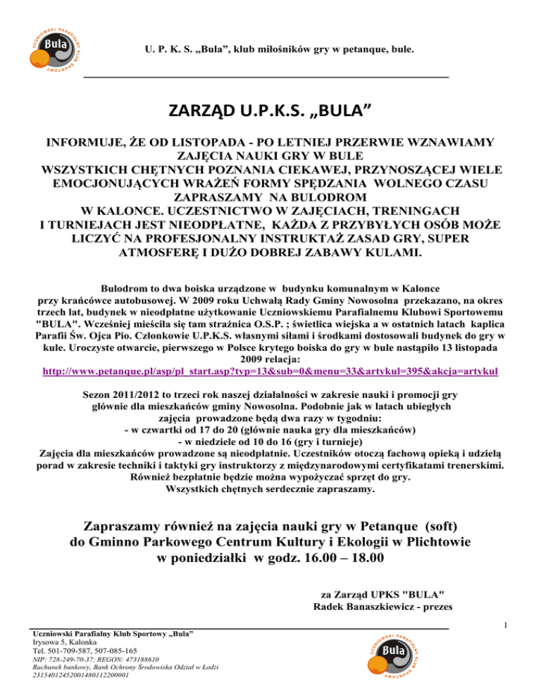 U. P. K. S. „Bula”, klub miłośników gry w petanque, bule. ZARZĄD U.P.K.S. „BULA” INFORMUJE, ŻE OD LISTOPADA - PO LETNIEJ PRZERWIE WZNAWIAMY ZAJĘCIA NAUKI GRY W BULE WSZYSTKICH CHĘTNYCH POZNANIA CIEKAWEJ, PRZYNOSZĄCEJ WIELE EMOCJONUJĄCYCH WRAŻEŃ FORMY SPĘDZANIA WOLNEGO CZASU ZAPRASZAMY NA BULODROM W KALONCE. UCZESTNICTWO W ZAJĘCIACH, TRENINGACH I TURNIEJACH JEST NIEODPŁATNE, KAŻDA Z PRZYBYŁYCH OSÓB MOŻE LICZYĆ NA PROFESJONALNY INSTRUKTAŻ ZASAD GRY, SUPER ATMOSFERĘ I DUŻO DOBREJ ZABAWY KULAMI. Bulodrom to dwa boiska urządzone w budynku komunalnym w Kalonce przy krańcówce autobusowej. W 2009 roku Uchwałą Rady Gminy Nowosolna przekazano, na okres trzech lat, budynek w nieodpłatne użytkowanie Uczniowskiemu Parafialnemu Klubowi Sportowemu "BULA". Wcześniej mieściła się tam strażnica O.S.P. ; świetlica wiejska a w ostatnich latach kaplica Parafii Św. Ojca Pio. Członkowie U.P.K.S. własnymi siłami i środkami dostosowali budynek do gry w kule. Uroczyste otwarcie, pierwszego w Polsce krytego boiska do gry w bule nastąpiło 13 listopada 2009 relacja: http://www.petanque.pl/asp/pl_start.asp?typ=13&sub=0&menu=33&artykul=395&akcja=artykul Sezon 2011/2012 to trzeci rok naszej działalności w zakresie nauki i promocji gry głównie dla mieszkańców gminy Nowosolna. Podobnie jak w latach ubiegłych zajęcia prowadzone będą dwa razy w tygodniu: - w czwartki od 17 do 20 (głównie nauka gry dla mieszkańców) - w niedziele od 10 do 16 (gry i turnieje) Zajęcia dla mieszkańców prowadzone są nieodpłatnie. Uczestników otoczą fachową opieką i udzielą porad w zakresie techniki i taktyki gry instruktorzy z międzynarodowymi certyfikatami trenerskimi. Również bezpłatnie będzie można wypożyczać sprzęt do gry. Wszystkich chętnych serdecznie zapraszamy. Zapraszamy również na zajęcia nauki gry w Petanque (soft) do Gminno Parkowego Centrum Kultury i Ekologii w Plichtowie w poniedziałki w godz. 16.00 – 18.00 za Zarząd UPKS "BULA" Radek Banaszkiewicz - prezes Uczniowski Parafialny Klub Sportowy „Bula” Irysowa 5, Kalonka Tel. 501-709-587, 507-085-165 NIP: 728-249-70-37; REGON: 473188610 Rachunek bankowy, Bank Ochrony Środowiska Odział w Łodzi 23154012452001480112200001 1