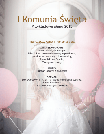 I Komunia Święta Przykładowe Menu 2015 PROPOZYCJA MENU I – 90,00 ZŁ / OS. DANIA SERWOWANE: Krem z białych warzyw Filet z kurczaka nadziewany szpinakiem, pomidorem suszonym i mozarellą, Ziemniaki Au Gratin, Warzywa z wody DESER: Puchar lodowy z owocami NAPOJE: Sok owocowy 0,5l/os. / Woda mineralna 0,5l/os. kawa i herbata tort we własnym zakresie PROPOZYCJA MENU II – 145,00 ZŁ / OS. DANIA SERWOWANE: Krem z pomidorów podany z grissini oraz łezką kwaśnej śmietany Polędwiczki wieprzowe w sosie z sera gorgonzola z ziemniakami opiekanymi i warzywami z wody PRZEKĄSKI ZIMNE NA STOLE: Deski mięs pieczonych Schab po warszawsku Deska serów Śledź w zalewie kurkowej Jaja faszerowane pastami Rostbef z suszonymi pomidorami Ruloniki z szynki z pastą serową SAŁATKI na stole: Grecka z serem feta Warszawska ze schabem i piklami Ze świeżego szpinaku, parmezanu i chrupiącego bekonu DODATKI Pieczywo/masło Sosy zimne do mięs Pikle/marynaty NAPOJE Woda mineralna 0,5l/os. soki owocowe 0,5l/os. Na bufecie: Ciasto Kawa i herbata Tort komunijny we własnym zakresie