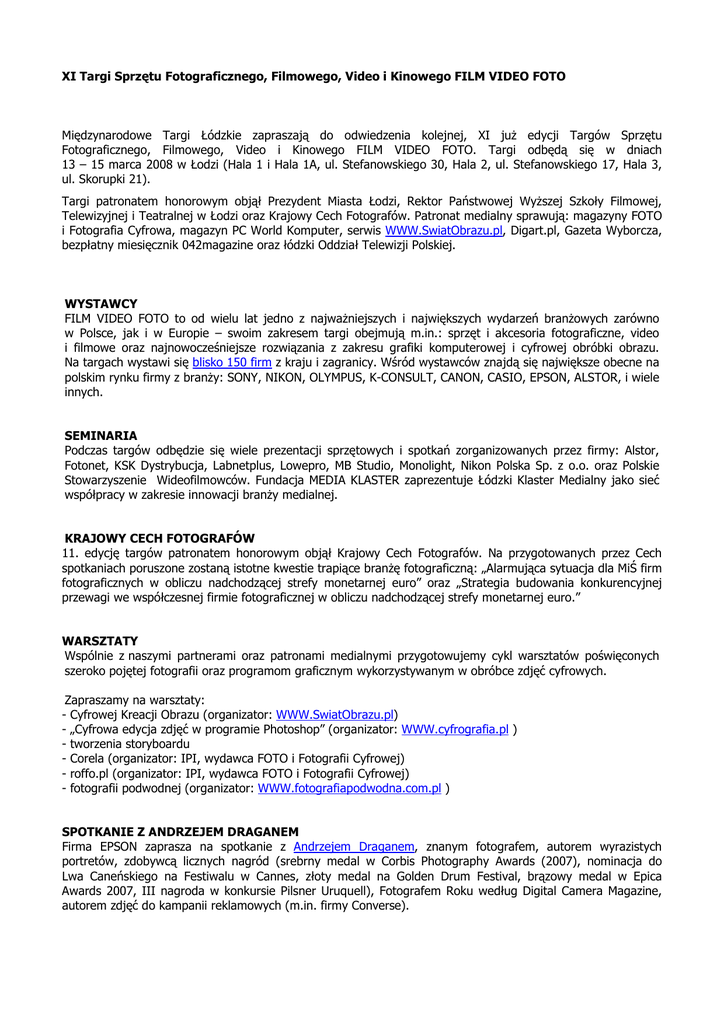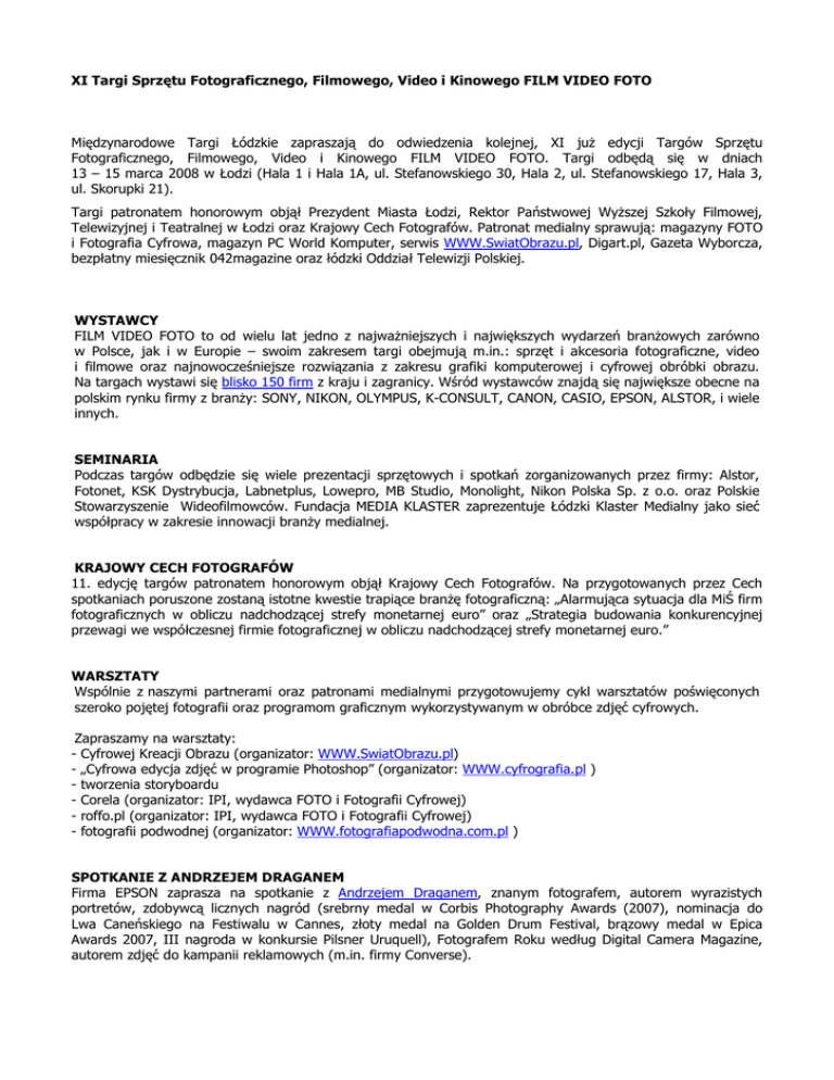 XI Targi Sprzętu Fotograficznego, Filmowego, Video i Kinowego FILM VIDEO FOTO Międzynarodowe Targi Łódzkie zapraszają do odwiedzenia kolejnej, XI juŜ edycji Targów Sprzętu Fotograficznego, Filmowego, Video i Kinowego FILM VIDEO FOTO. Targi odbędą się w dniach 13 – 15 marca 2008 w Łodzi (Hala 1 i Hala 1A, ul. Stefanowskiego 30, Hala 2, ul. Stefanowskiego 17, Hala 3, ul. Skorupki 21). Targi patronatem honorowym objął Prezydent Miasta Łodzi, Rektor Państwowej WyŜszej Szkoły Filmowej, Telewizyjnej i Teatralnej w Łodzi oraz Krajowy Cech Fotografów. Patronat medialny sprawują: magazyny FOTO i Fotografia Cyfrowa, magazyn PC World Komputer, serwis WWW.SwiatObrazu.pl, Digart.pl, Gazeta Wyborcza, bezpłatny miesięcznik 042magazine oraz łódzki Oddział Telewizji Polskiej. WYSTAWCY FILM VIDEO FOTO to od wielu lat jedno z najwaŜniejszych i największych wydarzeń branŜowych zarówno w Polsce, jak i w Europie – swoim zakresem targi obejmują m.in.: sprzęt i akcesoria fotograficzne, video i filmowe oraz najnowocześniejsze rozwiązania z zakresu grafiki komputerowej i cyfrowej obróbki obrazu. Na targach wystawi się blisko 150 firm z kraju i zagranicy. Wśród wystawców znajdą się największe obecne na polskim rynku firmy z branŜy: SONY, NIKON, OLYMPUS, K-CONSULT, CANON, CASIO, EPSON, ALSTOR, i wiele innych. SEMINARIA Podczas targów odbędzie się wiele prezentacji sprzętowych i spotkań zorganizowanych przez firmy: Alstor, Fotonet, KSK Dystrybucja, Labnetplus, Lowepro, MB Studio, Monolight, Nikon Polska Sp. z o.o. oraz Polskie Stowarzyszenie Wideofilmowców. Fundacja MEDIA KLASTER zaprezentuje Łódzki Klaster Medialny jako sieć współpracy w zakresie innowacji branŜy medialnej. KRAJOWY CECH FOTOGRAFÓW 11. edycję targów patronatem honorowym objął Krajowy Cech Fotografów. Na przygotowanych przez Cech spotkaniach poruszone zostaną istotne kwestie trapiące branŜę fotograficzną: „Alarmująca sytuacja dla MiŚ firm fotograficznych w obliczu nadchodzącej strefy monetarnej euro” oraz „Strategia budowania konkurencyjnej przewagi we współczesnej firmie fotograficznej w obliczu nadchodzącej strefy monetarnej euro.” WARSZTATY Wspólnie z naszymi partnerami oraz patronami medialnymi przygotowujemy cykl warsztatów poświęconych szeroko pojętej fotografii oraz programom graficznym wykorzystywanym w obróbce zdjęć cyfrowych. Zapraszamy na warsztaty: - Cyfrowej Kreacji Obrazu (organizator: WWW.SwiatObrazu.pl) - „Cyfrowa edycja zdjęć w programie Photoshop” (organizator: WWW.cyfrografia.pl ) - tworzenia storyboardu - Corela (organizator: IPI, wydawca FOTO i Fotografii Cyfrowej) - roffo.pl (organizator: IPI, wydawca FOTO i Fotografii Cyfrowej) - fotografii podwodnej (organizator: WWW.fotografiapodwodna.com.pl ) SPOTKANIE Z ANDRZEJEM DRAGANEM Firma EPSON zaprasza na spotkanie z Andrzejem Draganem, znanym fotografem, autorem wyrazistych portretów, zdobywcą licznych nagród (srebrny medal w Corbis Photography Awards (2007), nominacja do Lwa Caneńskiego na Festiwalu w Cannes, złoty medal na Golden Drum Festival, brązowy medal w Epica Awards 2007, III nagroda w konkursie Pilsner Uruquell), Fotografem Roku według Digital Camera Magazine, autorem zdjęć do kampanii reklamowych (m.in. firmy Converse). WYSTAWY • PhotoFairGallery – cykl wystaw artystów zorganizowany przez Fundację Edukacji Wizualnej. Zwiedzający będą mogli obejrzeć wystawy prezentujące egzotyczną rzeczywistość Chin, które stanowią zapowiedź tegorocznego Fotofestiwalu. Zdjęcia nowozelandzkiego artysty Harvey'a Benge'a stanowią część projektu zatytułowanego „Western Eye on East” - zbiorowej wystawy artystów Zachodu, którzy zafascynowani Chinami postanowili szukać inspiracji w tamtej rzeczywistości. Druga wystawa to przegląd najnowszych zjawisk w chińskiej fotografii: Liu LiJie i Peng Xiangjie. Ich prace będzie moŜna zobaczyć podczas Photo Fair Gallery jako zapowiedź fotofestiwalowej wystawy „China Foto”. • wystawa pokonkursowa MAGIC HOUR • „Z ARCHIWUM X “ Marka Arcimowicza (organizator: F – System sp. z o.o., wyłączny dystrybutor marki Lowepro) • ŚWIAT W OBIEKTYWACH SIGMA Jacka Kudłatego i Mateusza Moskalika (organizator: K-Consult Sp. z o.o.) • studentów Państwowej WyŜszej Szkoły Filmowej, Telewizyjnej i Teatralnej w Łodzi • OBLICZA ŁODZI – wystawa laureatów XI edycji konkursu (organizator: Bałucki Ośrodek Kultury RONDO) KONKURS FOTOGRAFICZNY „MAGIC HOUR” Po raz pierwszy targom FILM VIDEO FOTO towarzyszył konkurs fotograficzny MAGIC HOUR, skierowany do osób zajmujących się fotografią w sposób amatorski i profesjonalny. Nagrodzone przez jury dwa cykle oraz trzy pierwsze miejsca w kategorii zdjęć pojedynczych zostaną pokazane podczas targów. Współorganizatorem konkursu jest Fundacja Edukacji Wizualnej, sponsorami: EPSON, Lexar, Sigma, Lowepro, SONY. Patronują mu: FOTO, Fotografia Cyfrowa oraz 042magazine. KONKURS ŁÓDŹ – MAGIC PLACE Serwis videolodz.com ogłosił przy okazji targów konkurs na najciekawszy film o magicznej Łodzi „ŁÓDŹ – MAGIC PLACE”. Nagrodą jest Nokia N 95 – nowoczesny telefon komórkowy z funkcją nagrywania filmów wideo. Zwycięzcę II edycji konkursu poznamy 13 marca na uroczystości otwarcia targów. KONKURS O MEDAL TARGÓW FILM VIDEO FOTO Tradycyjnie targom towarzyszy konkurs o Medal FILM VIDEO FOTO za najlepsze produkty prezentowane na targach. Do konkursu zgłoszono 58 produktów: 47 w kategorii FOTO i 11 w kategorii WIDEO. Rozstrzygnięcie konkursu nastąpi podczas uroczystego bankietu kończącego pierwszy dzień targów. Jedenasta edycja targów FILM VIDEO FOTO przynosi istotną zmianę w formule targów. Kierując się licznymi sugestiami wystawców pierwszy dzień targów (13.03) przeznaczyliśmy wyłącznie dla profesjonalistów na spotkania w konwencji B2B. W dniu dla profesjonalistów targi będzie moŜna zwiedzać na podstawie: - zaproszeń - kart