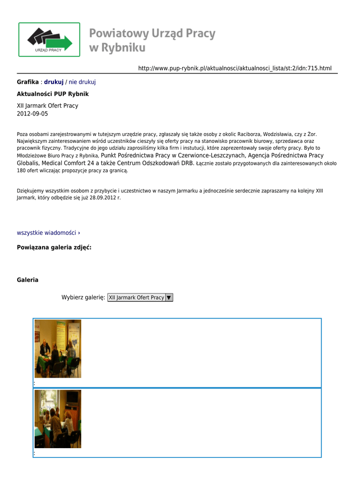http://www.pup-rybnik.pl/aktualnosci/aktualnosci_lista/st:2/idn:715.html Grafika : drukuj / nie drukuj Aktualności PUP Rybnik XII Jarmark Ofert Pracy 2012-09-05 Poza osobami zarejestrowanymi w tutejszym urzędzie pracy, zgłaszały się także osoby z okolic Raciborza, Wodzisławia, czy z Żor. Największym zainteresowaniem wśród uczestników cieszyły się oferty pracy na stanowisko pracownik biurowy, sprzedawca oraz pracownik fizyczny. Tradycyjne do jego udziału zaprosiliśmy kilka firm i instutucji, które zaprezentowały swoje oferty pracy. Było to Młodzieżowe Biuro Pracy z Rybnika, Punkt Pośrednictwa Pracy w Czerwionce-Leszczynach, Agencja Pośrednictwa Pracy Globalis, Medical Comfort 24 a także Centrum Odszkodowań DRB. Łącznie zostało przygotowanych dla zainteresowanych około 180 ofert wliczając propozycje pracy za granicą. Dziękujemy wszystkim osobom z przybycie i uczestnictwo w naszym Jarmarku a jednocześnie serdecznie zapraszamy na kolejny XIII Jarmark, który odbędzie się już 28.09.2012 r. wszystkie wiadomości › Powiązana galeria zdjęć: Galeria Wybierz galerię: XII Jarmark Ofert Pracy ▼ : : : : : : : : :