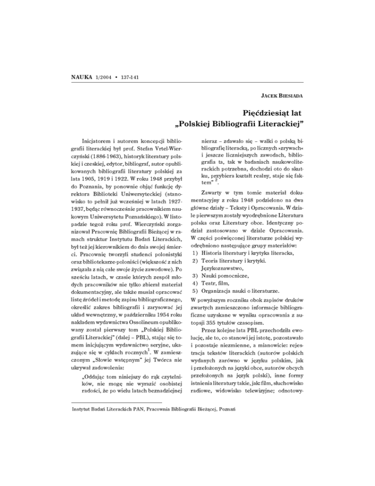 NAUKA 1/2004 • 137-141 JACEK BIESIADA Pięćdziesiąt lat „Polskiej Bibliografii Literackiej” Inicjatorem i autorem koncepcji bibliografii literackiej był prof. Stefan Vrtel-Wierczyński (1886-1963), historyk literatury polskiej i czeskiej, edytor, bibliograf, autor opublikowanych bibliografii literatury polskiej za lata 1905, 1919 i 1922. W roku 1948 przybył do Poznania, by ponownie objąć funkcję dyrektora Biblioteki Uniwersyteckiej (stanowisko to pełnił już wcześniej w latach 19271937, będąc równocześnie pracownikiem naukowym Uniwersytetu Poznańskiego). W listopadzie tegoż roku prof. Wierczyński zorganizował Pracownię Bibliografii Bieżącej w ramach struktur Instytutu Badań Literackich, był też jej kierownikiem do dnia swojej śmierci. Pracownię tworzyli studenci polonistyki oraz bibliotekarze-poloniści (większość z nich związała z nią całe swoje życie zawodowe). Po sześciu latach, w czasie których zespół młodych pracowników nie tylko zbierał materiał dokumentacyjny, ale także musiał opracować listę źródeł i metodę zapisu bibliograficznego, określić zakres bibliografii i zarysować jej układ wewnętrzny, w październiku 1954 roku nakładem wydawnictwa Ossolineum opublikowany został pierwszy tom „Polskiej Bibliografii Literackiej” (dalej – PBL), stając się tomem inicjującym wydawnictwo seryjne, ukazujące się w cyklach rocznych1. W zamieszczonym „Słowie wstępnym” jej Twórca nie ukrywał zadowolenia: „Oddając tom niniejszy do rąk czytelników, nie mogę nie wyrazić osobistej radości, że po wielu latach beznadziejnej nieraz – zdawało się – walki o polską bibliografię literacką, po licznych »zrywach« i jeszcze liczniejszych zawodach, bibliografia ta, tak w badaniach naukowoliterackich potrzebna, dochodzi oto do skutku, przybiera kształt realny, staje się faktem” 2. Zawarty w tym tomie materiał dokumentacyjny z roku 1948 podzielono na dwa główne działy – Teksty i Opracowania. W dziale pierwszym zostały wyodrębnione Literatura polska oraz Literatury obce. Identyczny podział zastosowano w dziale Opracowania. W części poświęconej literaturze polskiej wyodrębniono następujące grupy materiałów: 1) Historia literatury i krytyka literacka, 2) Teoria literatury i krytyki. Językoznawstwo, 3) Nauki pomocnicze, 4) Teatr, film, 5) Organizacja nauki o literaturze. W powyższym roczniku obok zapisów druków zwartych zamieszczono informacje bibliograficzne uzyskane w wyniku opracowania z autopsji 355 tytułów czasopism. Przez kolejne lata PBL przechodziła ewolucję, ale to, co stanowi jej istotę, pozostawało i pozostaje niezmienne, a mianowicie: rejestracja tekstów literackich (autorów polskich wydanych zarówno w języku polskim, jak i przełożonych na języki obce, autorów obcych przełożonych na język polski), inne formy istnienia literatury takie, jak: film, słuchowisko radiowe, widowisko telewizyjne; odnotowy- Instytut Badań Literackich PAN, Pracownia Bibliografii Bieżącej, Poznań 138 Jacek Biesiada wanie opracowań dotyczących zagadnień znajdujących się w obszarze zainteresowań bibliografii; sporządzanie z autopsji opisów bibliograficznych uwzględniających druki zwarte, materiały z czasopism polskich – krajowych i emigracyjnych oraz zagranicznych o profilu slawistycznym. Dokonany w tomie za rok 1968 podział bibliografii na cztery zasadnicze części jest stosowany do dziś: I. Teoria literatury, II. Literatura polska, III. Literatury obce, IV. Teatr, film, radio, telewizja. W części I czytelnik znajdzie materiały dotyczące metodologii badań literackich, teorii procesu historycznoliterackiego, teorii dzieła literackiego, teorii krytyki literackiej, psychologii i socjologii literatury, zagadnień przekładu literackiego oraz związków literatury z innymi sztukami. Kilka działów składa się na część II. Blok zapisów z zakresu historii literatury jest podzielony na okresy literackie, a literatury współczesnej – na podstawowe gatunki: dramat, krytykę, poezję, prozę. W sposób szczególny wyodrębniają autorzy bibliografii życie literackie, dokonując prezentacji tworzących je zjawisk w sposób precyzyjny, nierzadko z elementami kroniki. Odbiorca ma możliwość m.in. poznać nazwiska laureatów konkursów, nagród i plebiscytów, uzyskać źródła wiadomości o związkach twórczych, imprezach literackich w poszczególnych ośrodkach, wreszcie o polskim życiu literackim poza granicami kraju. Informacje o pracach badawczych z zakresu literatury ludowej, regionalnej i popularnej oraz literatury dla dzieci i młodzieży, o pracach poświęconych motywom i tematom literackim oraz pamiętnikarstwu zawarte są w dziale Zagadnienia specjalne, gdzie można również znaleźć np. tytuły słowników pisarzy i literackich prac bibliograficznych. Informacje o habilitacjach i nominacjach profesorskich w zakresie filologii polskiej i obcej, doktoratach honoris causa, nazwiska laureatów konkursów i nagród naukowych napotka czytelnik w dziale Organizacja nauki o literaturze. Tu również można zapoznać się z materiałami o stanie filologii polskiej w kraju i za granicą, filologiach obcych w Polsce, a także o działalności towarzystw naukowych w zakresie nauki o literaturze. Metodycy nauczania literatury polskiej i nauczyciele języka polskiego powinni być zainteresowani zawartością działu Dydaktyka literatury, gdzie oprócz materiałów o charakterze historycznym zgromadzono informacje o pracach z zakresu współczesnej metodyki nauczania tego przedmiotu; w końcowej części tego działu zamieszczone są zapisy dotyczące dydaktyki literatury w szkole wyższej. Adresy bibliograficzne utworów anonimowych, ludowych i ulotnych oraz wykaz antologii literackich odnajdzie czytelnik w ostatnim dziale tej części – Hasłach szczegółowych, wśród których są też hasła osobowe, stanowiące największą objętościowo część bibliograf